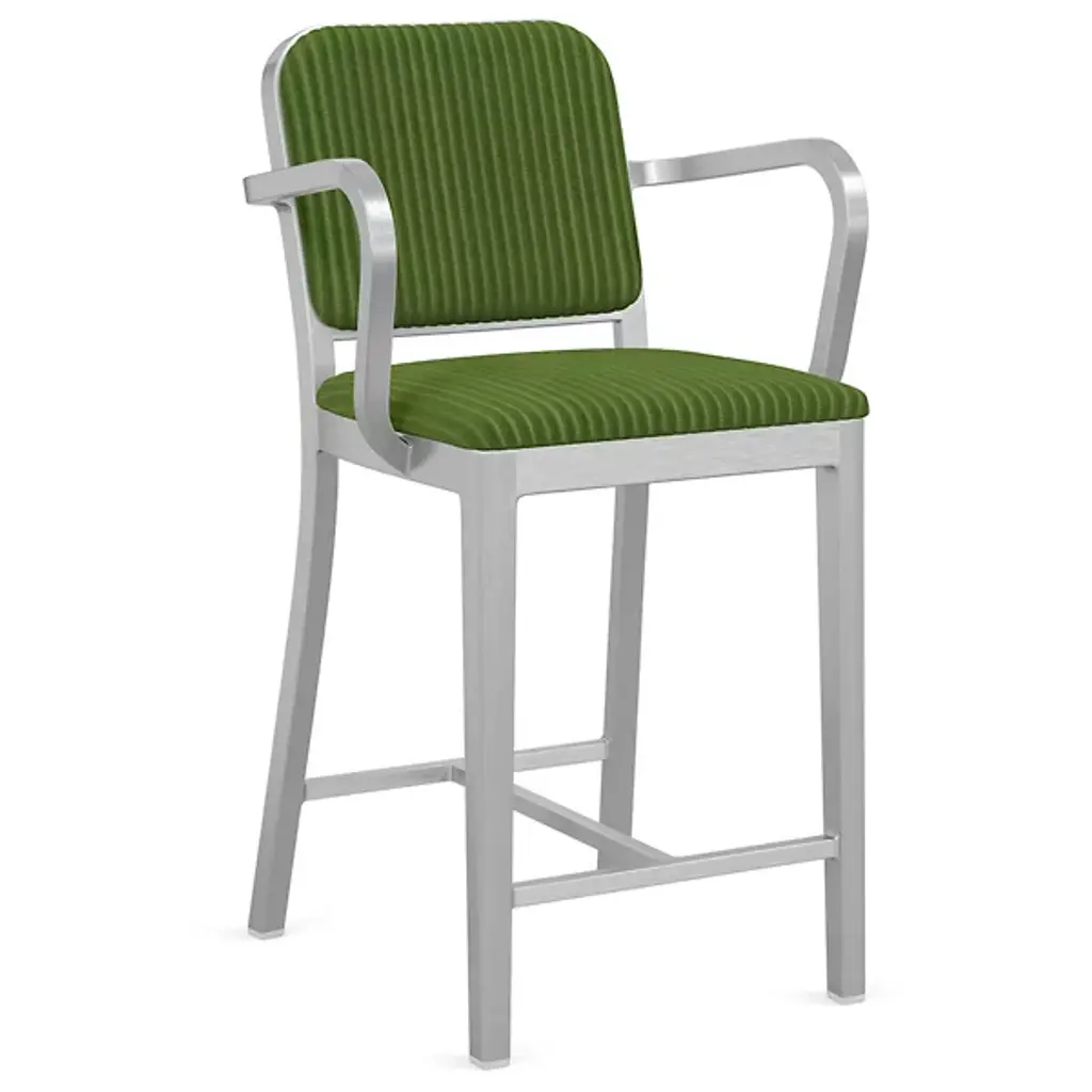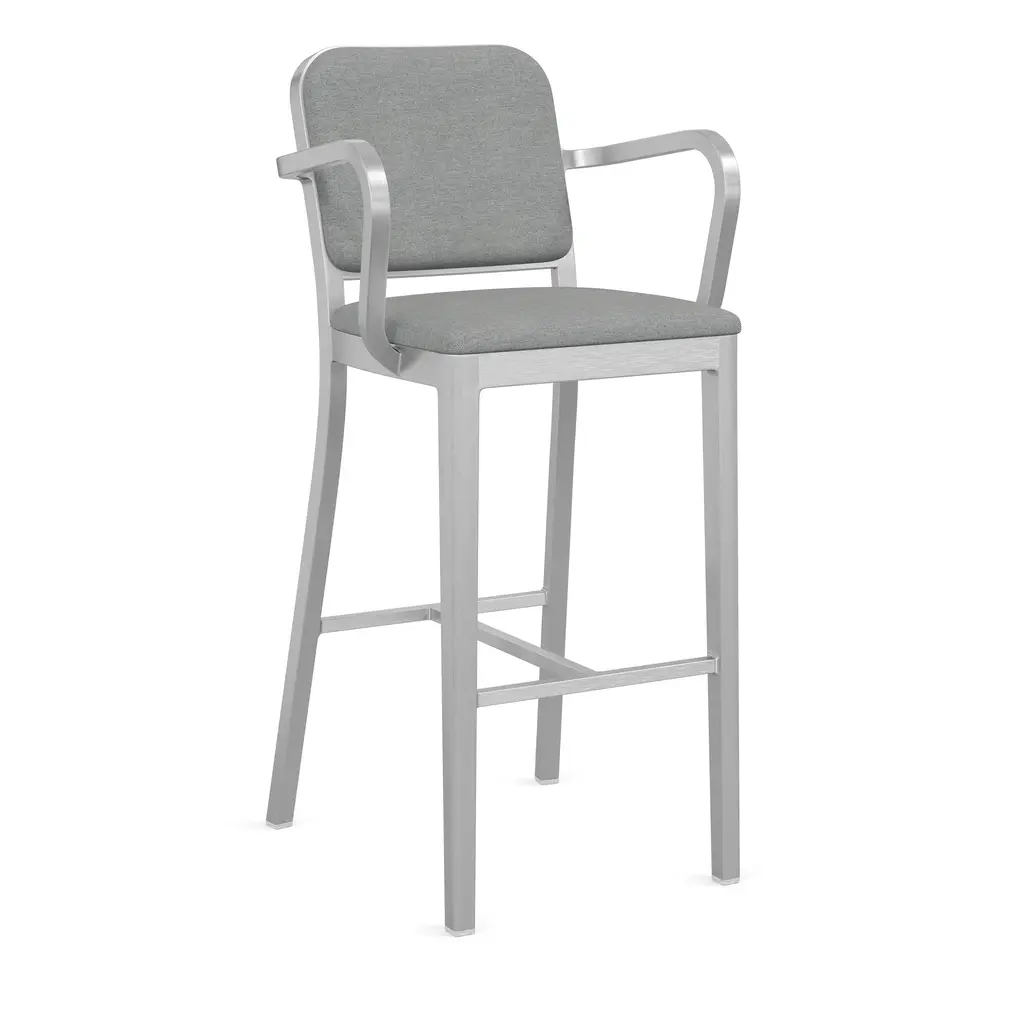 Enhance your indoor seating experience with the Navy Officer Stool with Arms from Emeco. Designed by Jasper Morrison, this modern update to Emeco's classic collection offers comfort and style with a hand-brushed aluminum or black powder coat finish and rich fabric and leather upholstery options. Crafted from recycled aluminum, this durable dining stool is built to last. Highlights