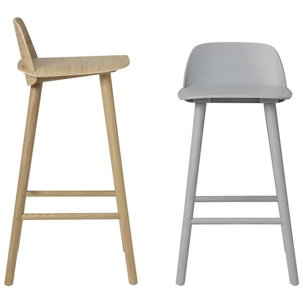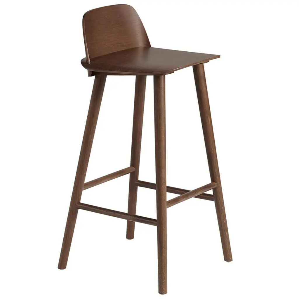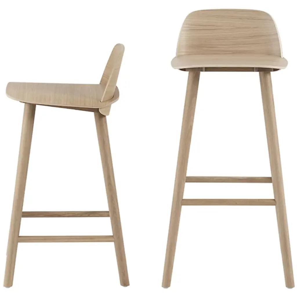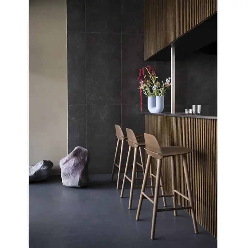 Bring a sleek Scandanavian presence to your tall tables or breakfast bars with the Nerd Stool from Muuto. An elegant wooden chair that rises from four tapering legs, each braced by a horizontal crossbar, it uses a smooth convex seat accented by a short, slightly angled back to provide steady, comfortable seating. The seat sits atop a set of plastic glides allowing easy repositioning, while its subdued, stylish design ensures it does not overpower its surroundings.