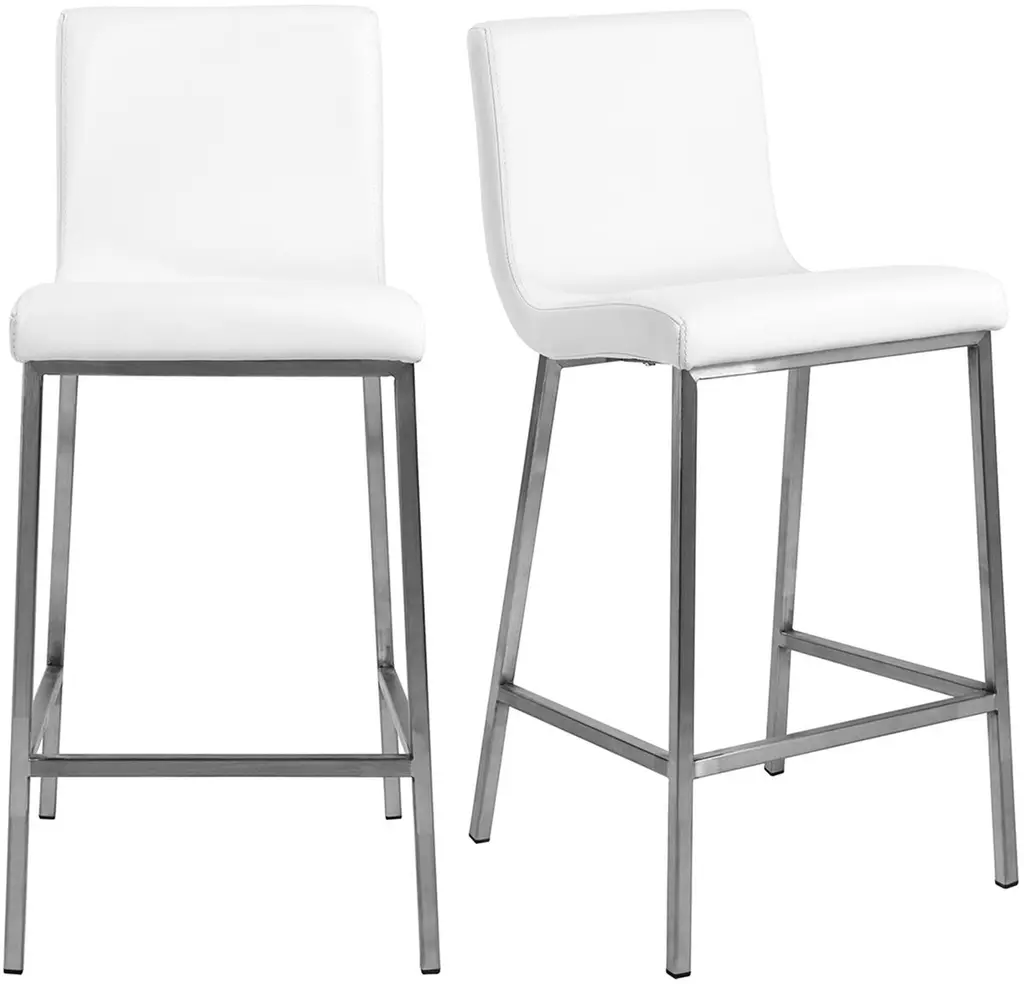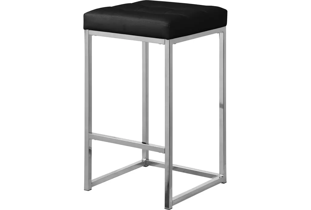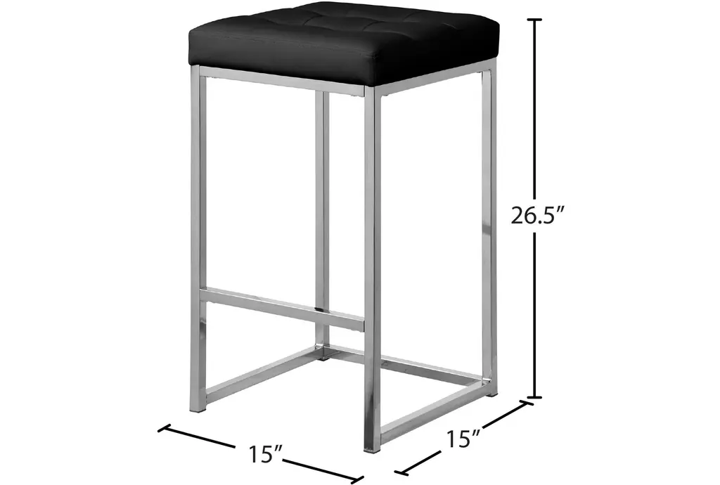 The Nicola Black Vegan Faux Leather Upholstered Stool with Chrome Finish Set of 2 brings modern style to your dining room or kitchen. With vegan leather upholstery and foam cushioning, these stools offer both comfort and durability. The chrome finish on the sled base adds a contemporary touch to any space.