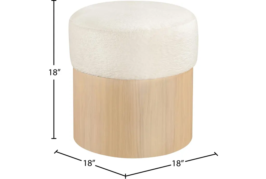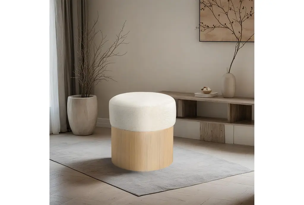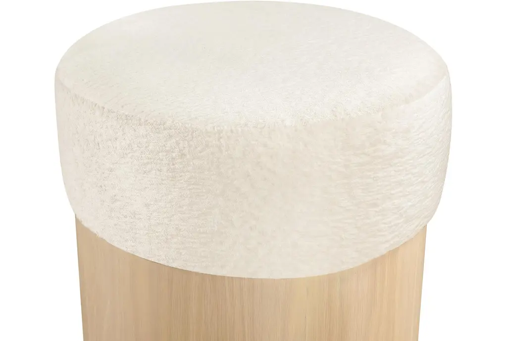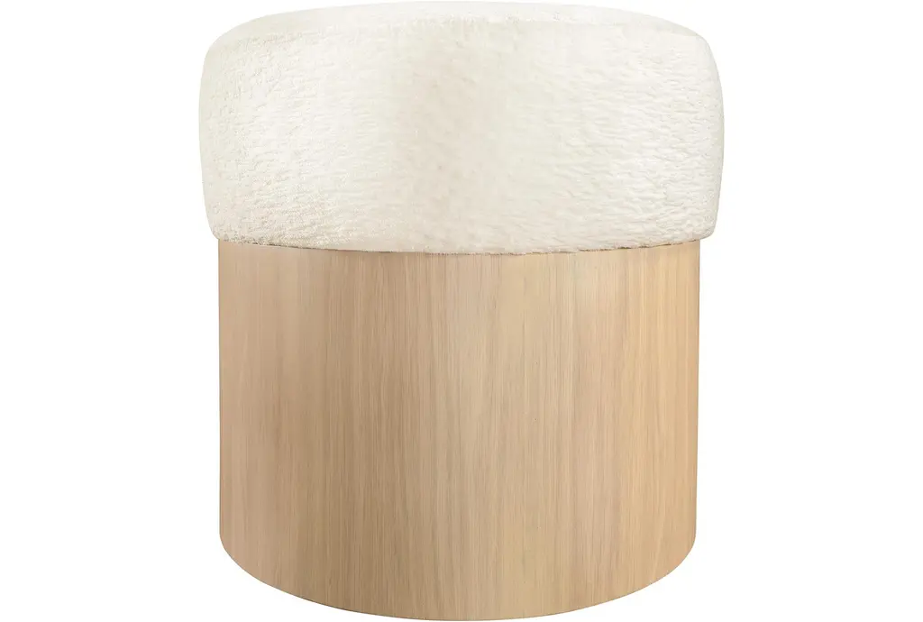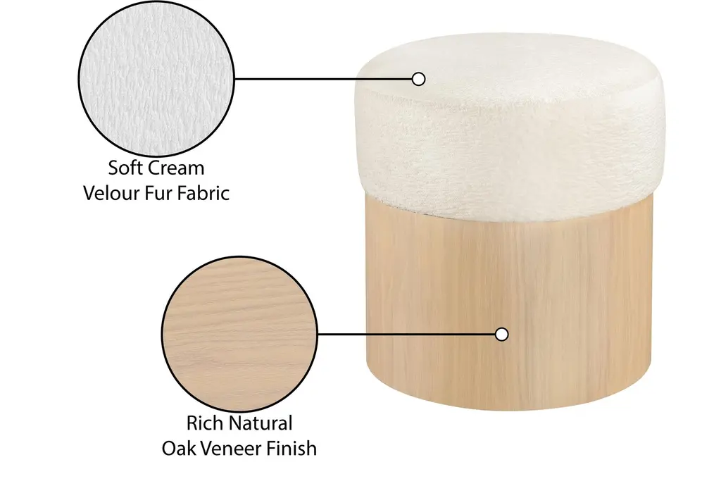 The Nimes Cream Velour Fur Fabric Ottoman/Stool combines comfort and functionality for your living space. This round ottoman/stool features a soft cream velour fur fabric top, providing a plush seating experience. The sturdy base is crafted from oak veneer, plywood, and MDF, ensuring durability and stability.