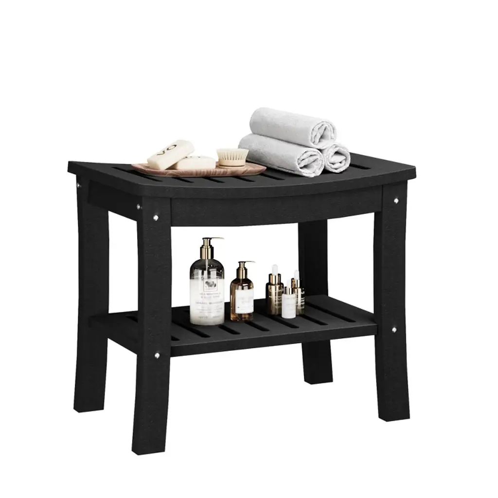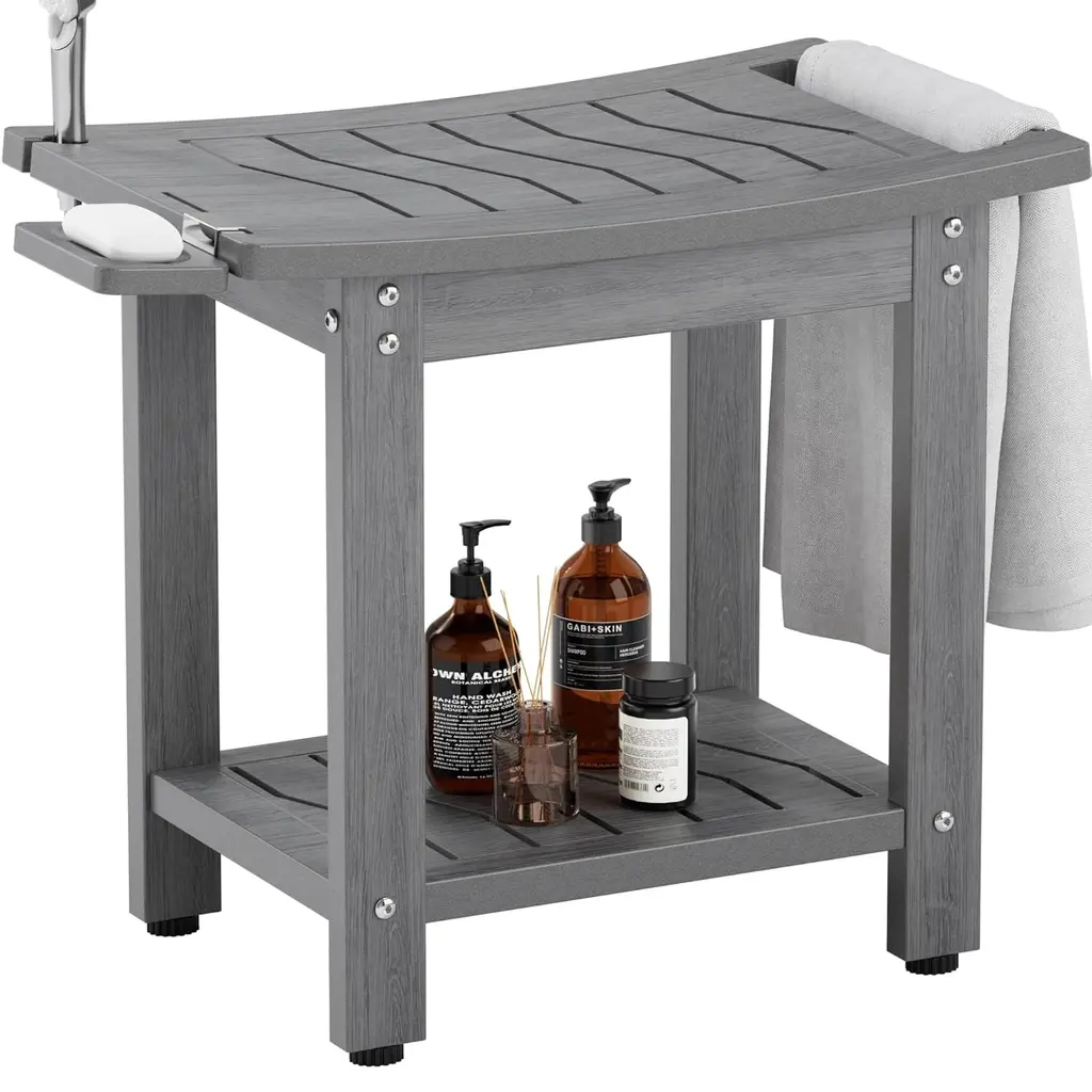 HDPE Material : Our shower bench from high-density polyethylene (HDPE),The shower bench boasts a natural wood-like appearance with a smooth,grainy texture.HDPE ensures exceptional water,weather,scratch,and stain resistance,providing a durable and maintenance-free alternative to traditional wood seats without the risk of swelling,warping,splintering,or discoloration.Waterproof & Easy to Clean : Shower stool is made of HDPE material,which looks like real wood but without the hassle of swell,warp,splinters,and discoloration,just simply wipe off any buildup with a sponge.Bathroom Bench with Shelf : Designed with a storage rack under the shower bench seat,providing ample space for bath items and place bathing towels. Ensuring your shower head holder & essentials are within easy reach while you enjoy a relaxing shower.Easy to Assemble : The shower stool comes with the written assembly instructions and accessories bag,and no skills to put together—just follow the included instructions.Versatile Multi-Purpose Use : This multi-purpose shower bench can serve as a versatile stool,corner bathroom seat,shower stool and bench,leg shaving shower bench,bathtub seat shelf,and shoe bench. The bathroom bench can be placed in any location you require,such as in a touring car,bathroom,living room,doorway,or bedroom.