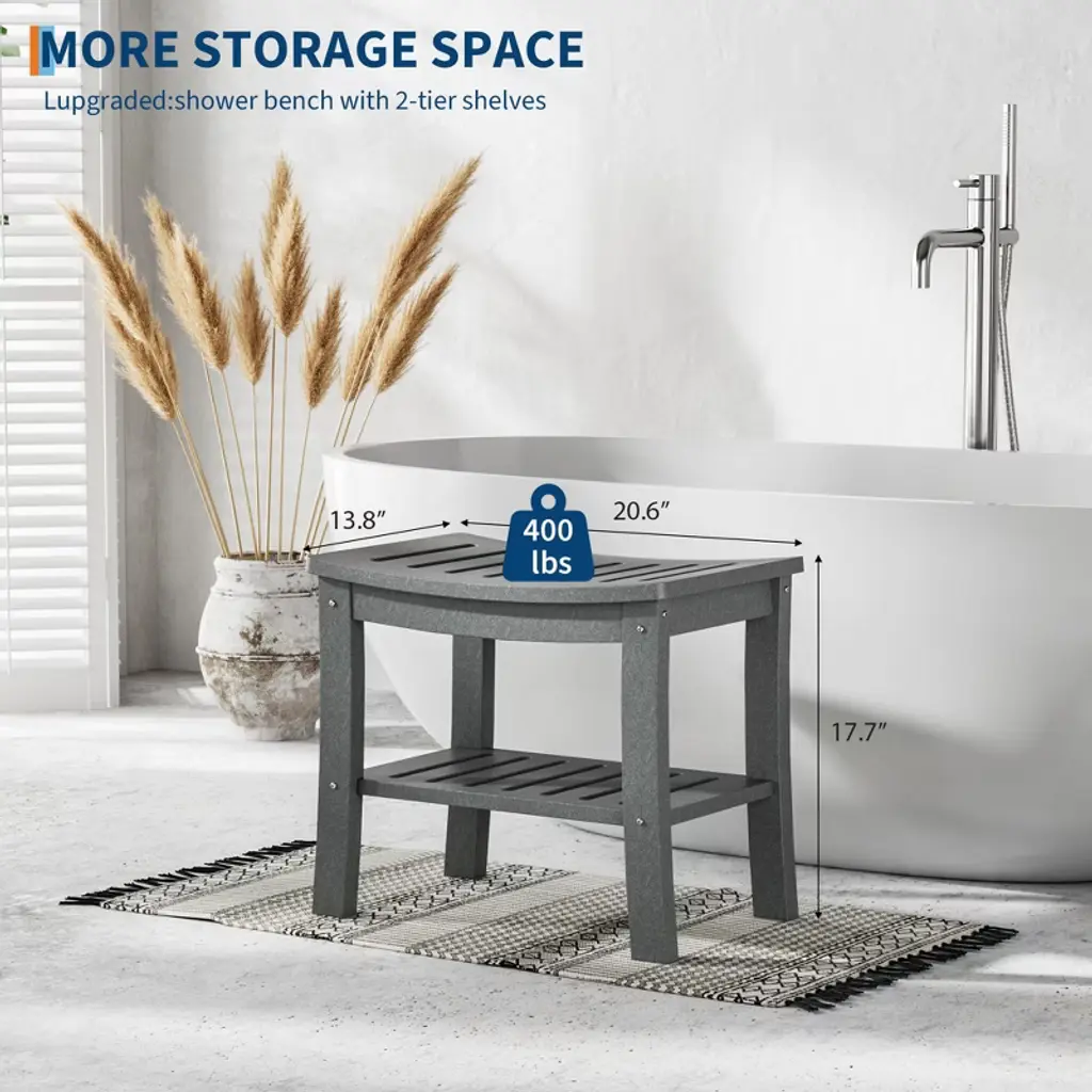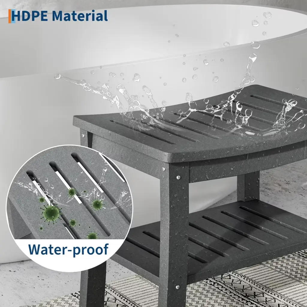 HDPE Material : Our shower bench from high-density polyethylene (HDPE),The shower bench boasts a natural wood-like appearance with a smooth,grainy texture.HDPE ensures exceptional water,weather,scratch,and stain resistance,providing a durable and maintenance-free alternative to traditional wood seats without the risk of swelling,warping,splintering,or discoloration.Waterproof & Easy to Clean : Shower stool is made of HDPE material,which looks like real wood but without the hassle of swell,warp,splinters,and discoloration,just simply wipe off any buildup with a sponge.Bathroom Bench with Shelf : Designed with a storage rack under the shower bench seat,providing ample space for bath items and place bathing towels. Ensuring your shower head holder & essentials are within easy reach while you enjoy a relaxing shower.Easy to Assemble : The shower stool comes with the written assembly instructions and accessories bag,and no skills to put together—just follow the included instructions.Versatile Multi-Purpose Use : This multi-purpose shower bench can serve as a versatile stool,corner bathroom seat,shower stool and bench,leg shaving shower bench,bathtub seat shelf,and shoe bench. The bathroom bench can be placed in any location you require,such as in a touring car,bathroom,living room,doorway,or bedroom.