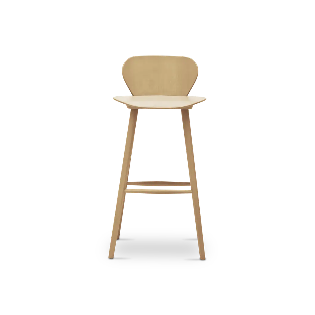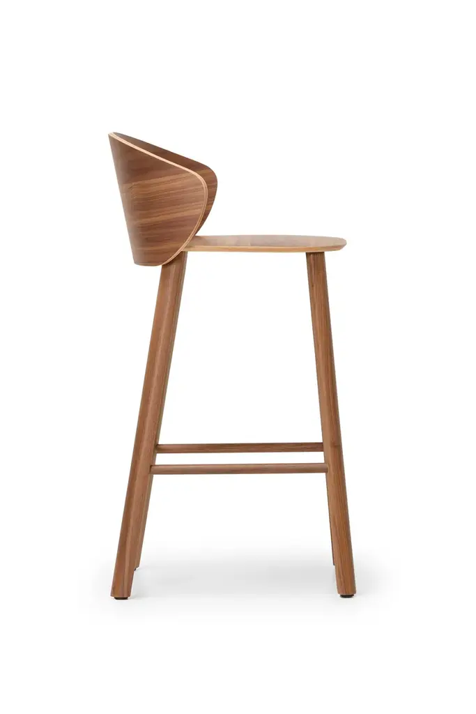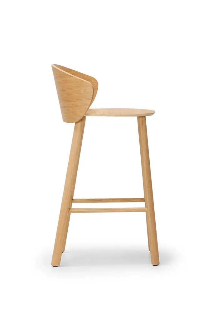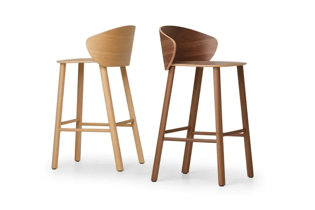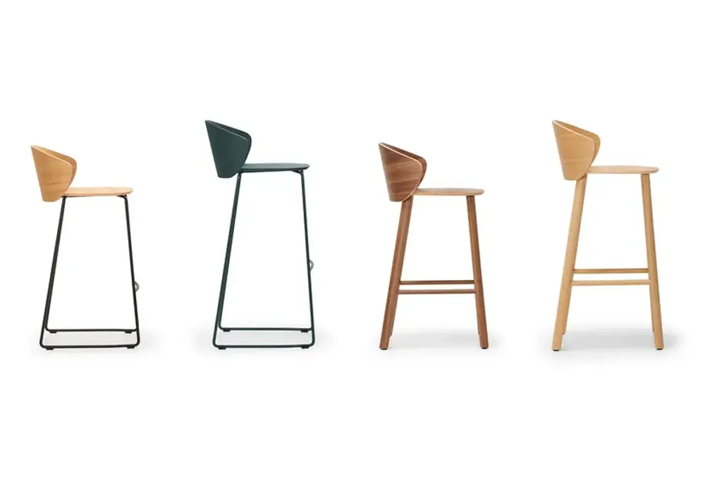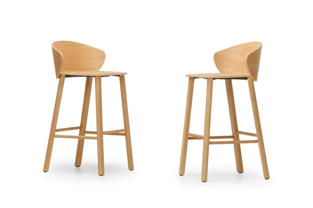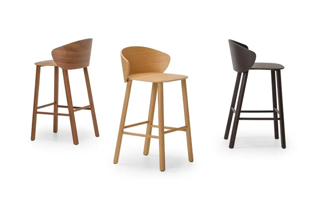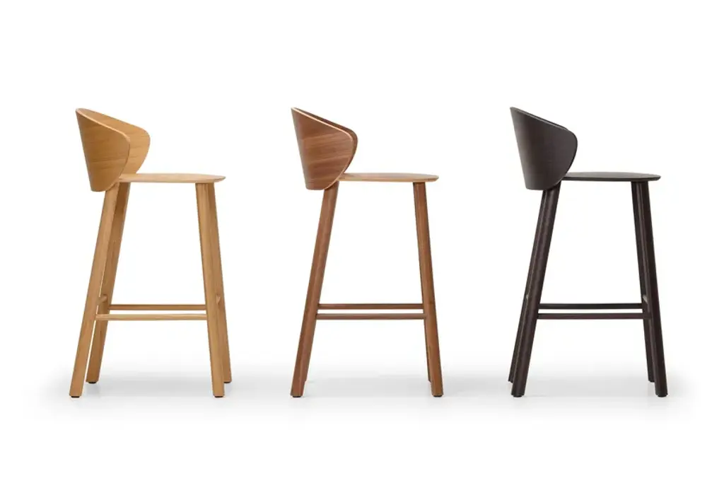 Not Wood is a high stool with backrest and footrest made of beech wood with variable section, ash, oak or walnut finish.From the success of the NOT family of upholstered armchairs comes the new compact and light version characterized by a curved wooden shell with variable thickness. Available in many finishes: from oak to walnut, from ash to wenge, and in different versions: with tubular metal legs, sled base in steel rod or with solid wood legs. It is stackable, can be upholstered in the front and can be placed in hospitality, catering and community environments.
