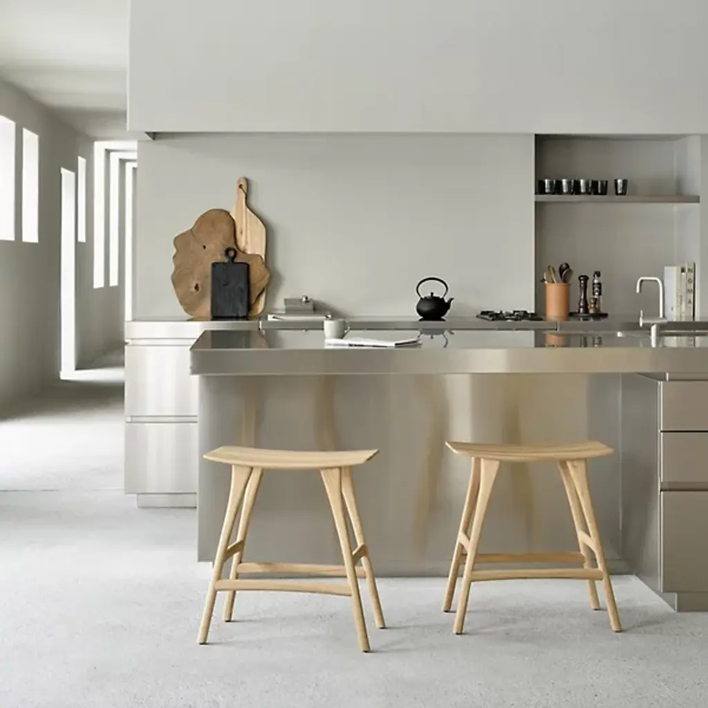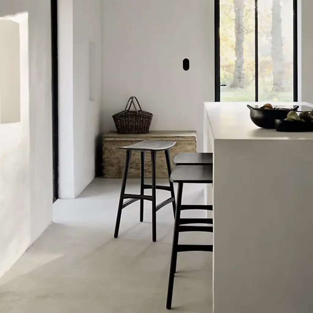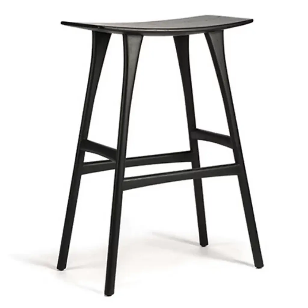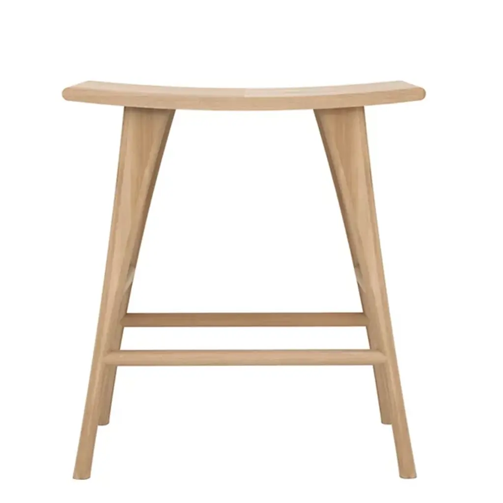 The Osso Stool by Ethnicraft is an elegant addition to spaces. The perfect height to pull up to a bar, the graceful curve of this seat offers a comfortable spot to sit while showcasing the beauty of oak wood. Also, the ideal height for standing desks, the tailored, tapered nature of the legs supporting this stool, and crossbars on each side make this a sleek, handsome choice to complete a room.