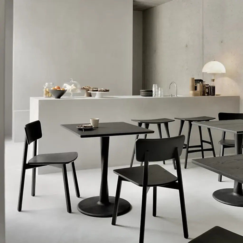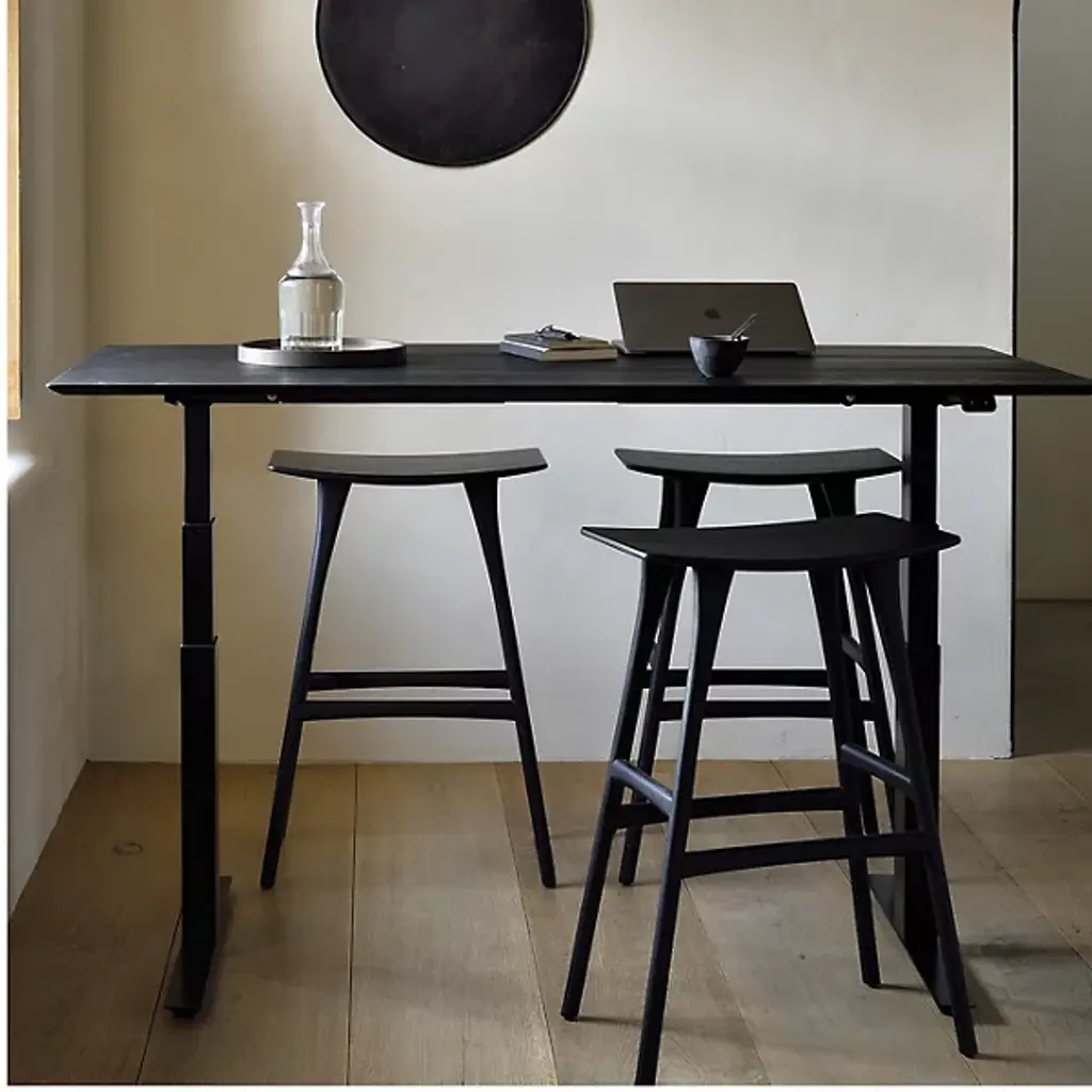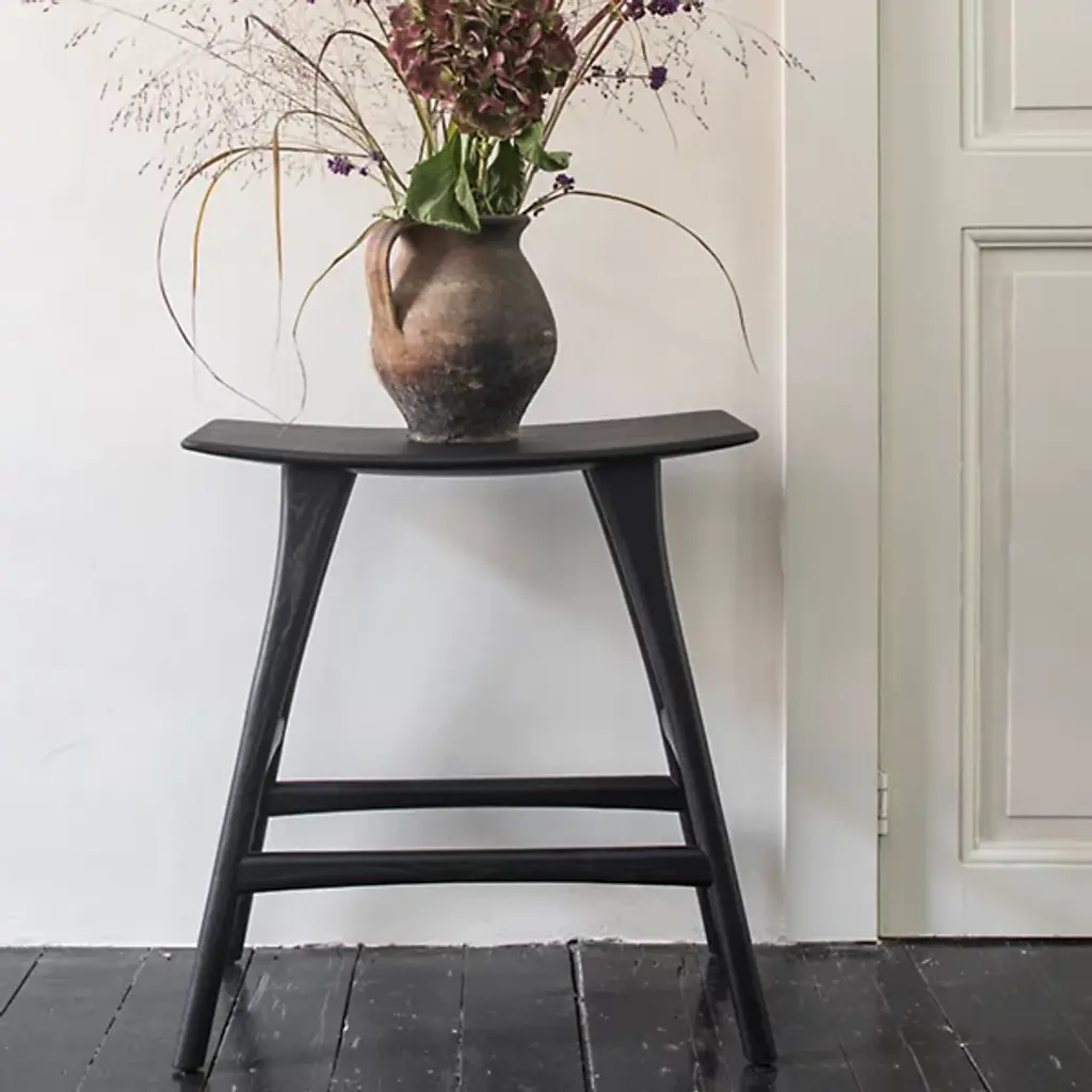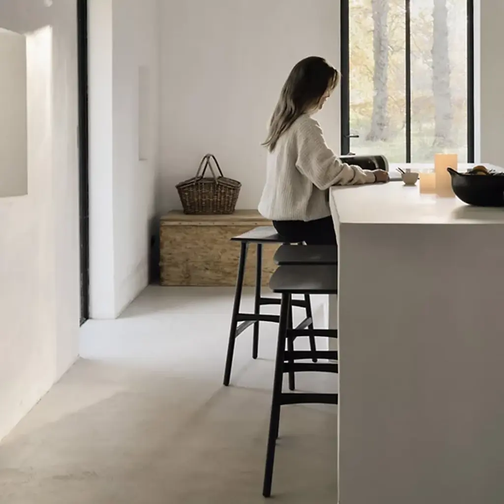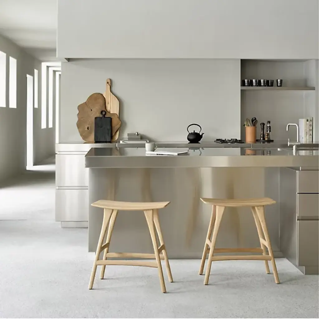 The Osso Stool by Ethnicraft is an elegant addition to spaces. The perfect height to pull up to a bar, the graceful curve of this seat offers a comfortable spot to sit while showcasing the beauty of oak wood. Also, the ideal height for standing desks, the tailored, tapered nature of the legs supporting this stool, and crossbars on each side make this a sleek, handsome choice to complete a room.