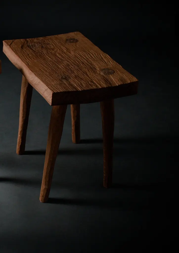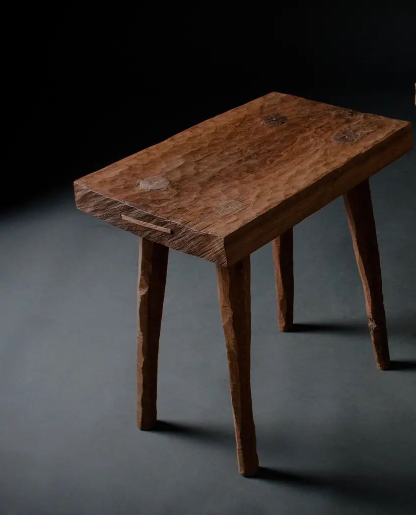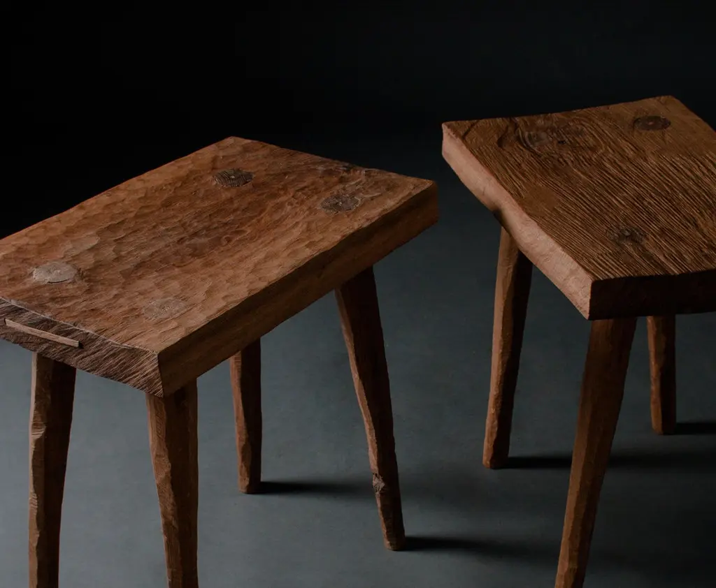 Stools made of solid oak (+ linseed oil)Measures: 45 x 41 x 36 cm.SÓHA design studio conceives and produces furniture design and decorative objects in solid oak in an authentic style. Inspiration to create all these items comes from the Russian North aesthetics with its severe nature, log huts black from time and climate and scant patterns. Wood is masterfully hand processed with chainsaw or chisel, whereby producing beautiful surface patterns. The wood is soaked in boiling baths of linseed oil, creating this special patina and making each creation a very unique piece. Reacting with tanning substances under high temperature, oil gives the objects expressive and natural colours, from light brown to charcoal-black. SÓHA offers a vast array of neo-primitivist interior objects. Our kitchen utensil, wall panels, sculptures and furniture solutions are executed in one unique style and will organically fit into the interior of your home. Each piece is one-of-a-kind handmade product.Sold individually. Unique piece made to order.