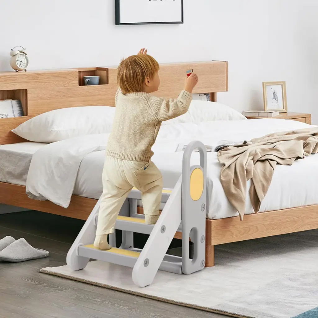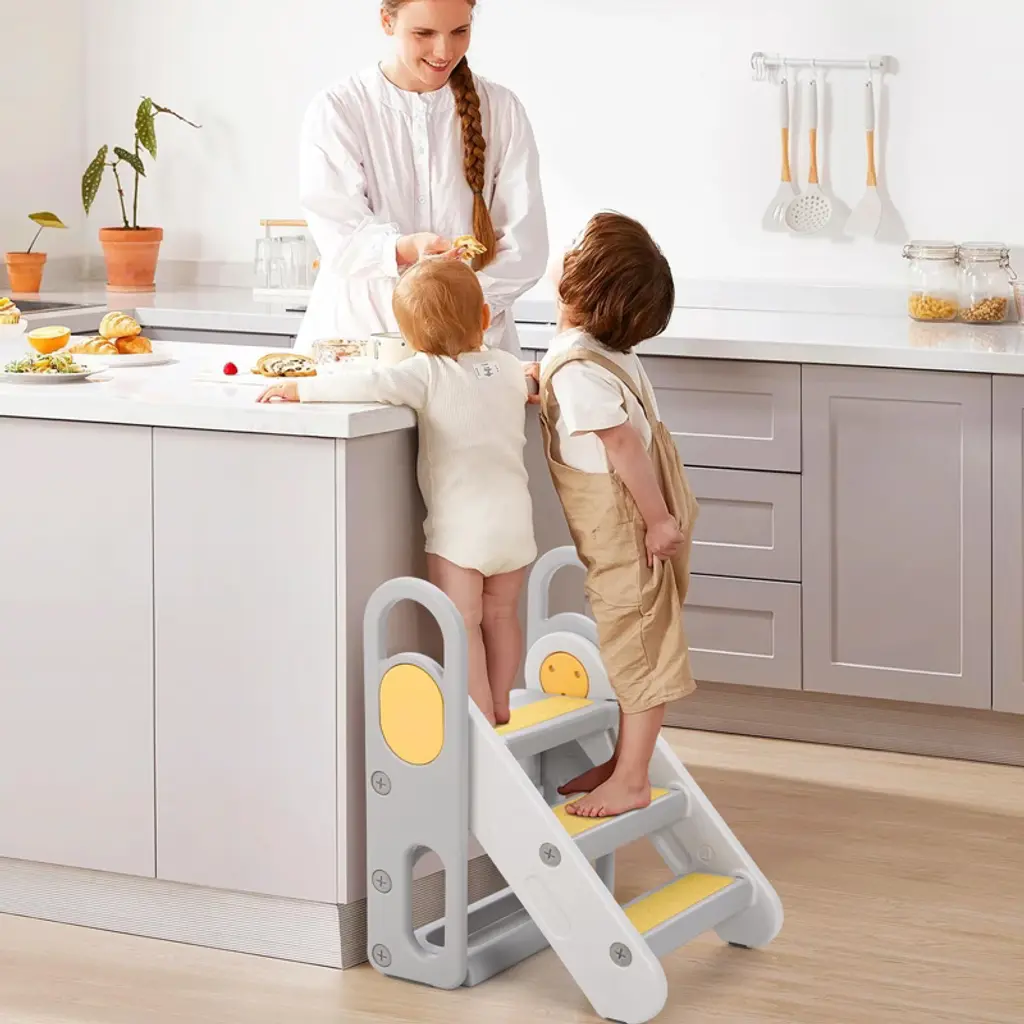 Perfect for Your Kids: This toddler step stool combines innovative design, convenience, and safety features to meet children's diverse needs. Made from BPA-free PP materials and featuring large, comfortable handrails, this folding toddler standing tower is the ideal choice for parents prioritizing their child's safety and independence