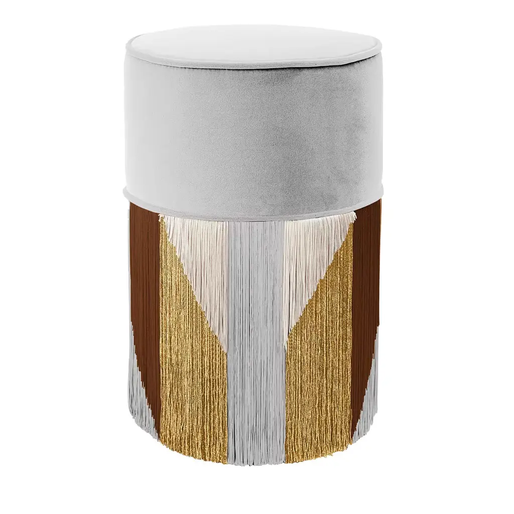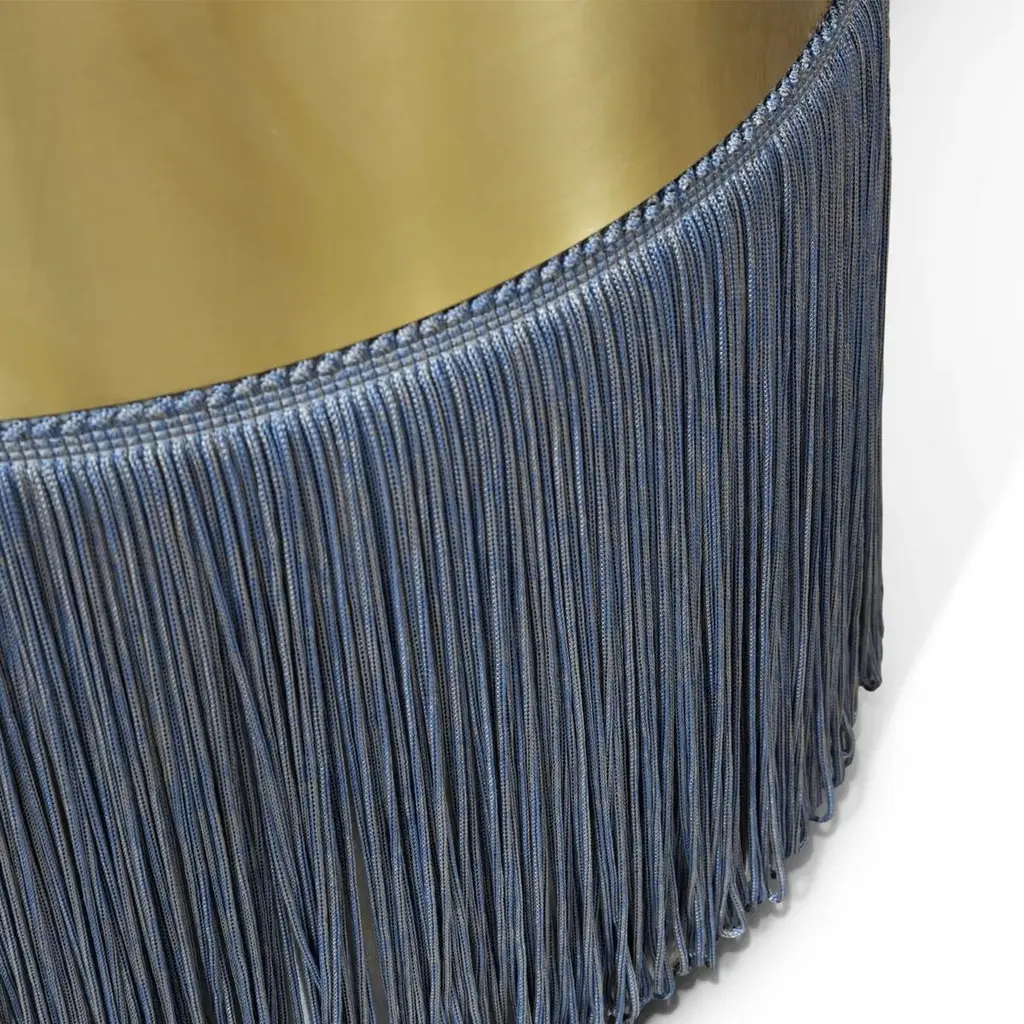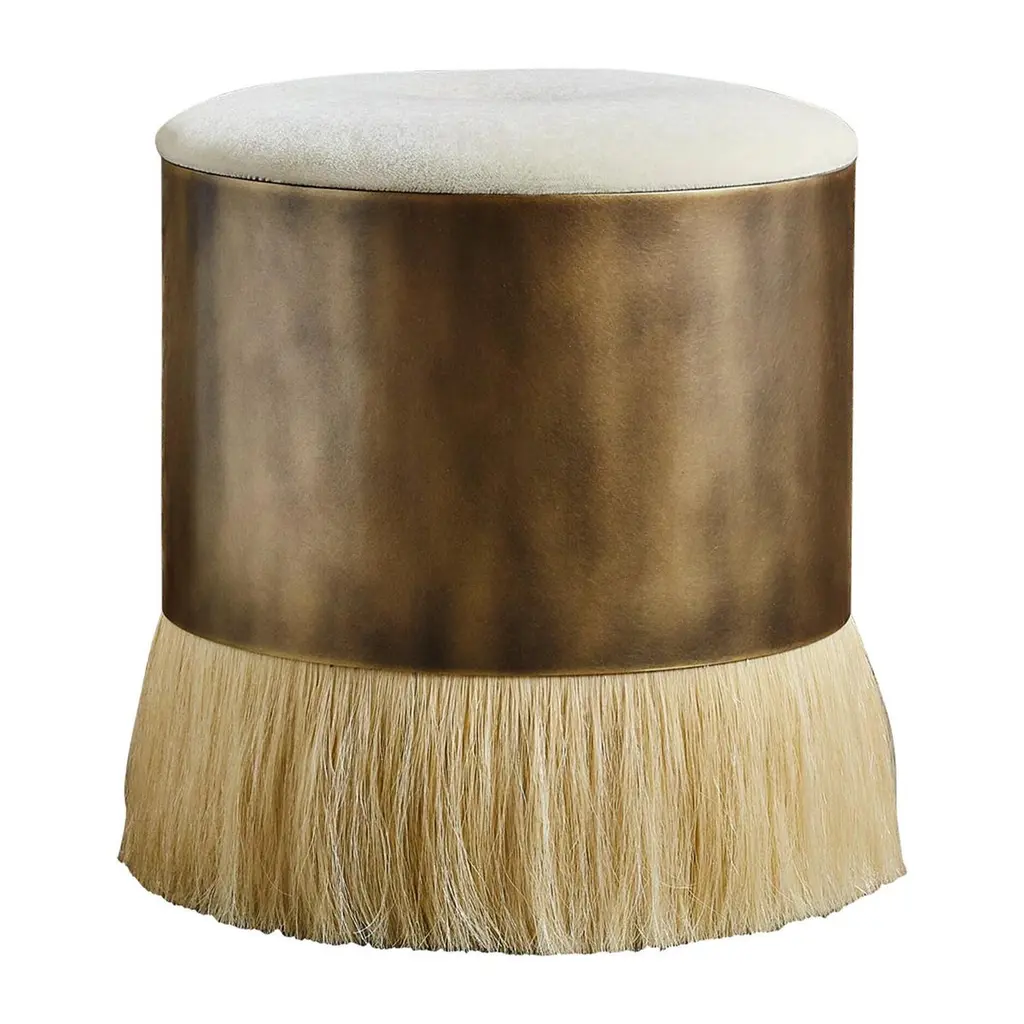 Each of these fashionable pouf stools feature their own unique combination of contrasting materials. One of a trio of KOKET pouf designs, the tailored button tufted seats, satin brass belts and flowing fringed skirts make this lovely lady the perfect accent seat whether standing alone or in a group.Materials & Finishes:Upholstery: COM - Customer's Own Material (Firenze Pearl 01 from KKbyKOKET Textiles Collection)Details: Satin Brass (High Gloss Finish)Upholstery Base: COM - Customer's Own Material (Firenze Pearl 01 from KKbyKOKET Textiles Collection)Base Detail: Bullion Tassel Olivia (Blue)Clean & Care: Care for textiles by vacuuming or lightly brushing. Maintain textiles by keeping them away from direct sunlight. Rotate and flip cushions when vacuuming for even wear. The nap of high pile textiles such as velvets may become crushed or lose its original pile height. We recommend light steaming to lift the pile to its original height. The textile should also be brushed with a de-linting brush to maintain its pile. Water based or solvent cleaner may cause discoloration or staining. We recommend that stained or soiled textiles be professionally cleaned. Never use cleaners with alcohols or solvents on metals. Only use cotton or extra soft cloths. We recommend that tarnished metals be professionally cleaned. Clean polished metal or polished stainless with a damp cloth. Do not use commercial or heavy-duty polishes or waxes, as they may scratch or damage the finish. Polishes we do recommend are Brasso, Simichrome, or our favorite Flitz; these can be used without inflicting damage even for the unskilled user, unless the polished surface has a wax sealer coat. These polishes will remove the wax while polishing the metal, but the surface would then have to be re-waxed if it is on a metal that needs to be sealed.