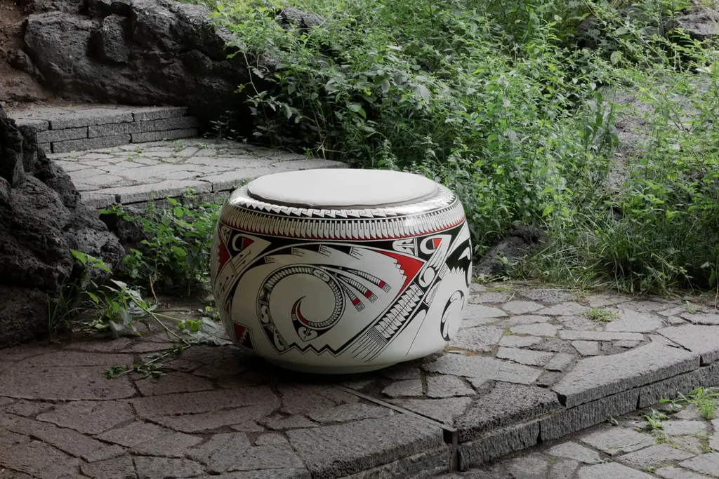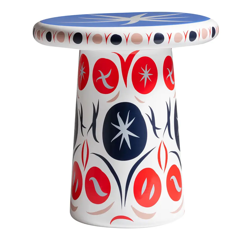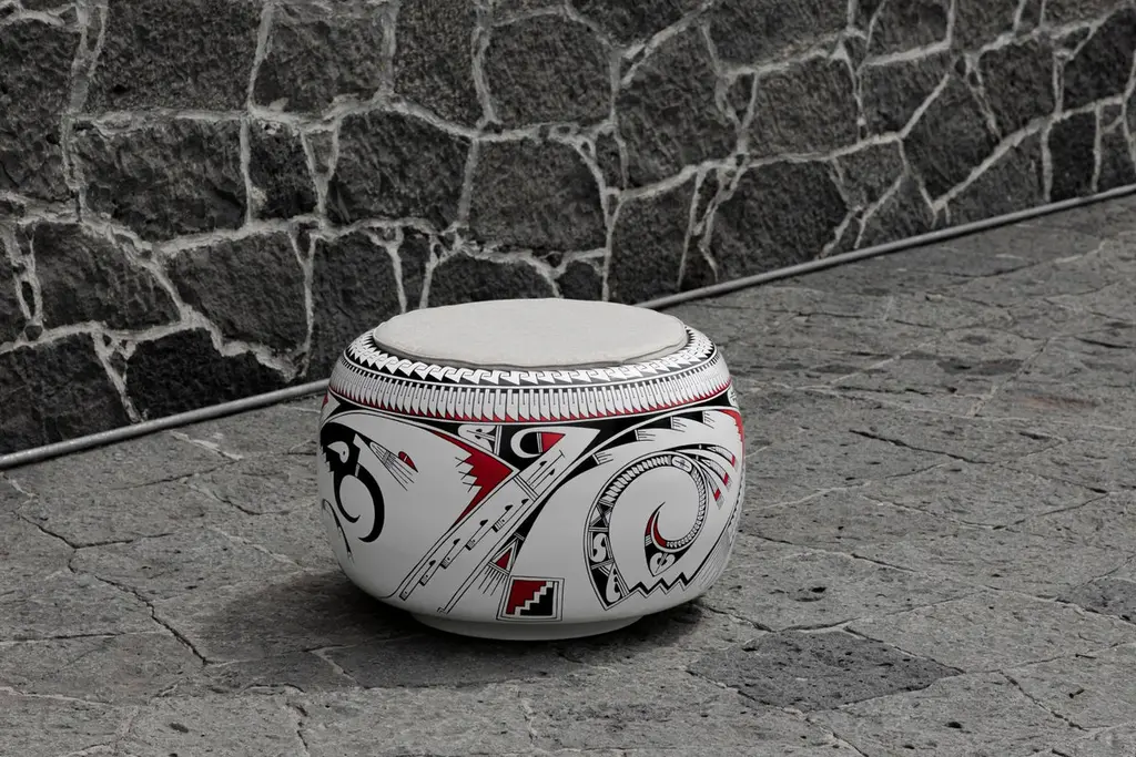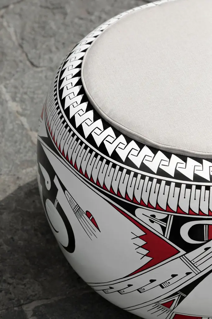 Olla Stool I by Brera StudioOne of a kind.Dimensions: D 75 x W 75 x H 45 cm.Materials: pinewood, paint, linen.Made from endemic pine wood in the region of Chihuahua, and hand-painted by the artisans Hector Gallegos and Laura Bugarini, potters from Mata Ortiz, Olla Stool is a modern reinterpretation of the ceramic vessels of Paquimé, known as "ollas," found in the archaeological area.Brera StudioWe are a multidisciplinary Mexican design studio founded by a creative fusion between Andrea Aude and María Fernanda González. The studio focuses on architecture, interior design and product design, offering innovative and disruptive proposals through experimentation with shapes, textures and colours. We are dedicated to contemporary crafts, arts and slow design that arouses contemplation, curiosity and fun.At Brera Studio we offer high quality pieces following the principles of Slow Design. We offer high-quality pieces, responsibly manufactured exclusively to order in collaboration with local artisans, seeking to add value, well-being and learning to all those involved in the materialization of our ideas.