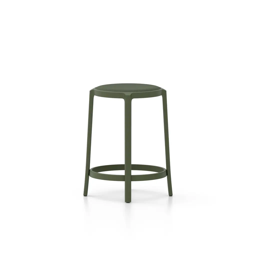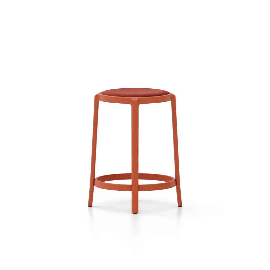 The On & On Collection breaks new ground with a circular way of thinking, combining longevity of design, durability, and the use of recycled materials that can be recycled again – on and on. The upholstered seat is offered in Kvadrat Steelcut Trio fabric, Spinneybeck leather or Kvadrat Haku polyurethane textile, all matching the stool frames in six appealing and timeless colors. Made and remade in USA from recycled PET. Recycled plastic seats and plywood seats in ash and oak are also offered as well as COM/COL - please contact us for further upholstery options.