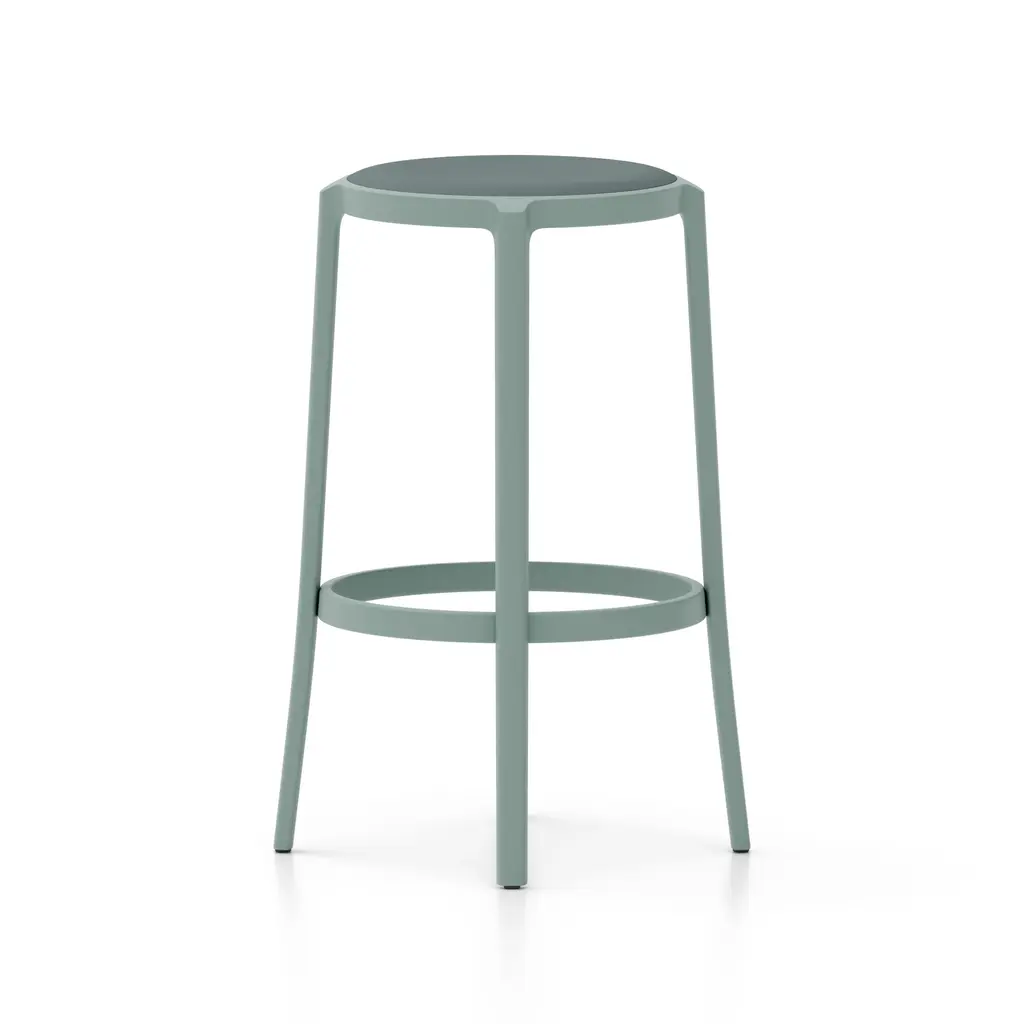 Combining longevity of design, durability, and the use of recycled materials, Emeco has created the On & On Upholstered Stool, a truly revolutionary seating design that can be recycled again – on and on. Looking to create the next generation of simple and timeless café chairs, engineered for strength and designed specifically with recycling in mind, Emeco and Barber & Osgerby created a stool that is physically and visually lightweight, yet extremely strong and durable. Suitable for both demanding commercial environments and domestic use, indoors and out, this stool is crafted in the United States from recycled plastic reinforced with fiberglass for endless strength and lasting beauty. Features