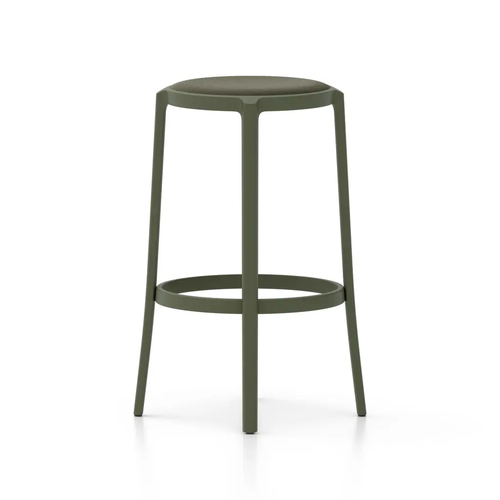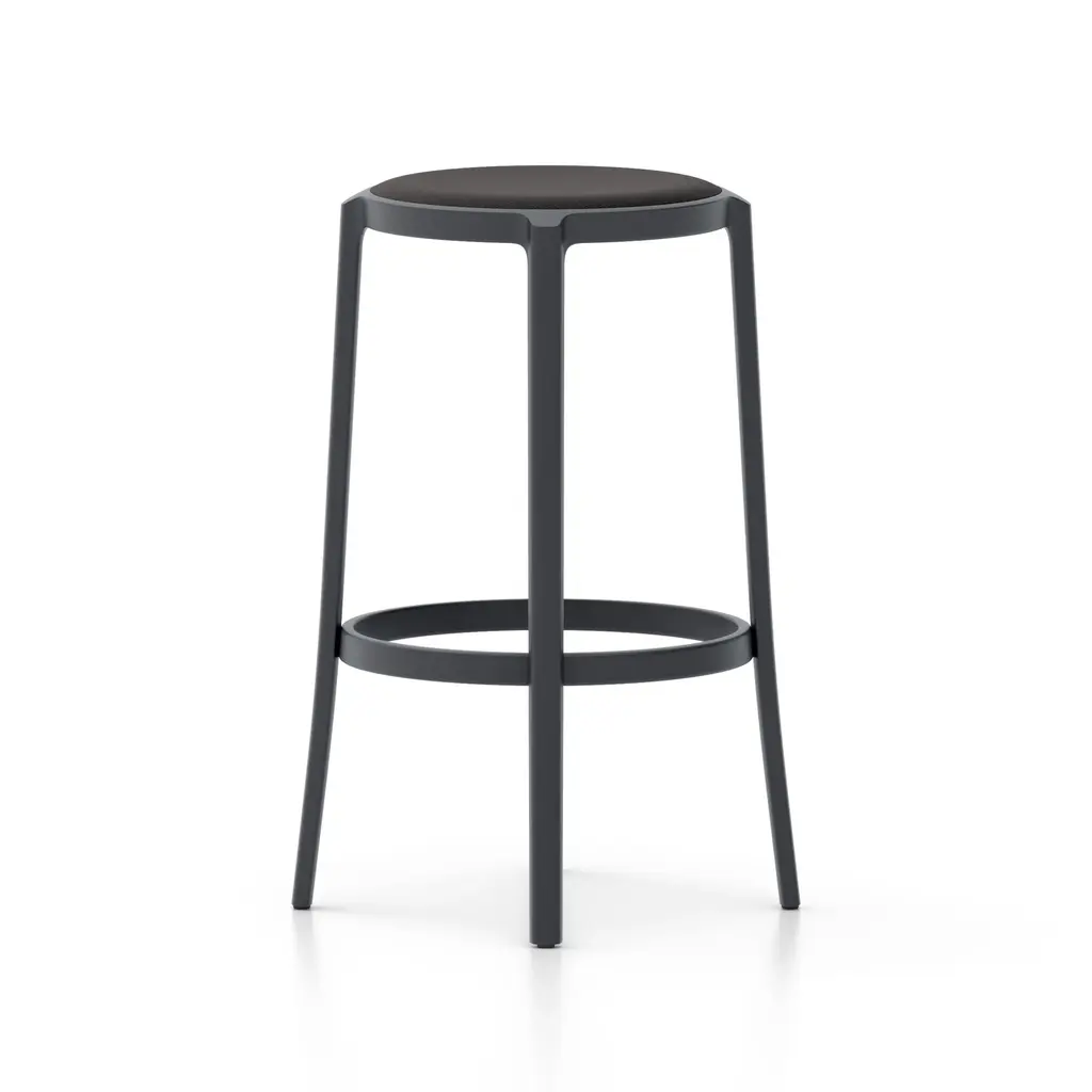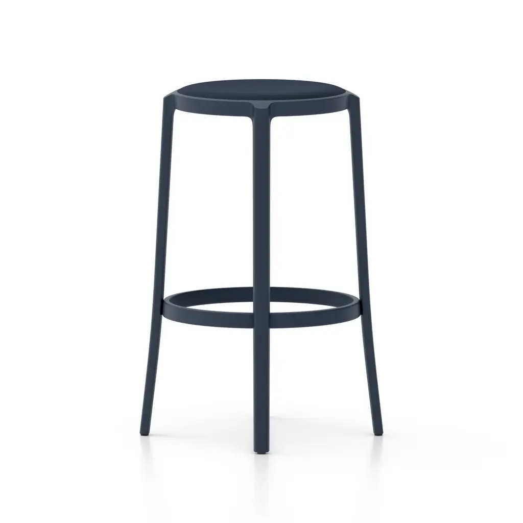 Combining longevity of design, durability, and the use of recycled materials, Emeco has created the On & On Upholstered Stool, a truly revolutionary seating design that can be recycled again – on and on. Looking to create the next generation of simple and timeless café chairs, engineered for strength and designed specifically with recycling in mind, Emeco and Barber & Osgerby created a stool that is physically and visually lightweight, yet extremely strong and durable. Suitable for both demanding commercial environments and domestic use, indoors and out, this stool is crafted in the United States from recycled plastic reinforced with fiberglass for endless strength and lasting beauty. Features