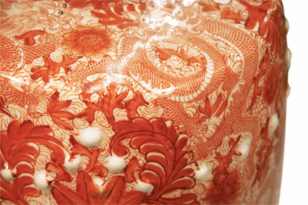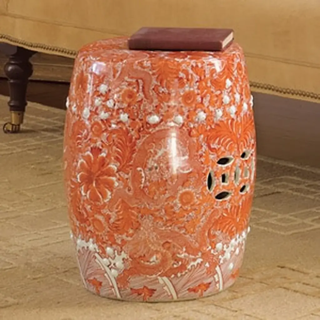 Orange Porcelain Garden Stool W/ Dragon Motif