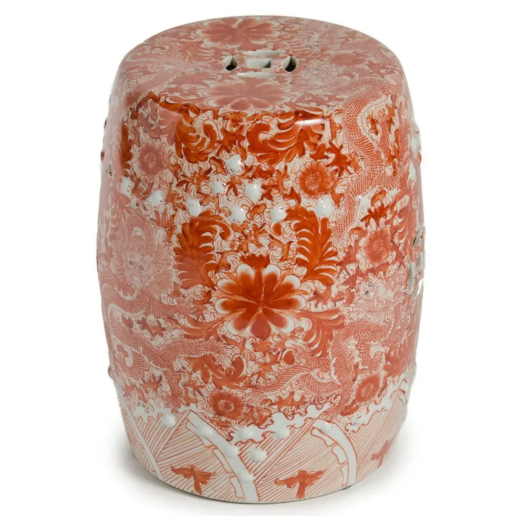 Lustrous and versatile, this hand-painted garden stool is a sculpture, a functional perch, and a decorative presence in high-fire porcelain. Color: Orange/White Dimensions: 13"Dia x 17"H Materials: Porcelain SKU: 1651 Ships within 3 business days Free shipping in the U.S.