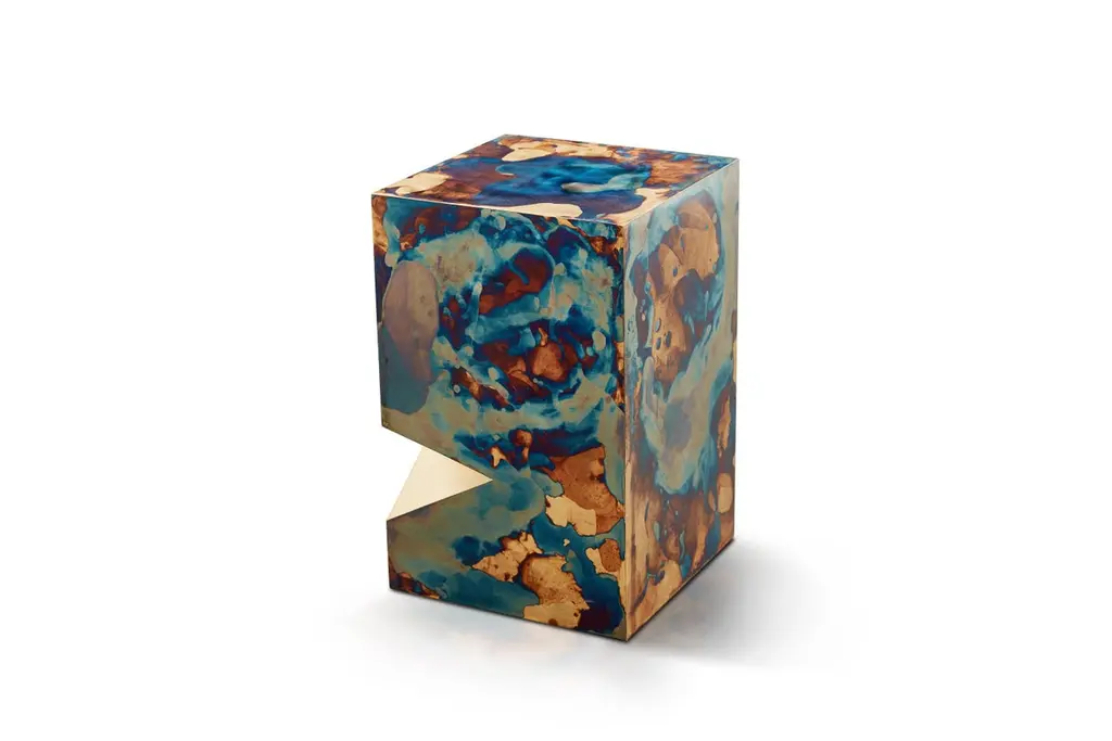 The colorful stool/side table is designed and made by artist Daishi Luo (Shanghai, China). It is fully customizable in size and color. Spontaneous growth of copper is the latest series in Daishi's Bio-design programs. She uses a comprehensive application of design and science to fine-tune the behaviour of materials and awaken the colour of copper from a biological perspective. The stars, gullies, trees, oceans grow from colours, just like copper show the boundless universe through colour language. This is not only about the study of materials, but also the study of Bio-design thinking. We range from simulating nature to designing nature to natural creation; from industrial production assembly to the self-generated growth of matter. Could this change in creative thinking make things more creative?This research began in the Manman series 2016. How to respect the material properties and stimulate the vitality of materials is the direction I always explore. In this new series, I used the video, photography, sculpture, painting, and books to create works. Each piece has an independent form but is highly unified in the project, and is dedicated to presenting the biology of copper from a multidimensional perspective.