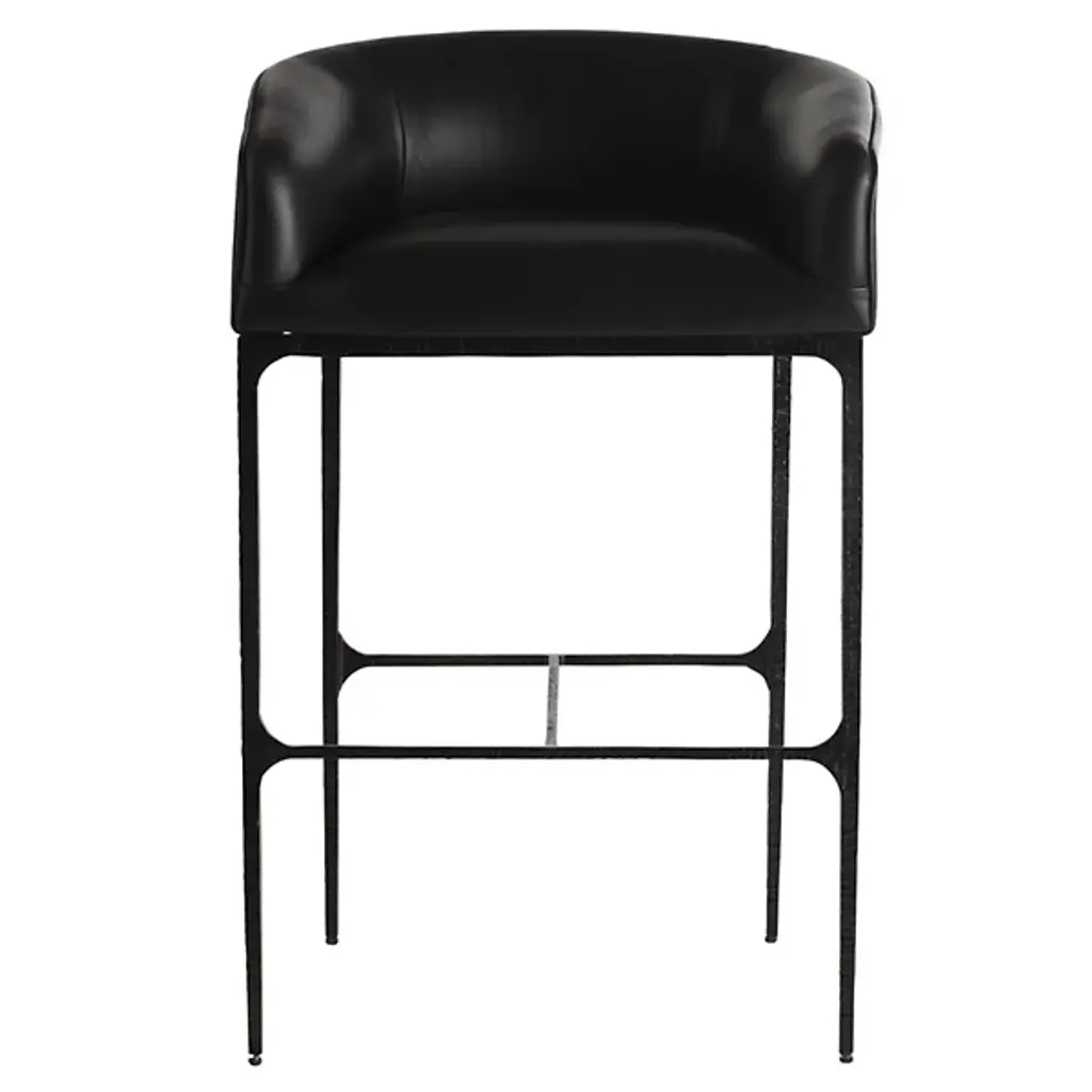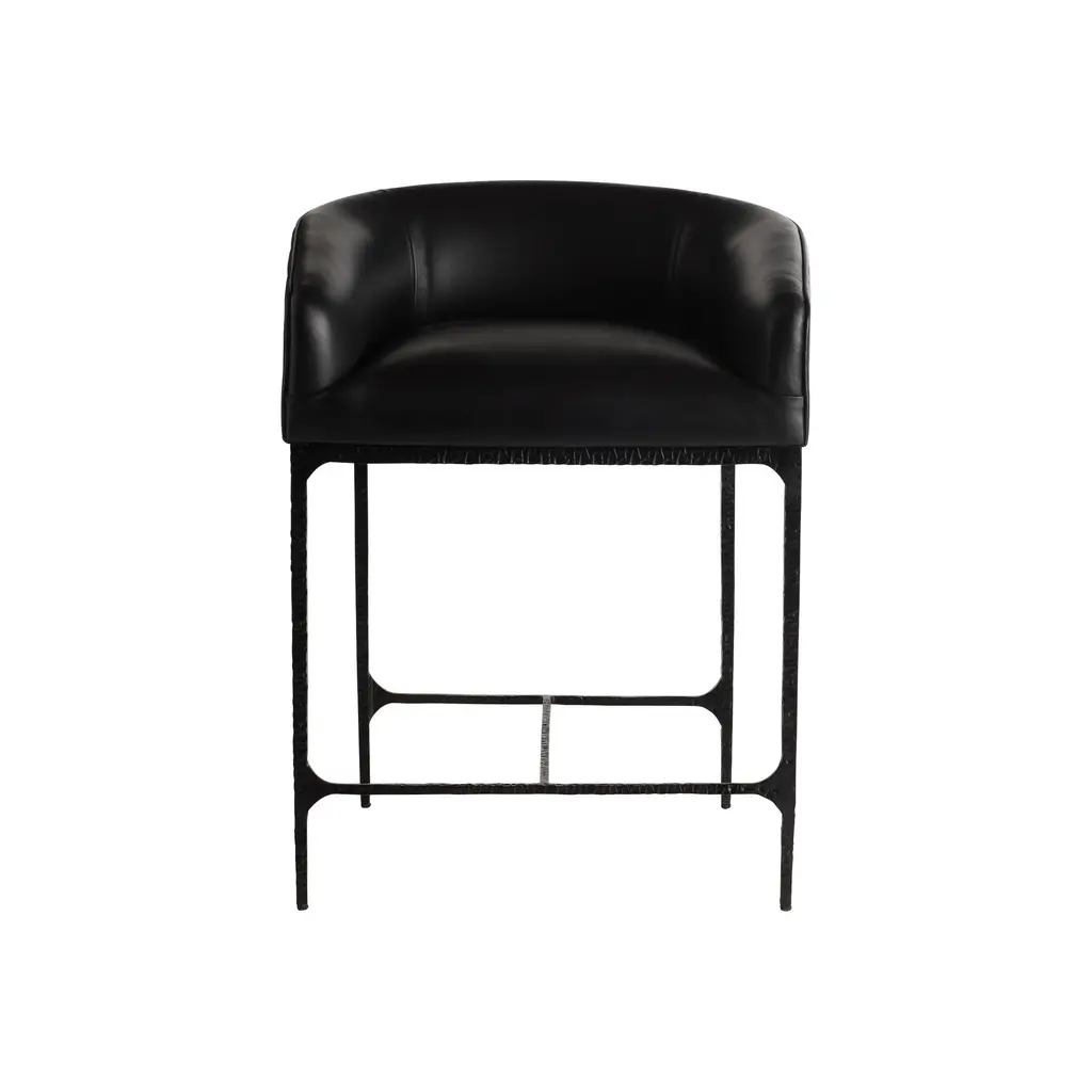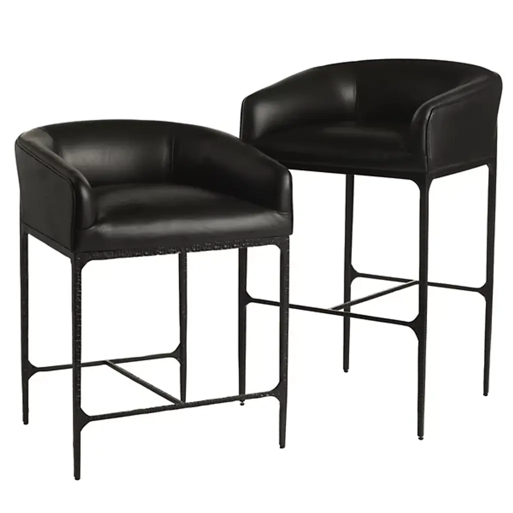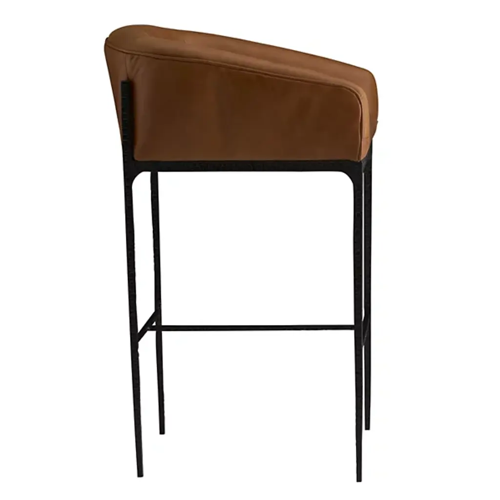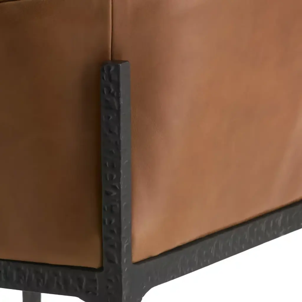 Complement your gathering spaces' polished look while nestling comfortably inside the Osbourne Stool from Arteriors. This modern design delights with a chic style. A slender iron frame rises with a fascinating hand-hammered surface texture. This frame provides a generous footrest. On top, an upholstered seat pleases the lower body with generous cushioning. A low lumbar support gives one a restful hugging sensation. The leather accentuates this piece's time-honored while providing a familiar smooth feel.