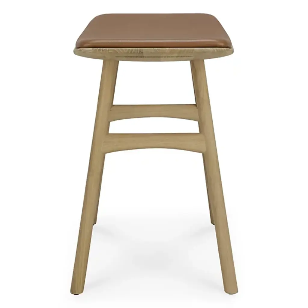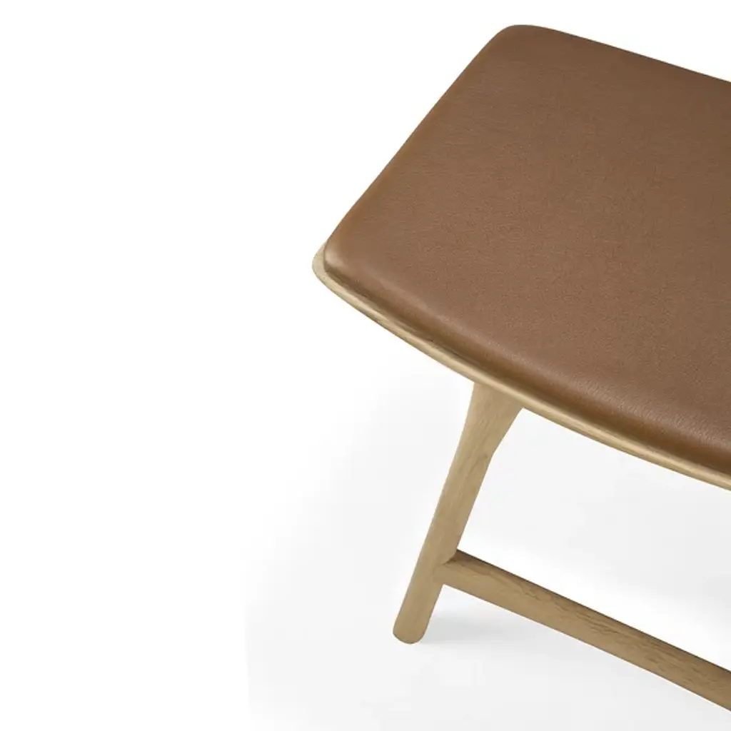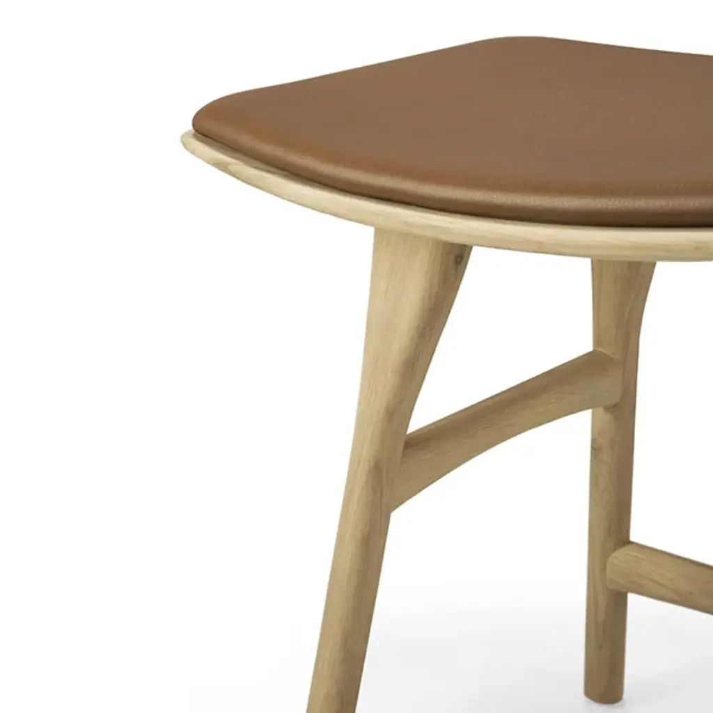 Lend a stately, contemporary comfort to interior living spaces with the Osso Upholstered Stool from Ethnicraft. A four-legged construction of solid oak, it rises from slender legs, leaving its interior light and open, though braced with beams for structural strength. A curving seat adds a touch of sculptural presence, solidly anchoring its occupant. A slim layer of leather acts as a seat pad, contrasting well with the subtle woodgrain beneath and creating a lasting natural presence.