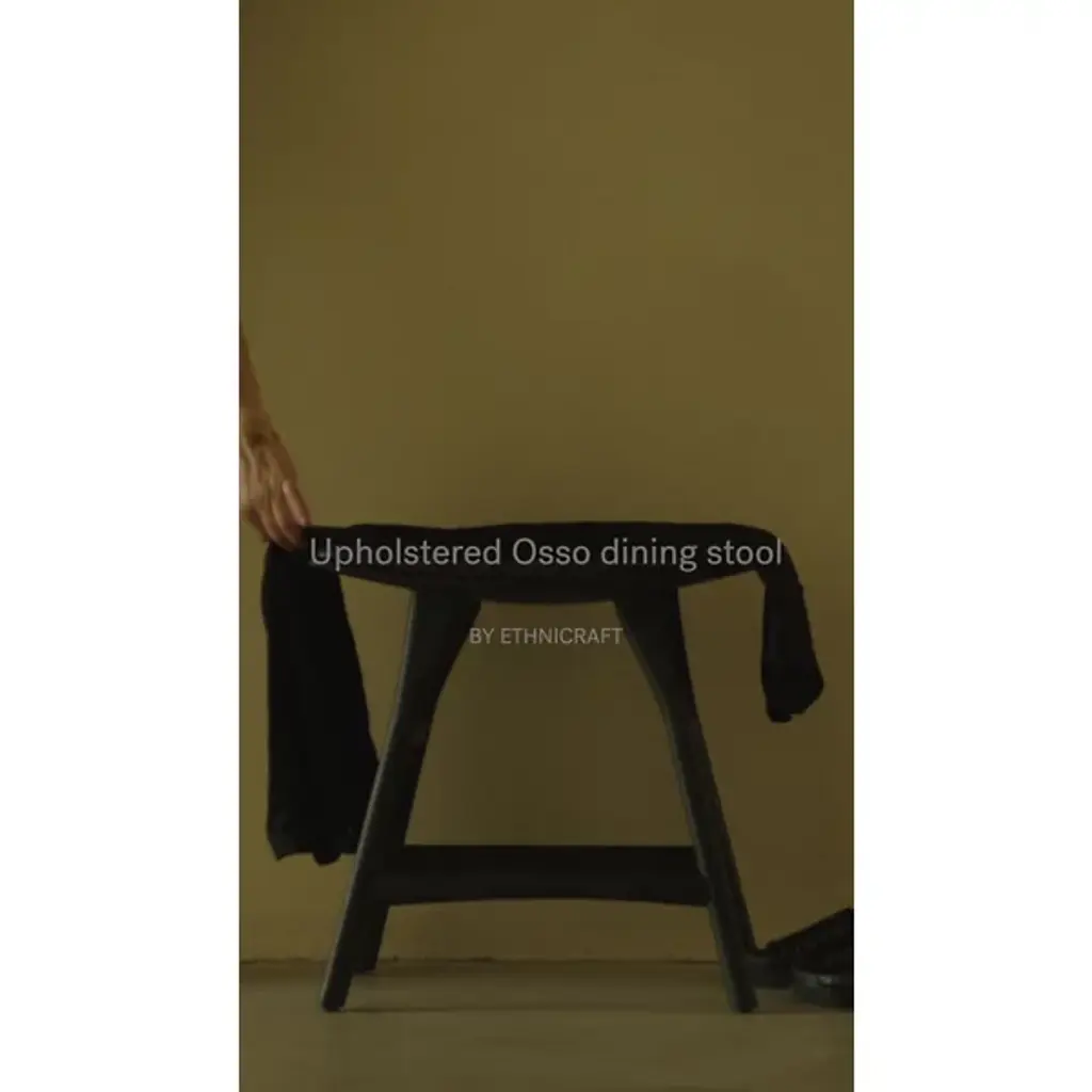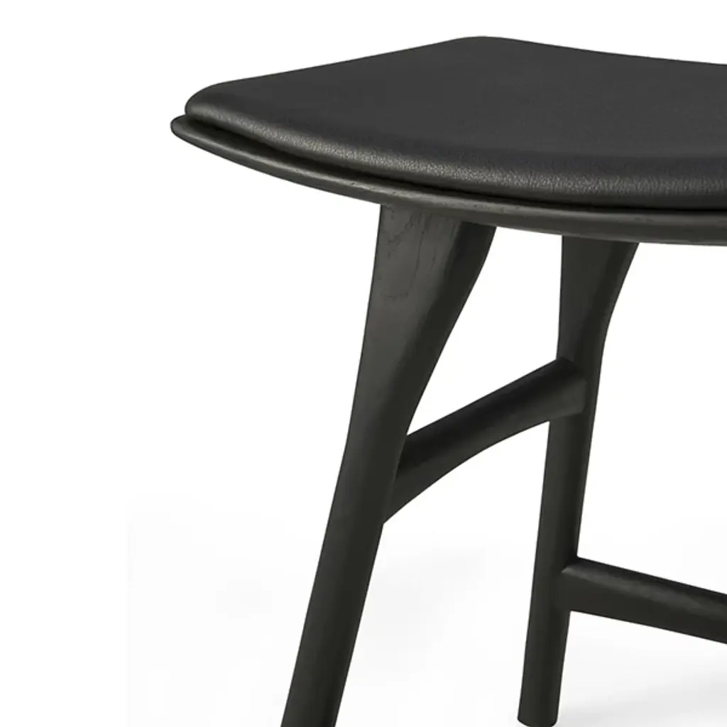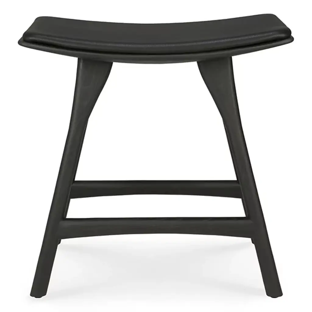 Lend a stately, contemporary comfort to interior living spaces with the Osso Upholstered Stool from Ethnicraft. A four-legged construction of solid oak, it rises from slender legs, leaving its interior light and open, though braced with beams for structural strength. A curving seat adds a touch of sculptural presence, solidly anchoring its occupant. A slim layer of leather acts as a seat pad, contrasting well with the subtle woodgrain beneath and creating a lasting natural presence.