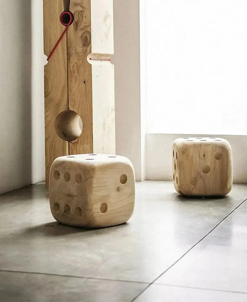 The Dadone stool is another collectible design from the Riva 1920 collection of hand-carved This dice themed stool is made in solid cedar wood and can be rolled on all six sides.Materials: Solid cedar wood.Dimensions: w40 x d40 x h41cm. Crafted entirely from natural wood, each piece is hand-finished without any additional treatment.This product is crafted from solid cedar wood. Due to the natural properties of solid cedar, the following changes may occur over time, especially when placed outdoors:1. Cracks, splits, and movements in the wood are expected and should be viewed as a normal part of the material’s aging process rather than a defect. If used outdoors, these movements will be more pronounced and frequent. 2. When exposed to outdoor elements, cedar will gradually turn grey due to UV exposure and moisture. This transformation is unavoidable and occurs naturally over time.3. The appearance of mold spots or surface deposits is a natural reaction of cedar, particularly when stored in transport crates for extended periods, or covered for too long. If mold spots appear, follow these maintenance steps: - Use the provided brush to remove surface residue.- Wash the affected area with water.- Allow the piece to dry in a well-ventilated area.4. Cedar wood contains natural resins, which may surface over time, particularly on the top or bottom of the product. To prevent staining, avoid placing cedar furniture directly on carpets or soft surfaces that restrict airflow.General Care Recommendations-Keep cedar products in dry, well-ventilated spaces.-If used outdoors, understand that significant aging effects will occur, including color fading, deeper cracks, and more pronounced wood movement.By purchasing and using this product outdoors, the buyer fully accepts these natural transformations as part of the wood’s aging process.We do our best to expedite production and to ship and deliver product within the listed lead time, however current lead times might be longer due to global shipping backlog and delays. These delays are out of our control and cannot be a reason to cancel an order.Our pricing includes all costs for international shipping to the U.S., as well as duties and customs clearance fees. Please be aware that local delivery within the U.S. is not included. We offer white glove, front door, and warehouse delivery options. For shipments outside the U.S., kindly reach out to us for a detailed quote.