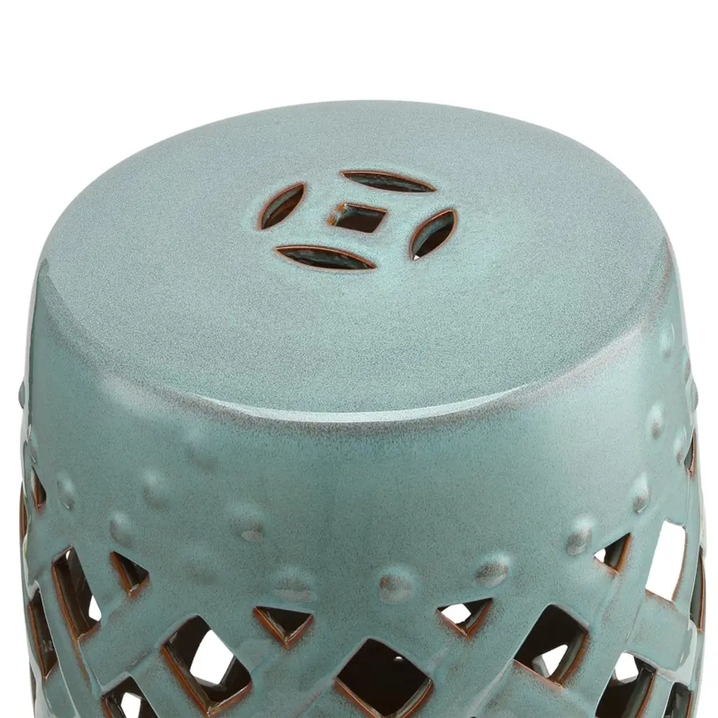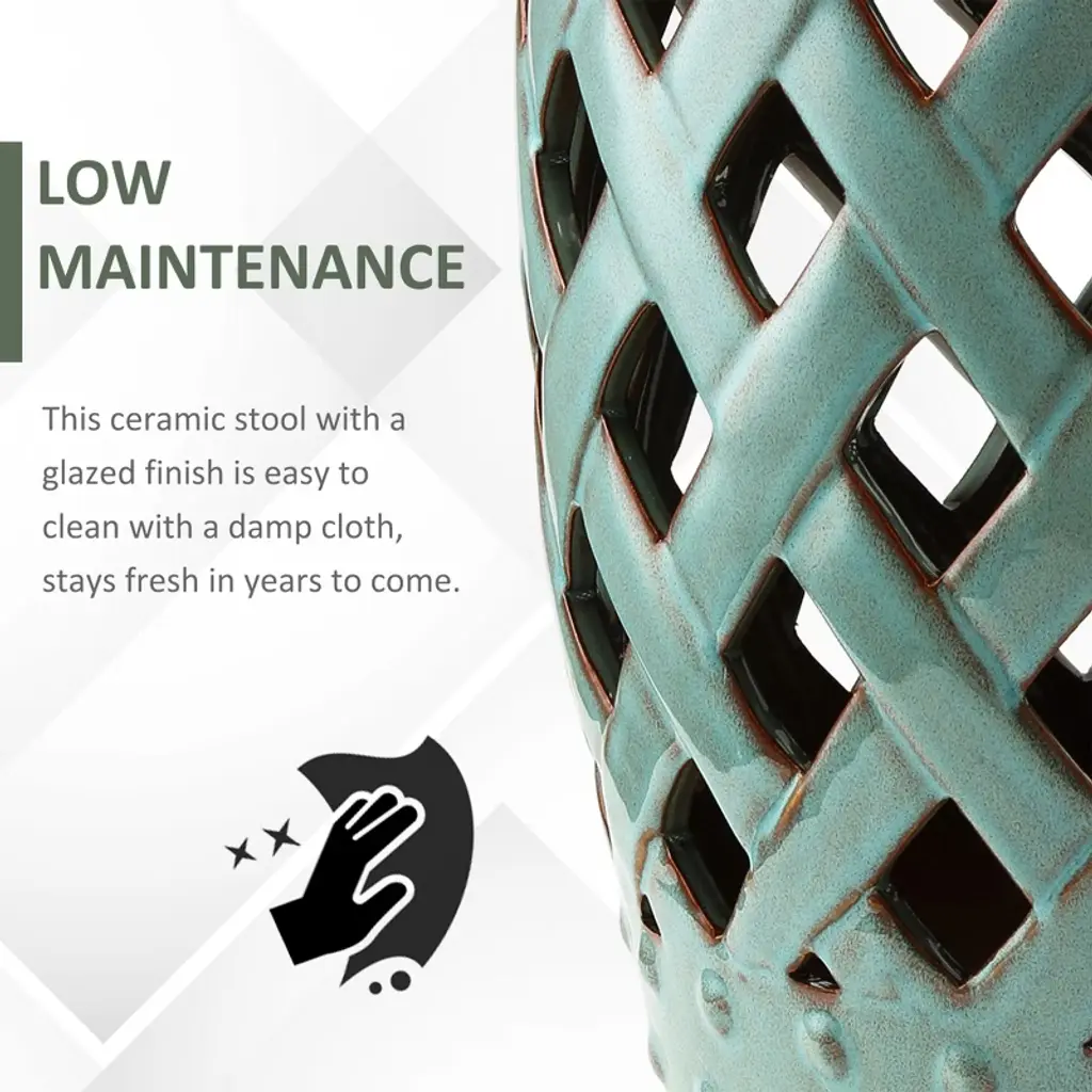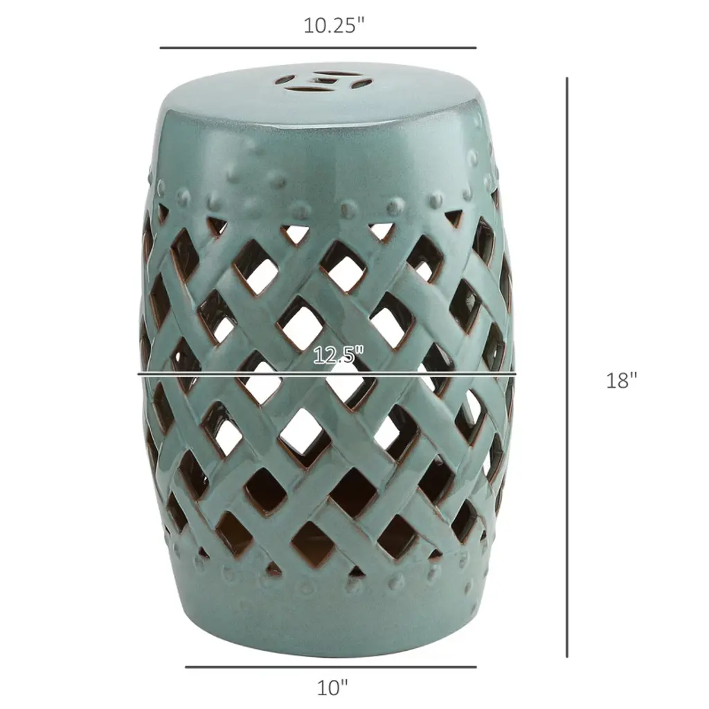 Premium Material: This garden stool is crafted of high-quality ceramic fired at temperatures of up to 1,200 degrees to make it sturdy enough to last year-round use.Versatile Stool: This multifunctional stool can be used both outside and inside as an extra seat, a footrest.Added Elegance: Our garden stool with an interwoven lattice design fits any style of decor. It is perfect for your garden, patio, deck, backyard, or anywhere that you want to add an elegant accent.Low Maintenance: This ceramic footrest with a glazed finish is easy to clean with a damp cloth, and stays fresh for years to come.Solid Construction: Our round stool can support a weight of up to 300 lbs., so it can hold whatever you put on it, including your own weight.