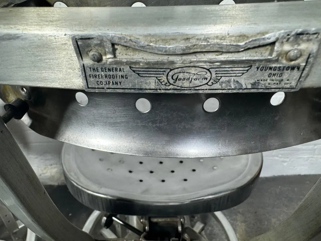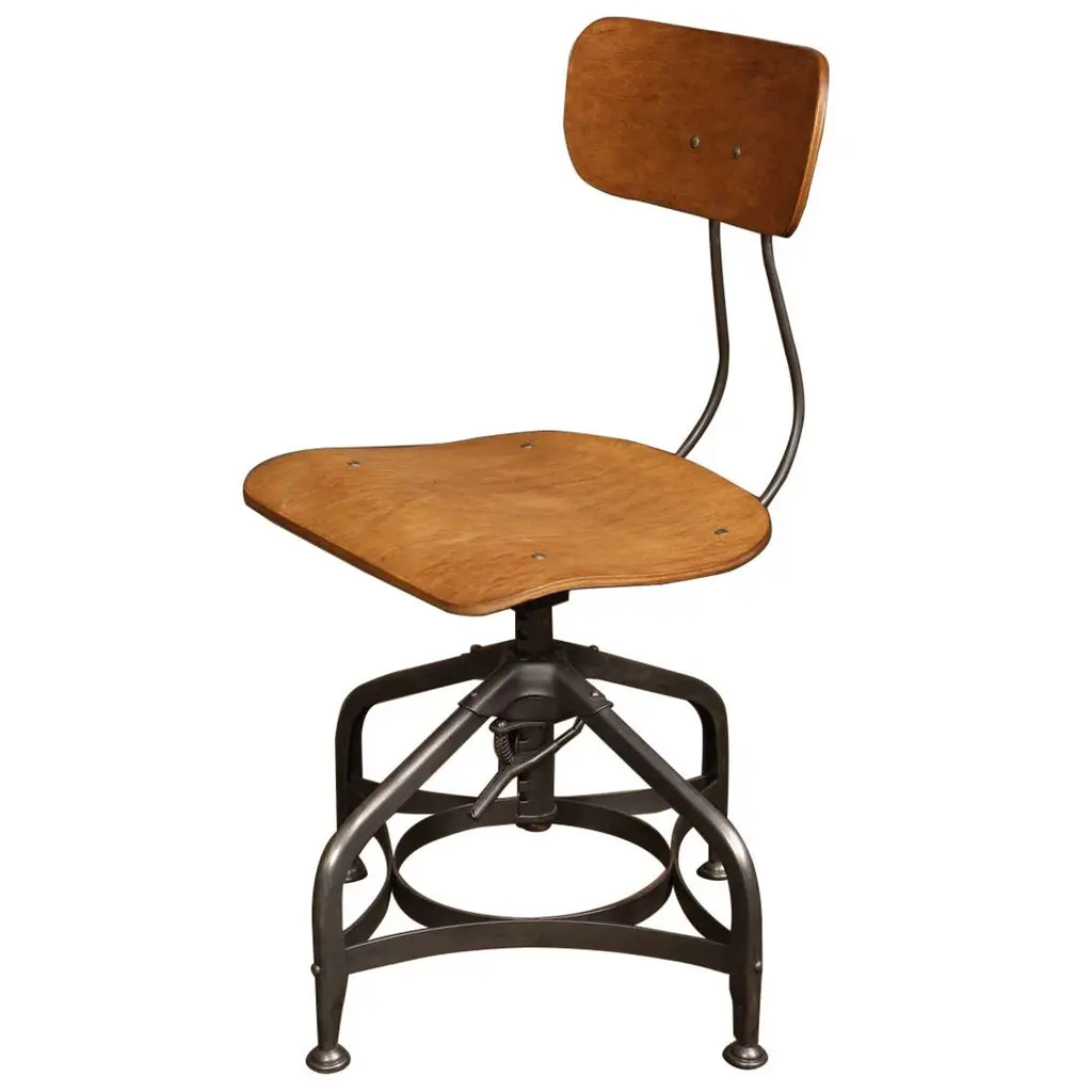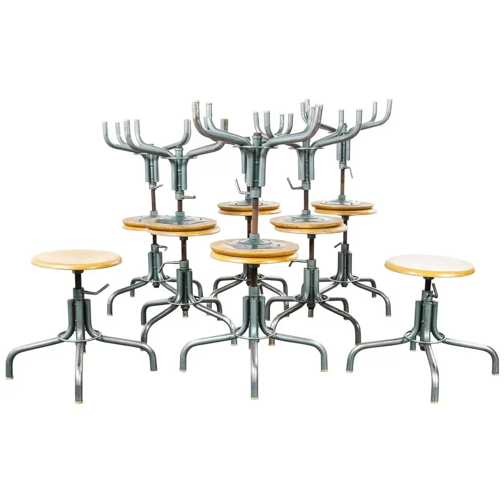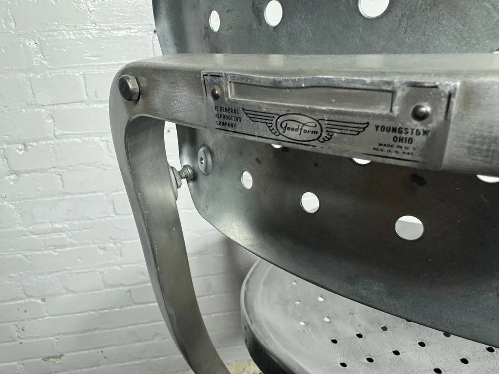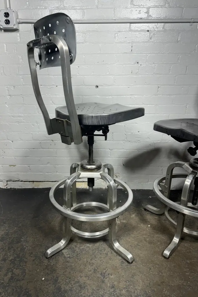Pair Vintage Industrial Goodform drafting stools with perforated seat & pivoting backrest. """""PRICED SEPARATELY"""" perforated seat and back upholstery (oil cloth) removed and have been polished, Wonderful , classic design,, Extremely comfortable . Overall Dimensions: 18" x 18"Seat Height Adjusts from 25 1/2" to 31 1/2"Overall Height Adjusts from 38 1/2" to 44 1/2".