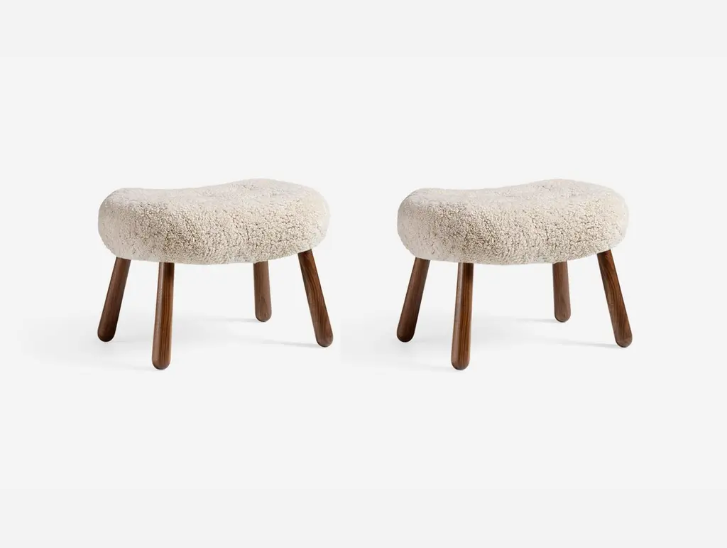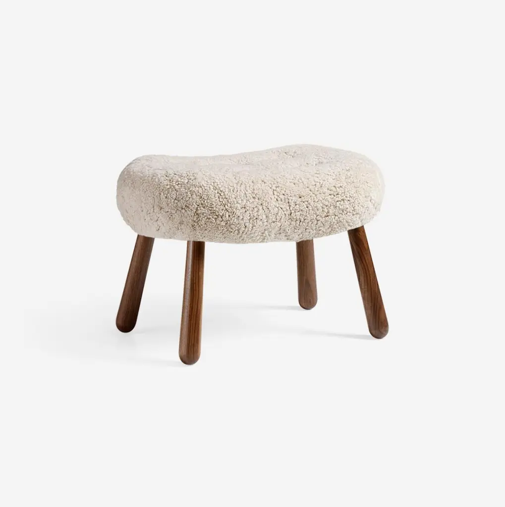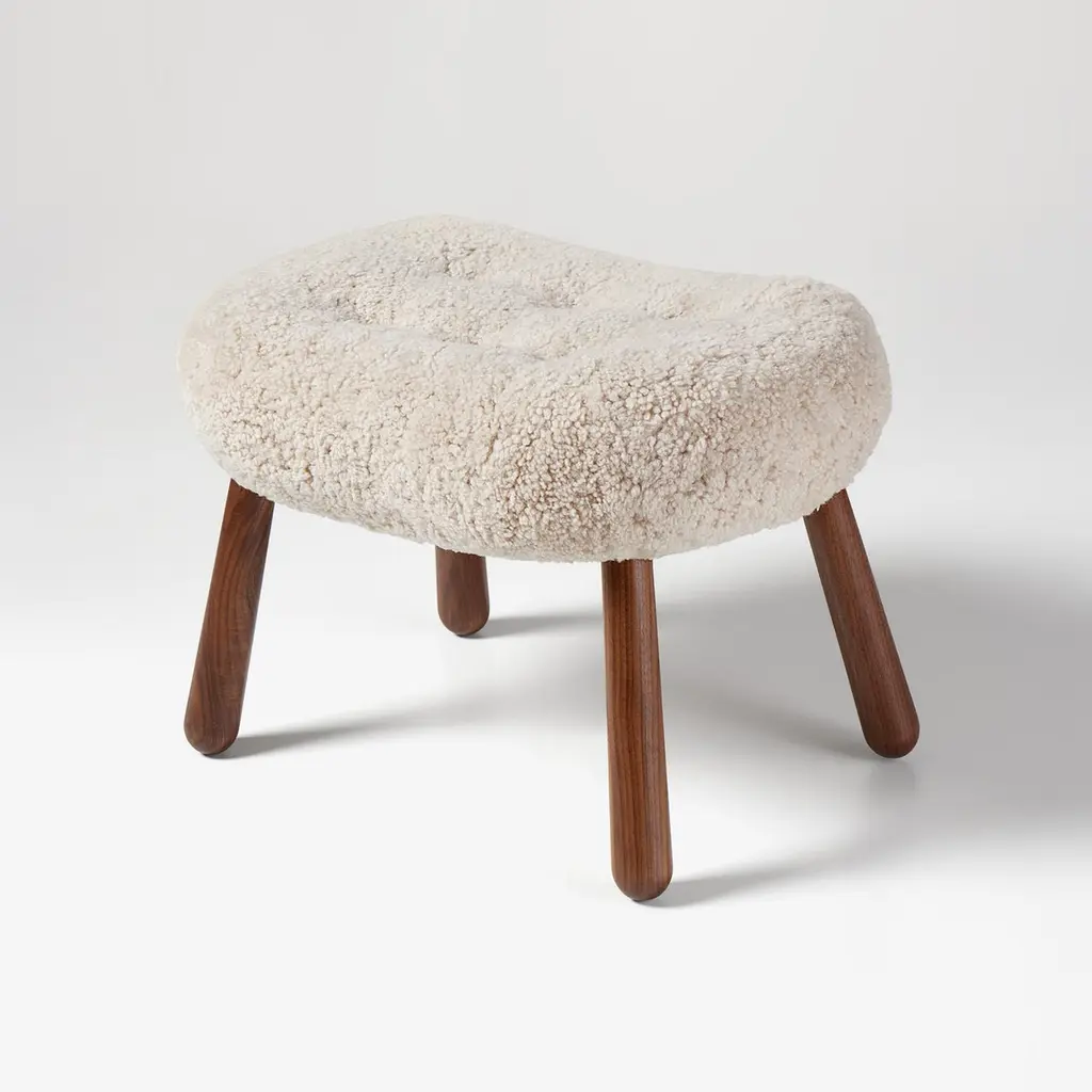 Arnold Madsen - Pair of Sheepskin & Walnut Clam StoolsThe Clam Stool is the perfect companion piece for Arnold Madsen's iconic Clam Chair. This new design has been has been developed in close collaboration with the family of Arnold Madsen by mirroring elements from the Clam Chair. The Clam Stool is made using traditional joinery and upholstery methods with a solid wood frame and turned club legs at our workshops in Sweden.The Clam Chair was designed in 1944 in Copenhagen by Danish upholsterer Arnold Madsen. In 1945 Arnold founded the furniture company Madsen & Schubell together with cabinetmaker Henry Schubell in order to produce this unique chair that became known in Danish as the: 'Muslingstol' (Clam Chair), due to its unique shape. The Clam Stool is available in a wide range of upholstery and wood finishes. Example Shown: Moonlight Sheepskin + WalnutHeight: 39cm (15.3”)Depth: 40cm (15.7”)Width: 61.5cm (24.2”)