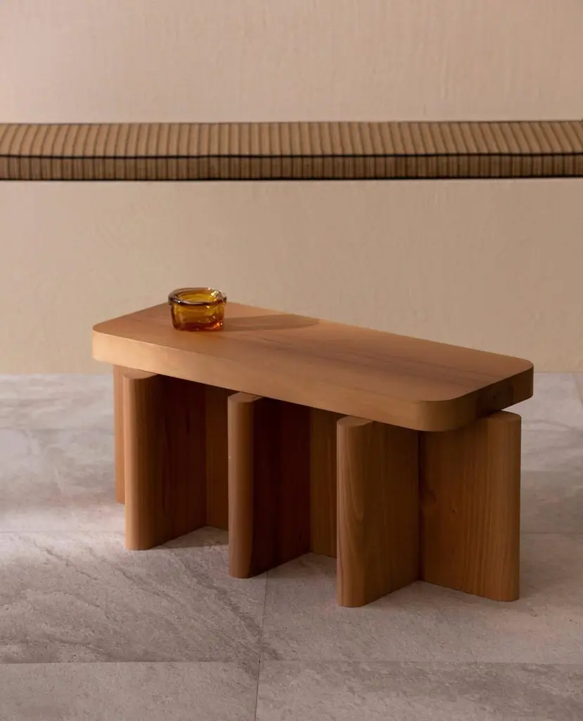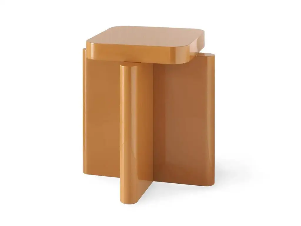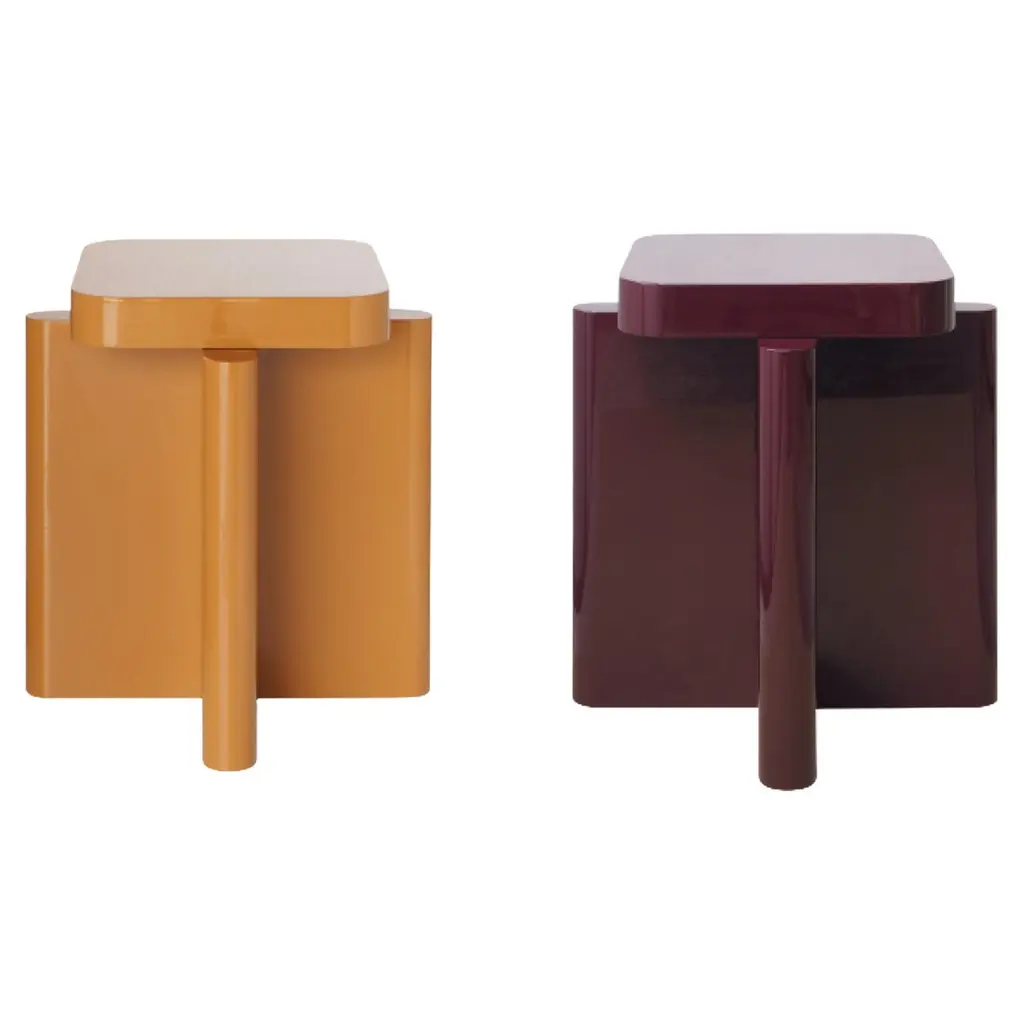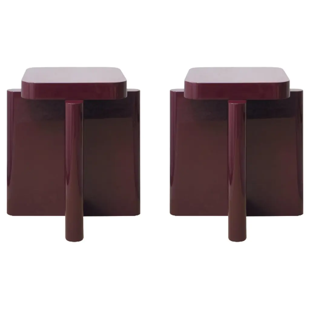 Pair of Bordeaux Red and Caramel Solid Wood Spina Wooden Stool by Cara DavideDimensions: D 40 x W 40 x H 45 cm Materials: Nut Wood, Lacquered MDF. Also available in colors: Bordeaux, Caramel, Dusty Red, Off-White, and Natural Wood.Both size and color can be customized on request.Spina is a collection of lacquered tables and seatings. The lacquered surfaces and consistent rhythm of the planes create a visual play of light, shadow, and reflection, adding depth and richness to this already visually graphic collection. The elements of the line are characterized by a dense skeletal base that supports a smaller horizontal plane along its axis.The thicknesses and proportions of the intersecting vertical planes visually saturate the space underneath its top, creating heaviness as if they were the pedestal for the horizontal plane. There is a visual hierarchy from the heavy plinth to the offset top plane and then to what gets displayed upon its surface.The notion of stacked objects and planes makes it a sort of altar with a totemic and primitive depiction.The collection is now composed of 4 elements in 4 lacquered gloss finishing colors. Both size and color can be customized on request. Completely locally made by expert masters, in Veneto, Italy. Design studio based in Milan, is a collaboration between Cara Judd (South Africa) and Davide Gramatica (Italy). Graduating in product design from IED Milan, Cara and Davide started their professional careers in diverse areas ranging from apprenticing with artisans to working with industrial companies before merging their experience in 2016. They work in the fields of product design, event curation and offer creative consultancy to studios and private clients. Cara and Davide both lecture in the Product Design Department at IED Milan. Passionate about craftsmanship, they also produce their own series of products working together with artisans in Italy and South Africa.MedulumAn ancient river flowing in the green countryside of the Veneto hinterland, between emerged lands and swamps that have now disappeared. Medulum, one of the favourite waterways of the Venetian aristocracy of old, indispensable for reaching their country homes.This is where our work draws its inspiration. We combine the experience of 40 years with innovative solutions, collaborating with architect and designer studios in the search and experimentation of new languages, through the craftsmanship of artisanal productions.Medulum has been designing and making furniture and accessories by searching for and experimenting with new languages, collaborating with architects and designers, with the craftsmanship typical of artisanal productions.