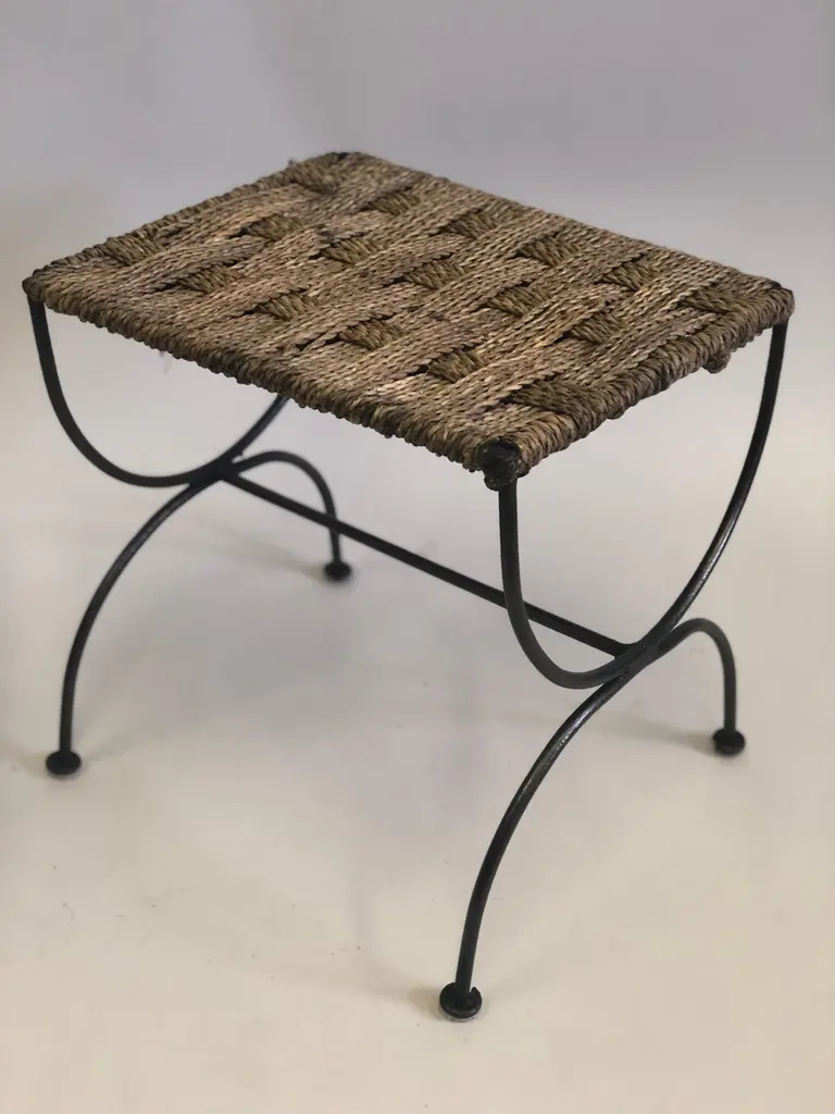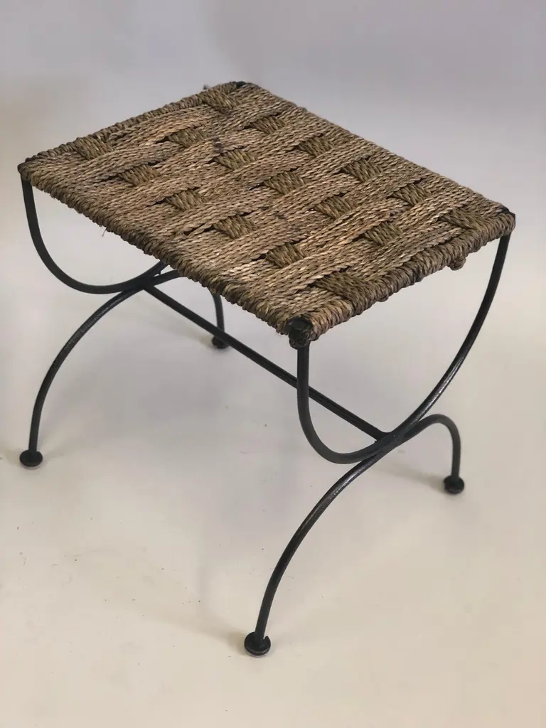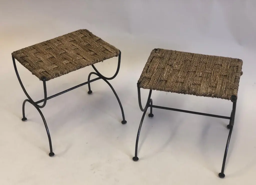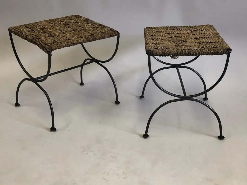 Pair Of French Mid-Century Wrought Iron & Rope Stools / Benches, Audoux & Minet.