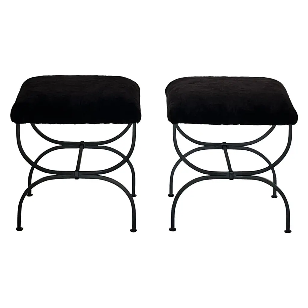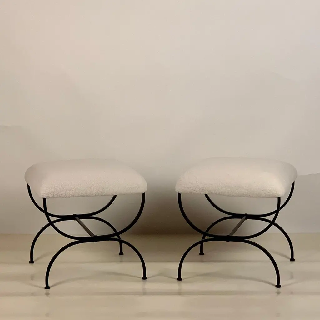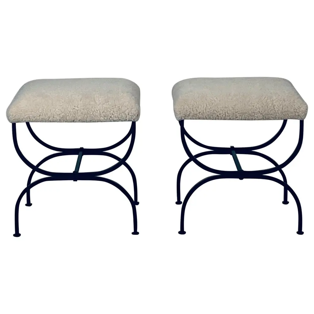 Sturdy powder coated frames fitted with gorgeous white / cream shearling seats. Upholstered firm for shape and durability.Great in lieu of a bench.Inspired by the timeless aesthetic of French modern design, these stools from our exclusive Design Frères line are handmade in our Los Angeles atelier by our skilled artisans. These classic, understated pieces will blend in, structure and enhance any space.