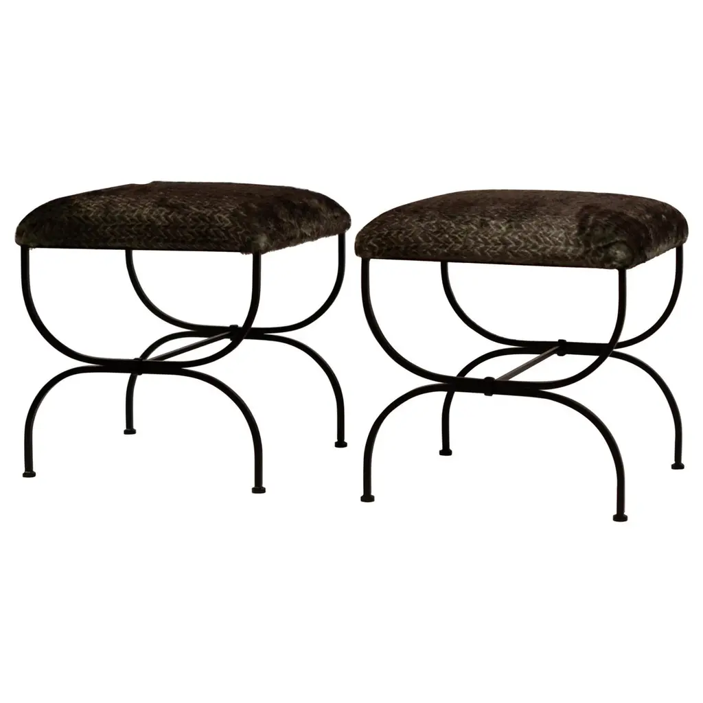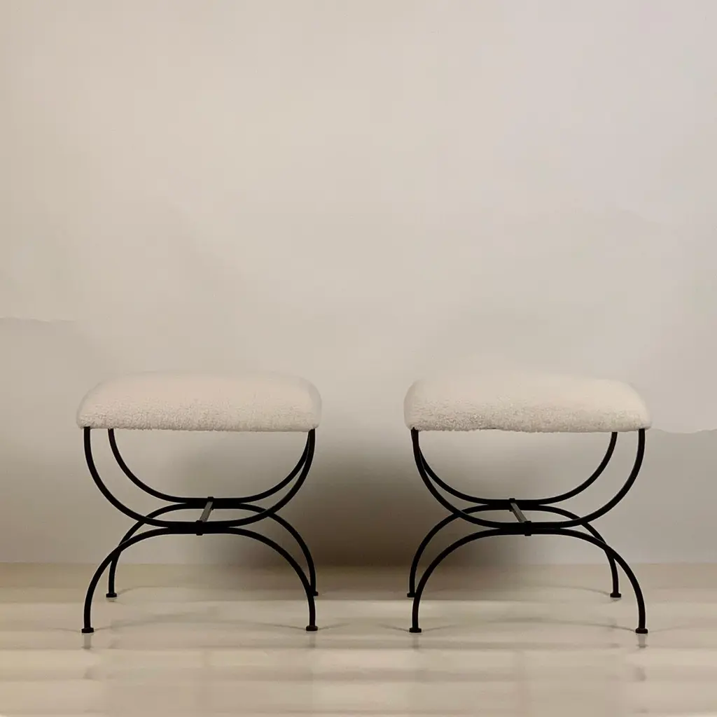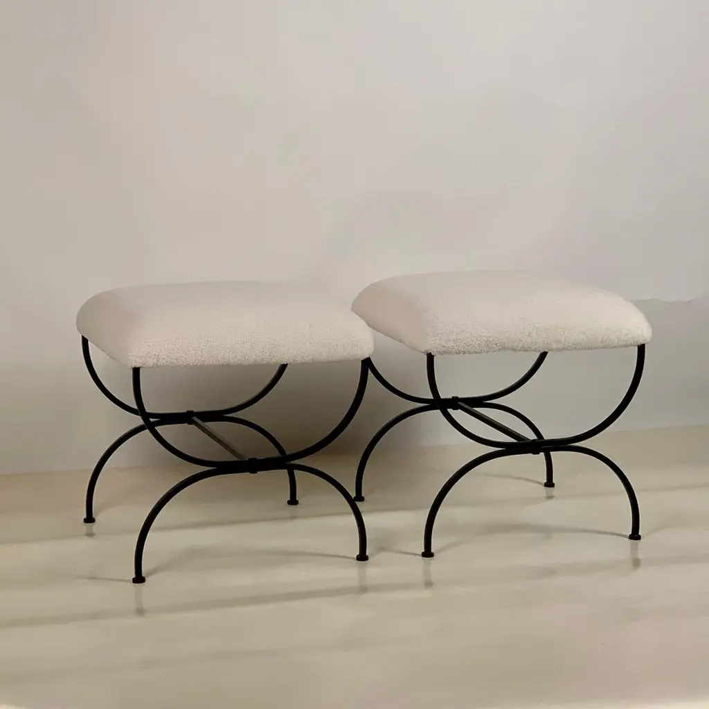 Sturdy powder coated frames fitted with gorgeous white / cream shearling seats. Upholstered firm for shape and durability.Great in lieu of a bench.Inspired by the timeless aesthetic of French modern design, these stools from our exclusive Design Frères line are handmade in our Los Angeles atelier by our skilled artisans. These classic, understated pieces will blend in, structure and enhance any space.