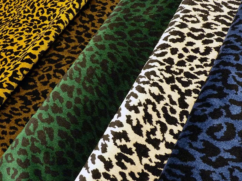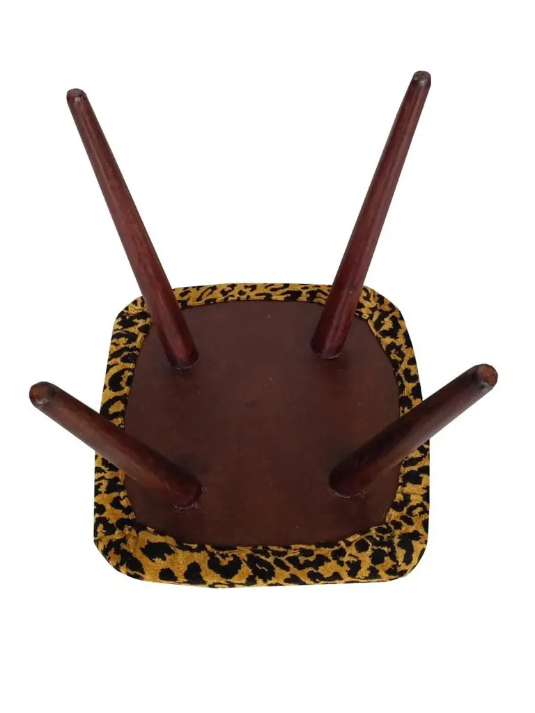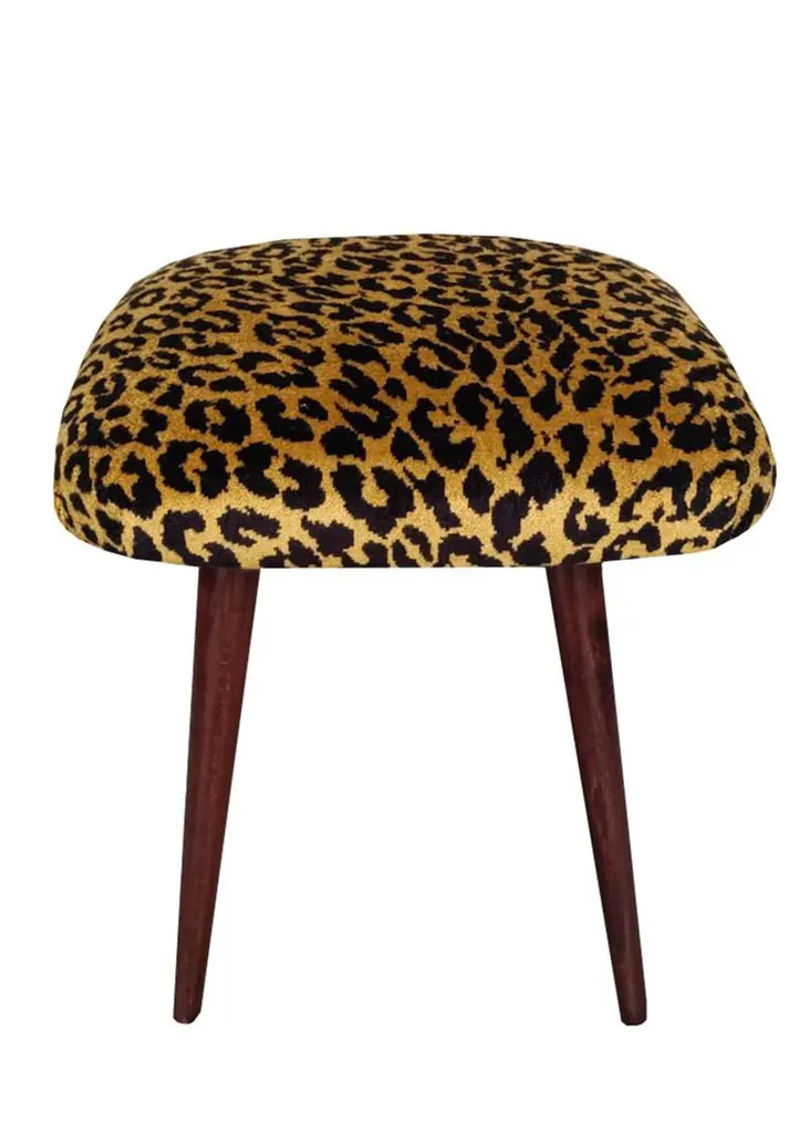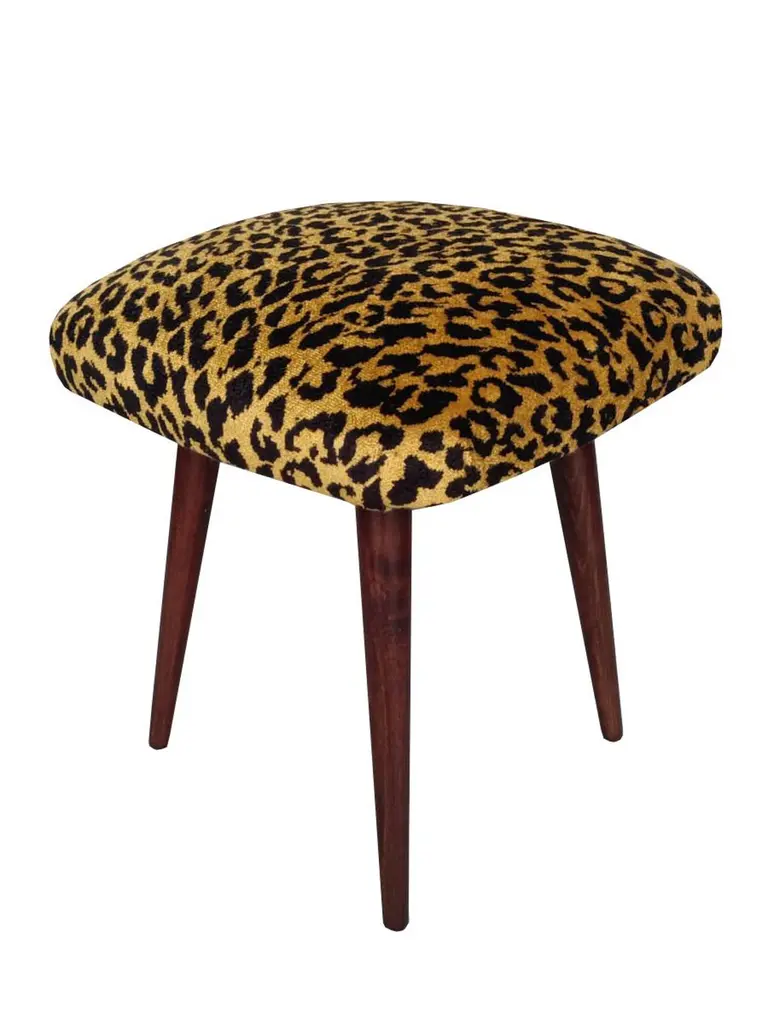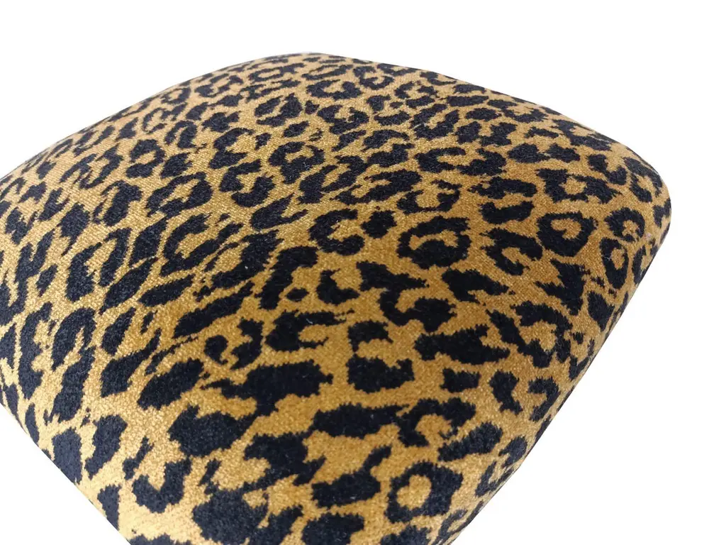 Stool from the turn of the 1960s and 1970s. Beautiful velour jacquard upholstery in leopard print. About the fabric:Wildlife is taking a place in your interiors through the Leopard Velours fabric. Like a leopard fur, this eye-catching textile creates a warm atmosphere. Its mesmerizing fluidity is explained by its material composed mainly of viscose. In one touch, this creation of the house Edmond Petit provides a pure sensation of sweetness.Grammage: 814 grams per linear meterDesigner: Madeleine CastaingOrigin of manufacture: FranceComposition: Viscose 82%, Polyester 18%The stool consists of an upholstered part, a seat and wooden legs narrowing downwards, characteristic of the 1960s style. They are absolutely unique.