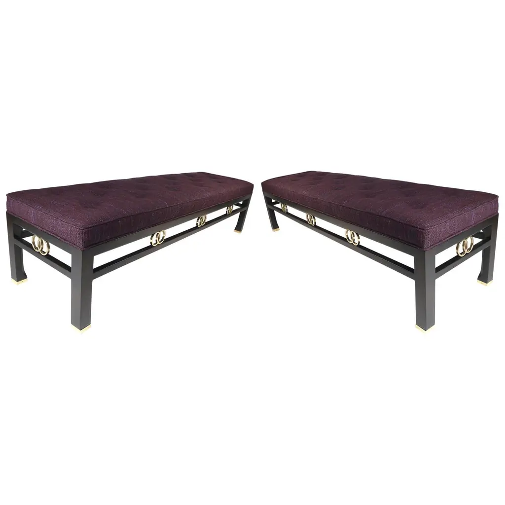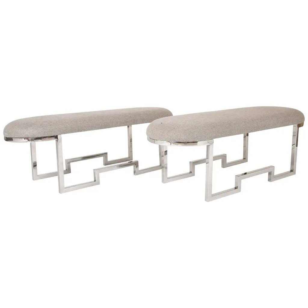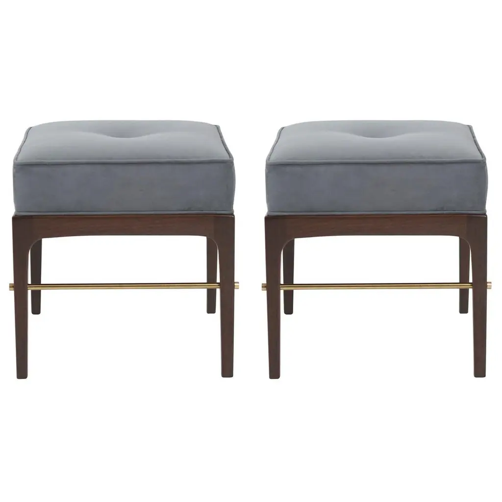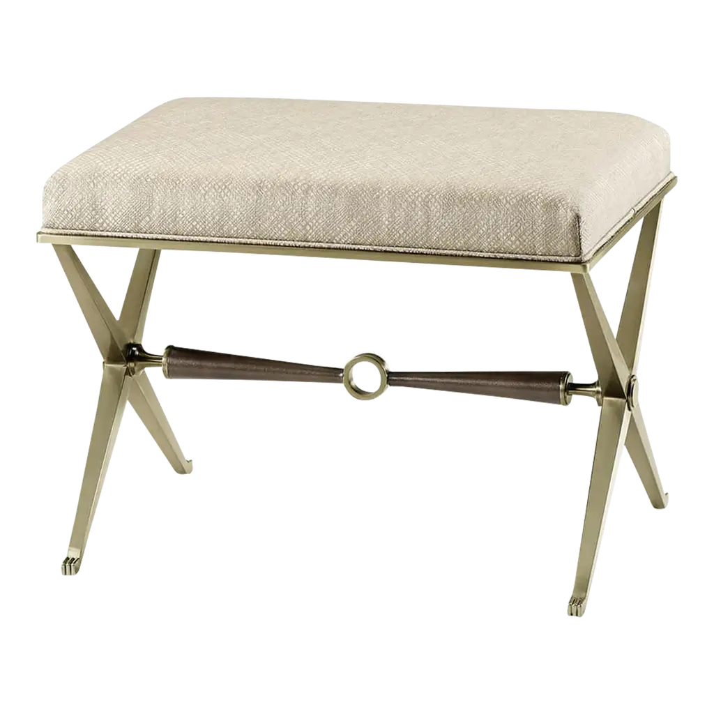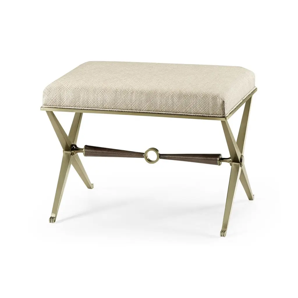 Mid-century X stool, inspired by traditional Spanish ironwork, the base is fabricated from steel and finished in a light, champagne patina. The box cushion seat is upholstered in a performance fabric.Dimensions: 25.5" W x 18" D x 19.25" H.The price is for TWO stools.