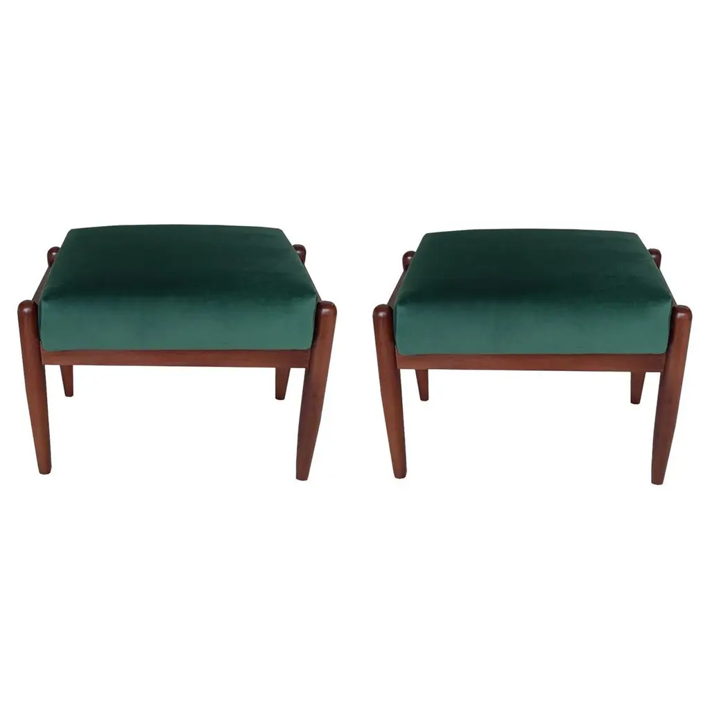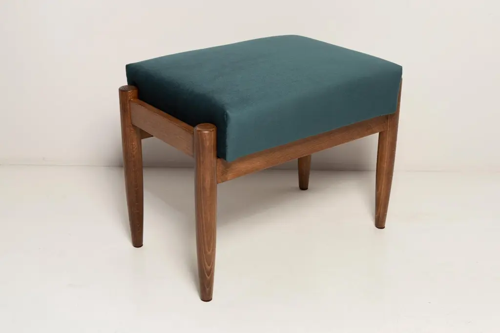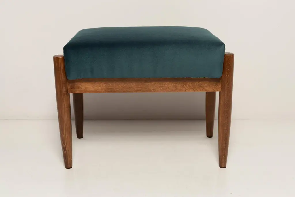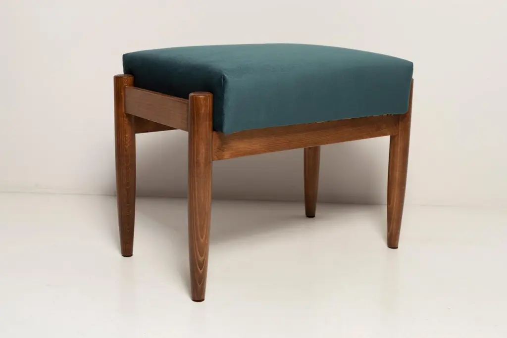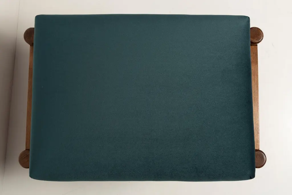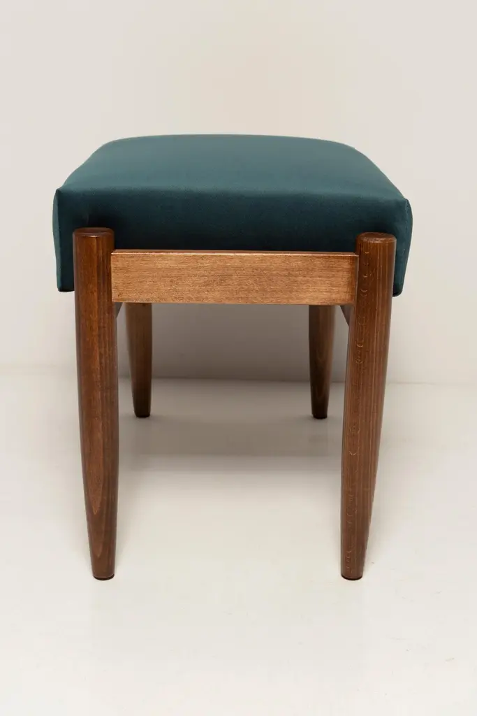 Stools from the turn of the 1960s. Beautiful petrol blue high quality upholstery. The stools consists of an upholstered part, a seat and wooden legs narrowing downwards, characteristic of the 1960s style. We can prepare this stools also in another option of fabric and wood. Please check the last pictures with color samples.
