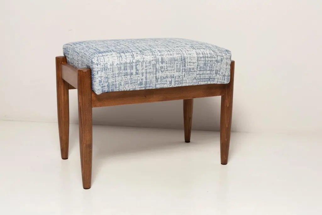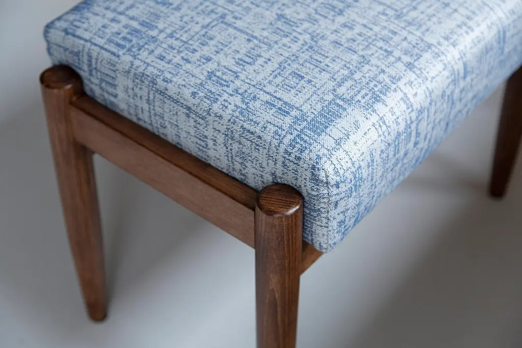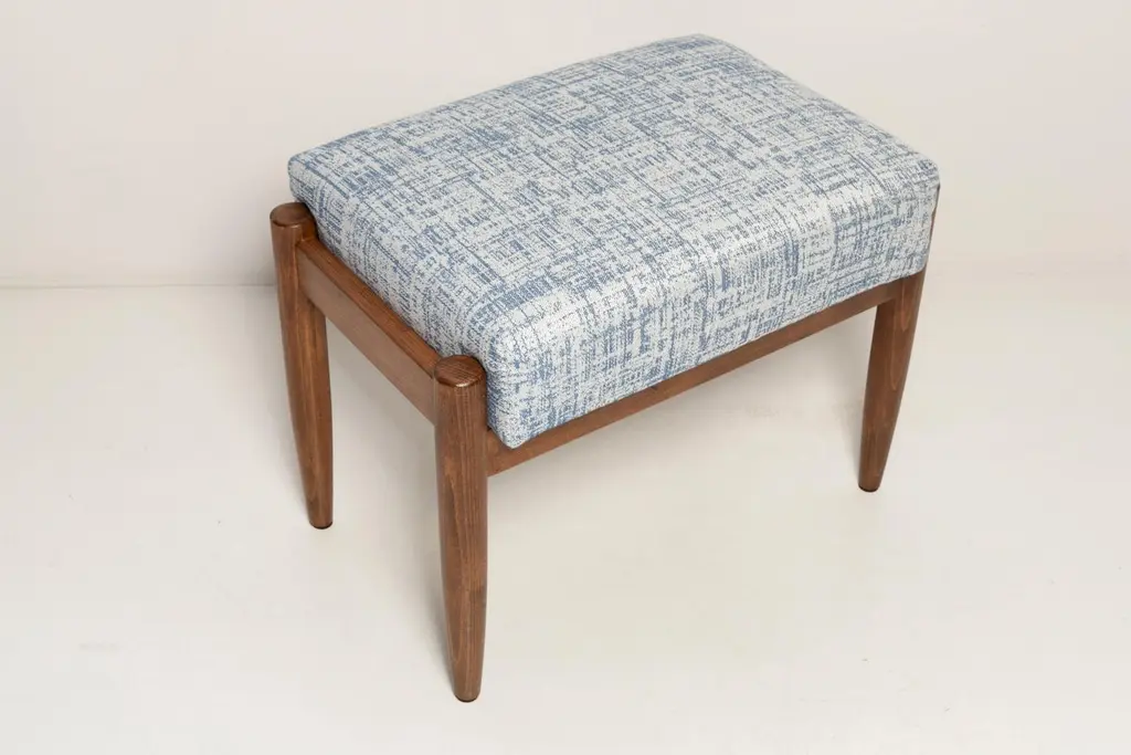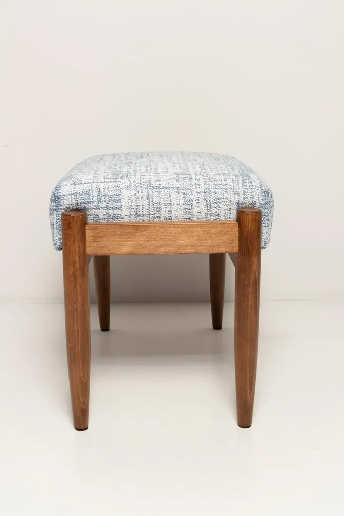 Stools from the turn of the 1960s. Beautiful white and blue high quality linen upholstery. The stools consists of an upholstered part, a seat and wooden legs narrowing downwards, characteristic of the 1960s style. We can prepare this stools also in another option of fabric and wood. Please check the last pictures with color samples.
