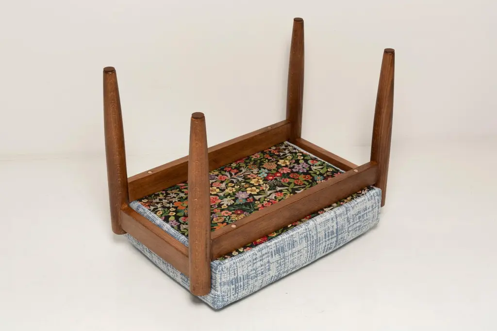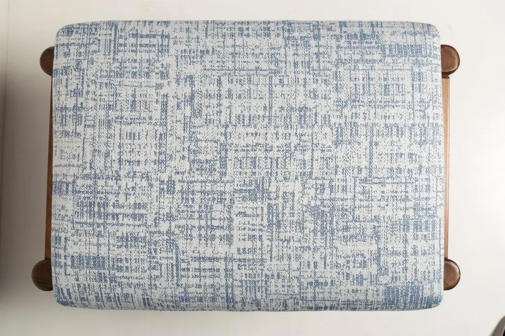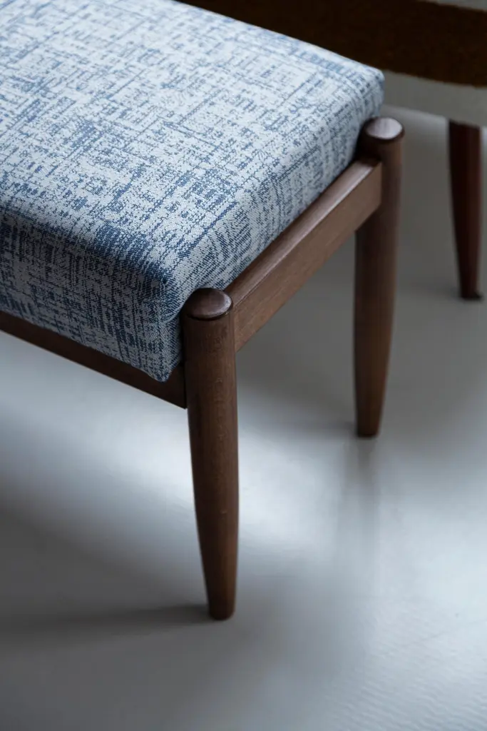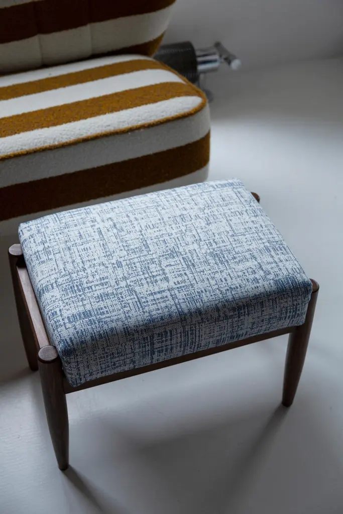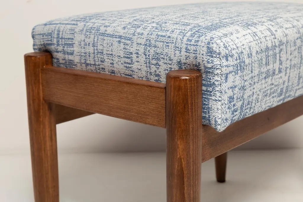 Stools from the turn of the 1960s. Beautiful white and blue high quality linen upholstery. The stools consists of an upholstered part, a seat and wooden legs narrowing downwards, characteristic of the 1960s style. We can prepare this stools also in another option of fabric and wood. Please check the last pictures with color samples.