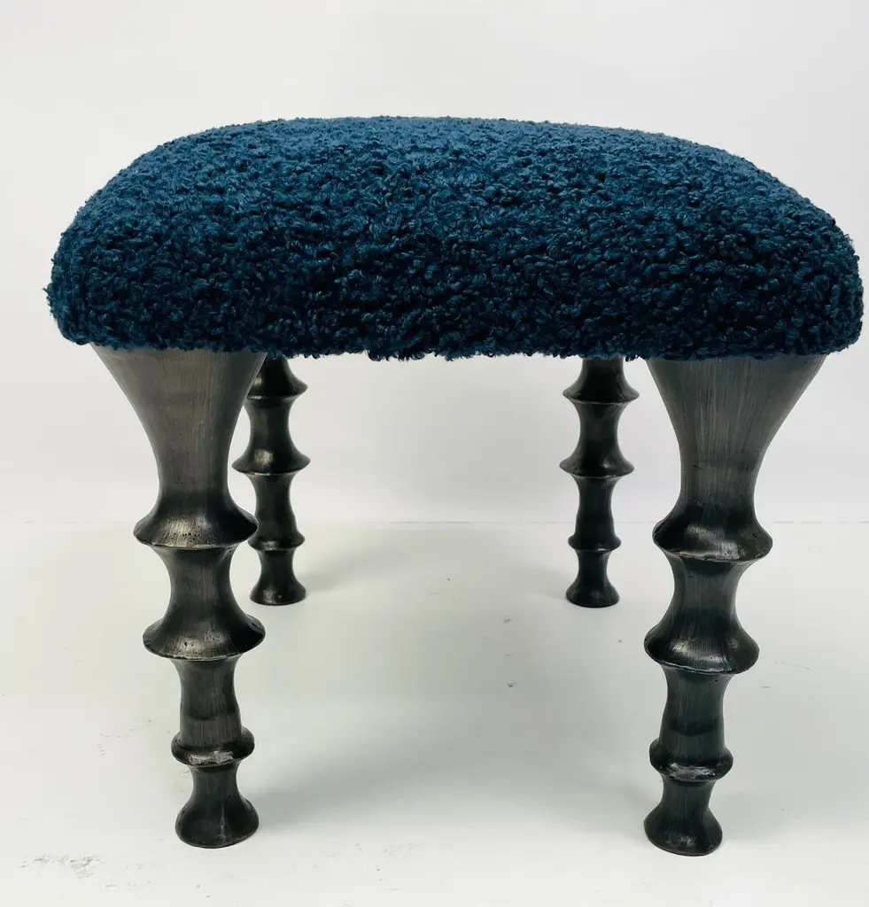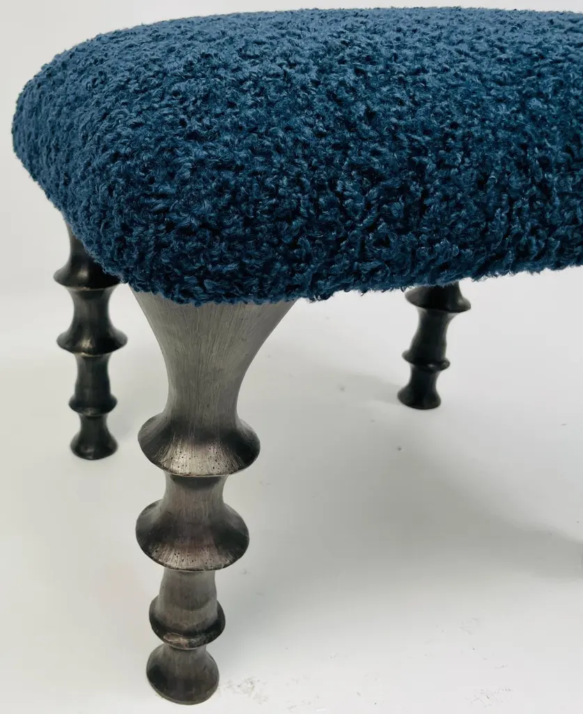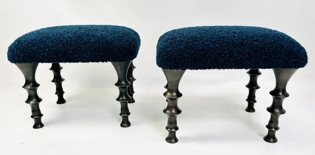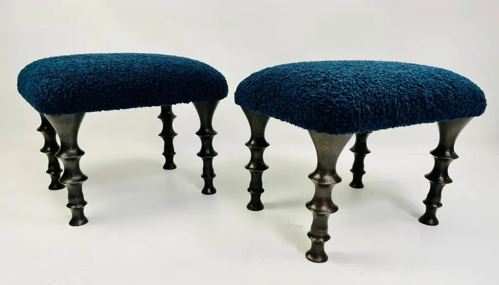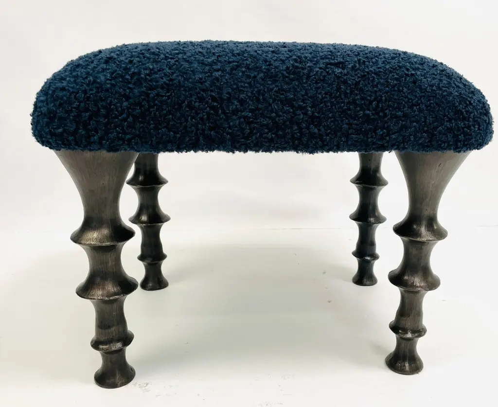 Two stools with cast bronze legs and midnight blue bouclé cushions. The design of the legs have an organic texture. These stools will make a powerful statement in your interior.