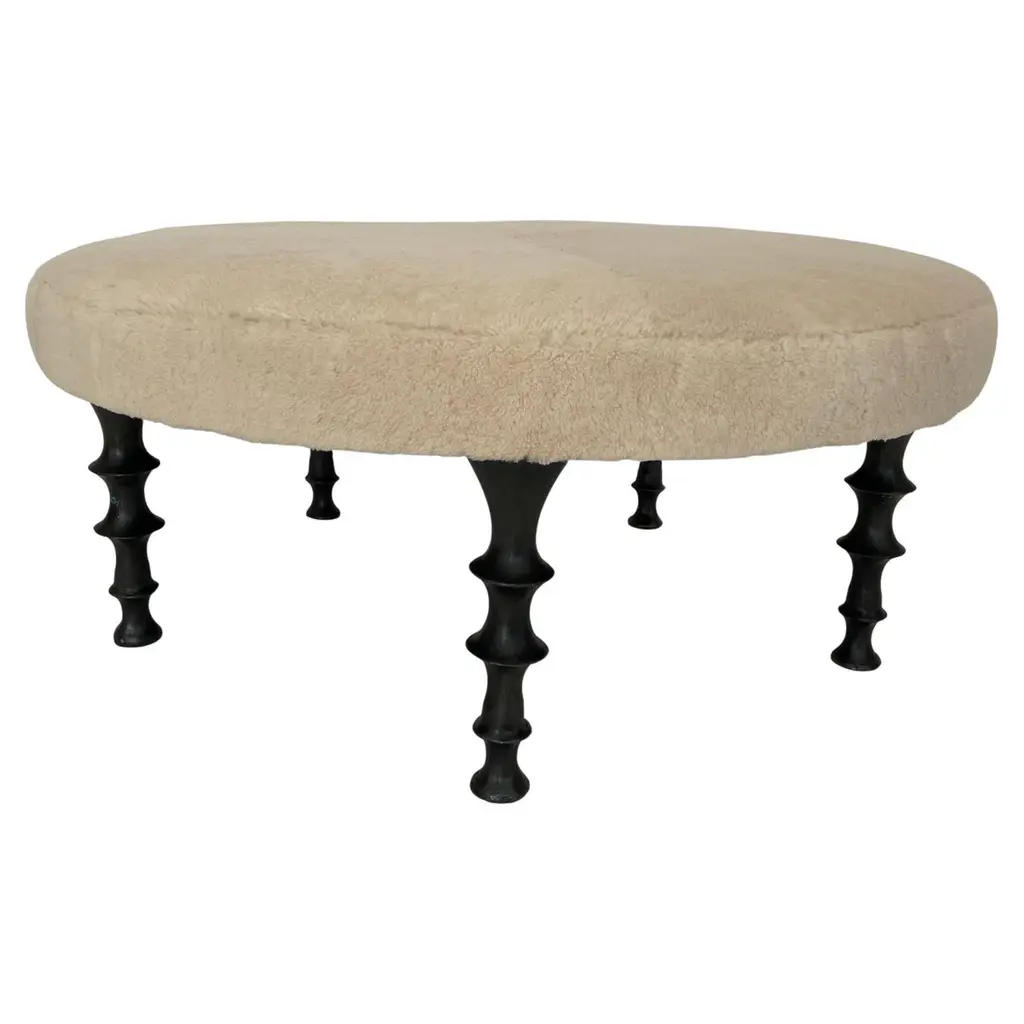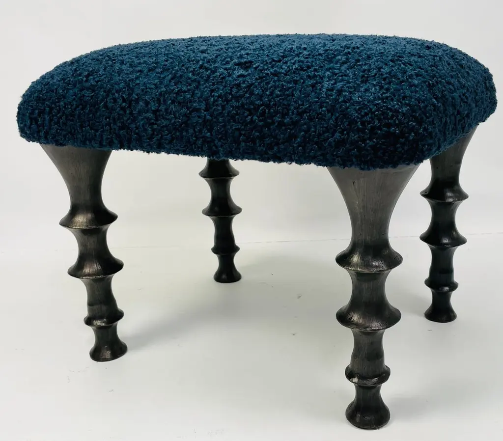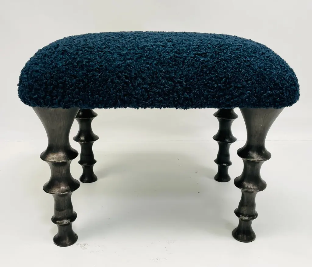 Two stools with cast bronze legs and midnight blue bouclé cushions. The design of the legs have an organic texture. These stools will make a powerful statement in your interior.