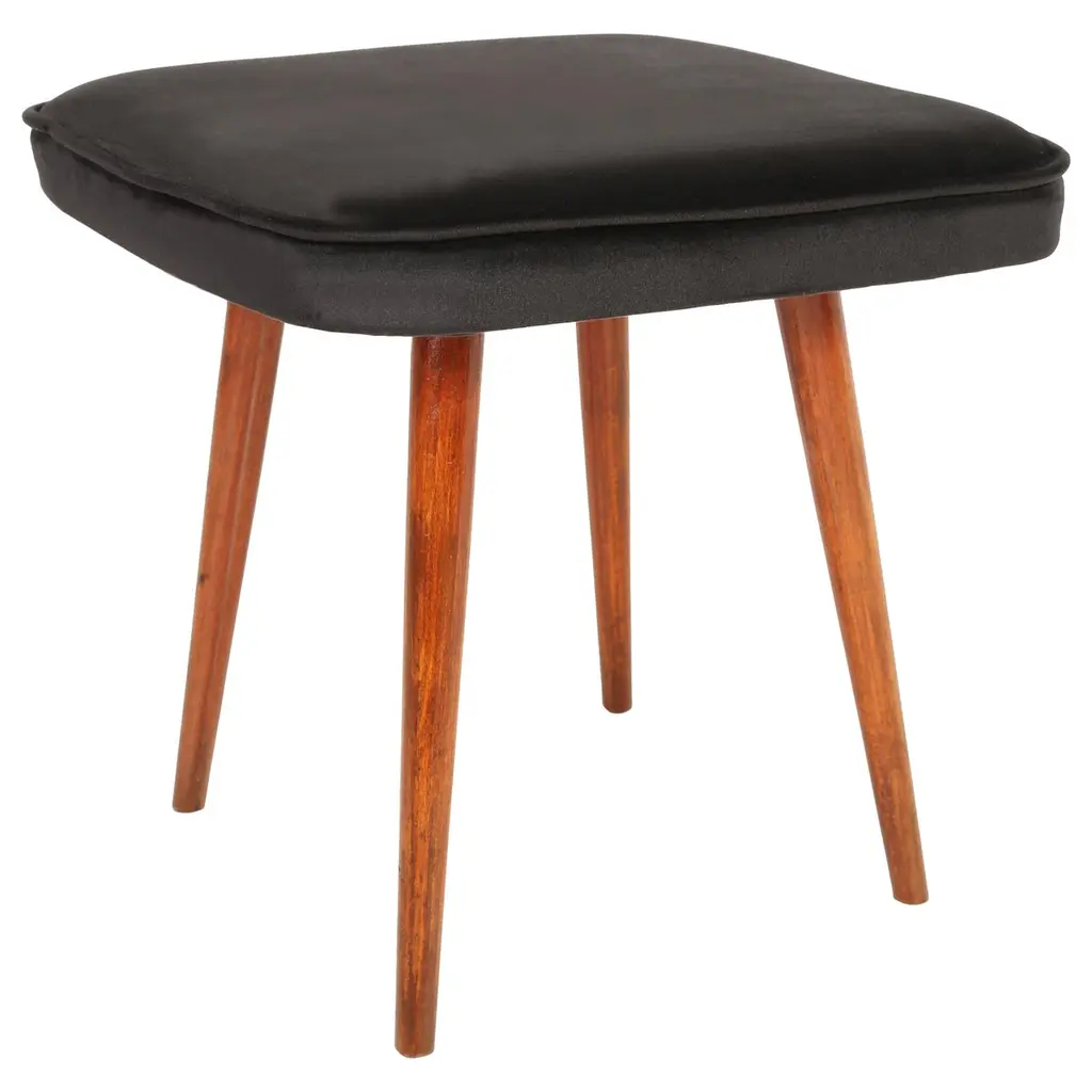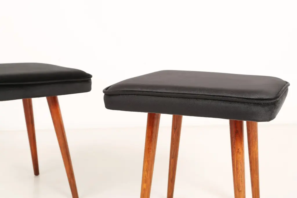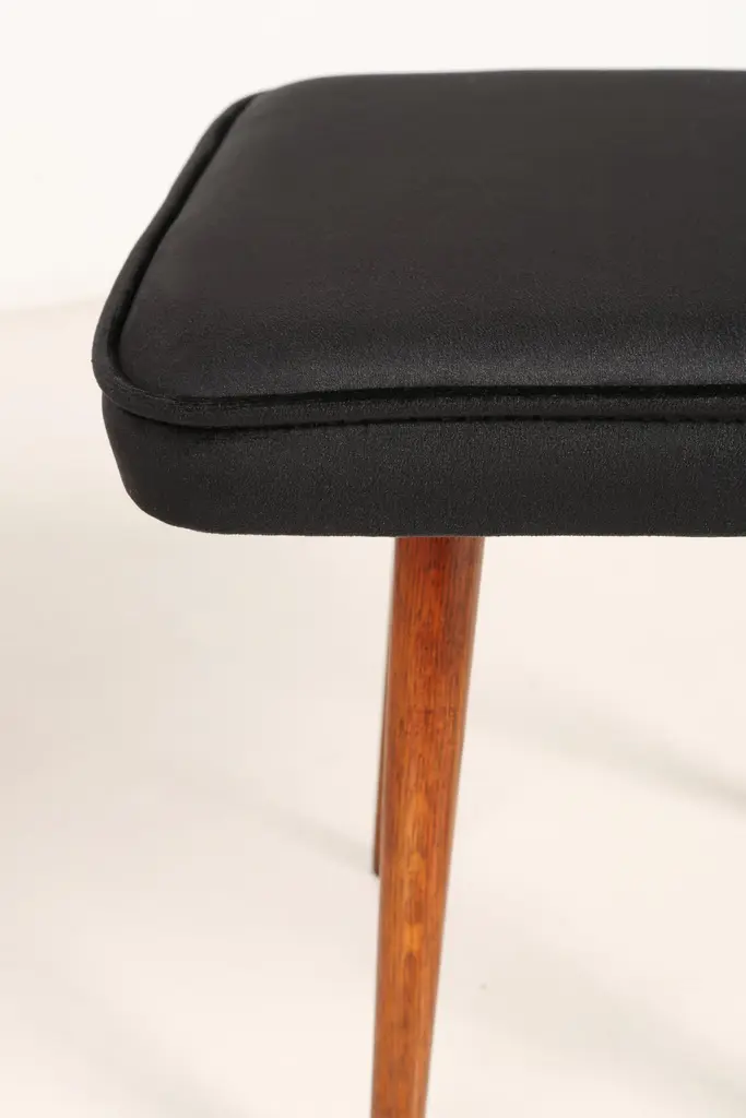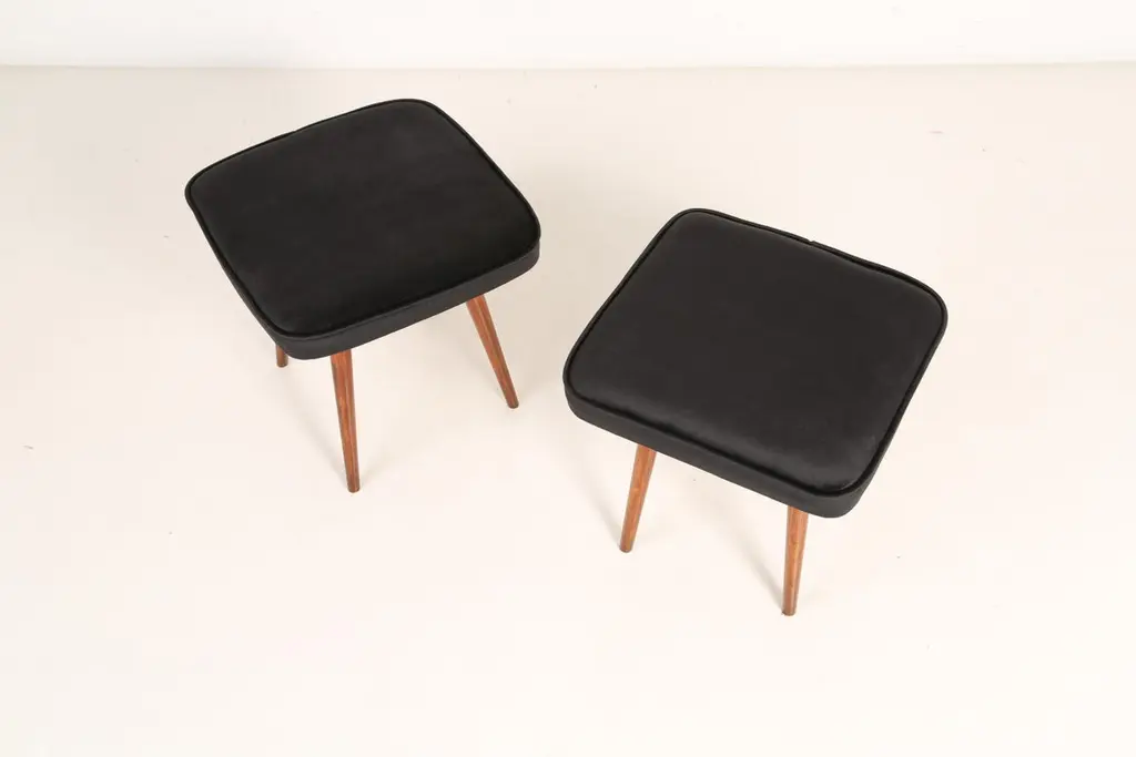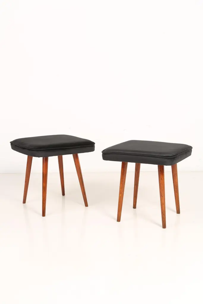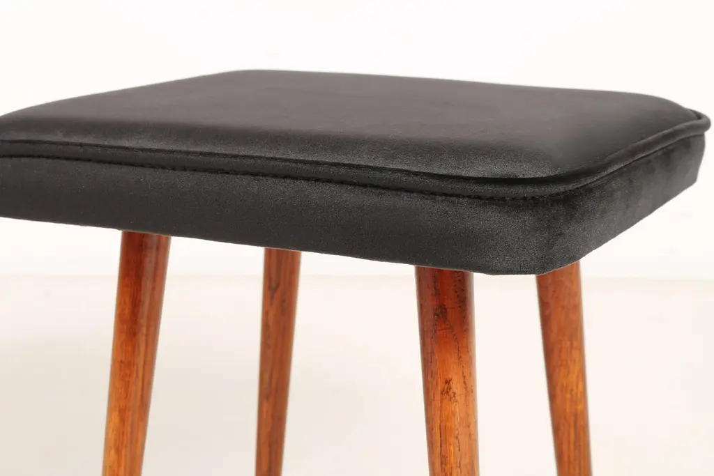 Stool from the turn of the 1960s and 1970s. Beautiful black velvet upholstery. The stool consists of an upholstered part, a seat and wooden legs narrowing downwards, characteristic of the 1960s style. We can prepare this pair also in another color of fabric and wood.