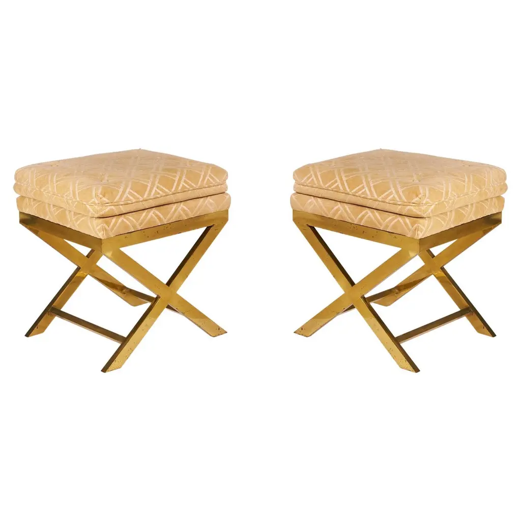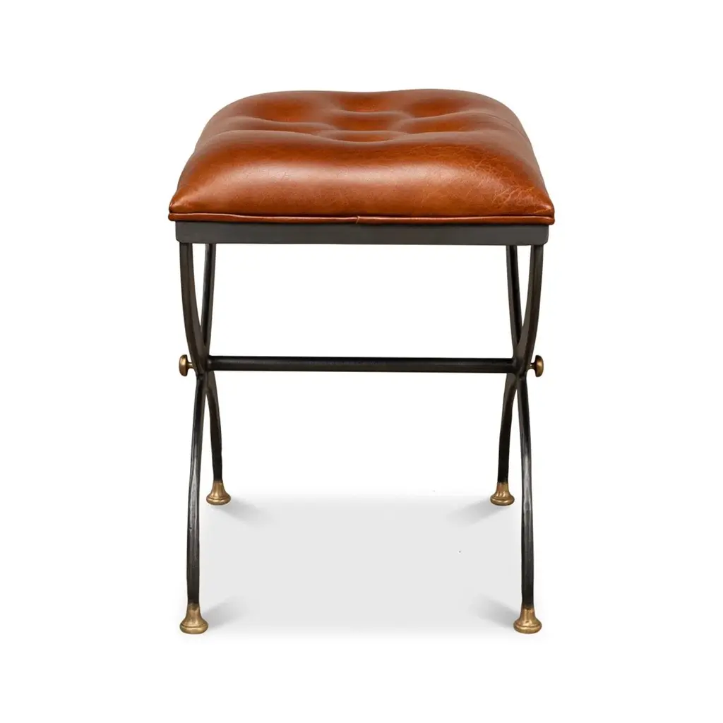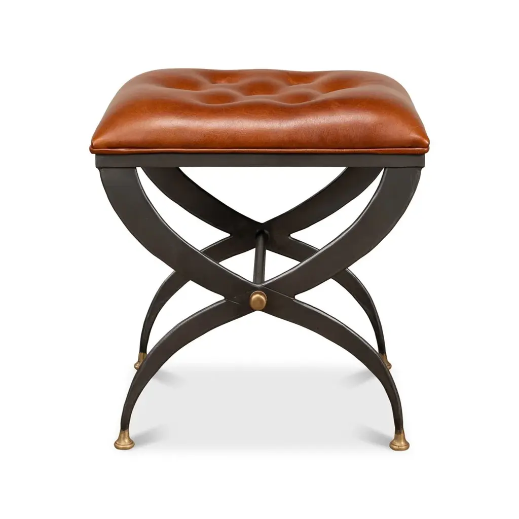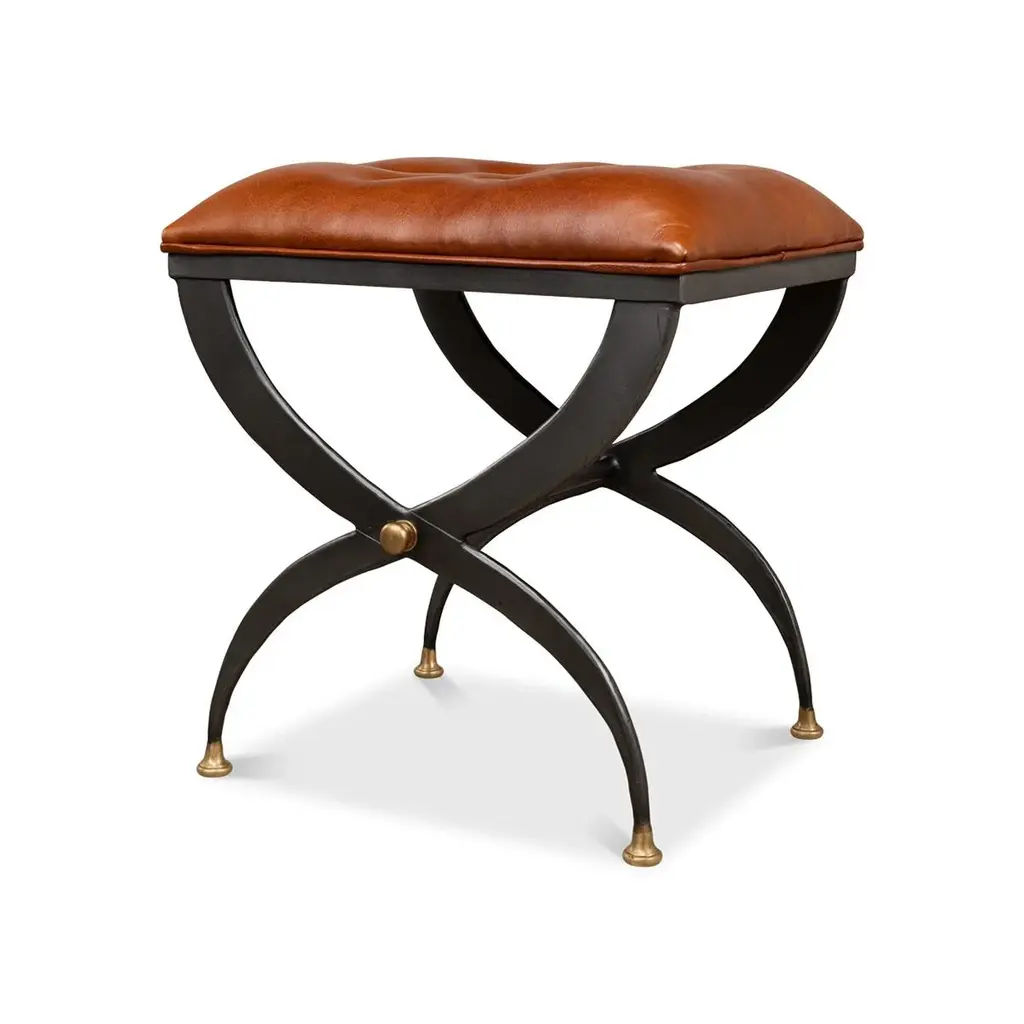 A Modern curule stool with a button tufted leather cushion seat above a pewter-finished iron curule form base with gilded accents. Dimensions: 20" W x 16" D x 21" H