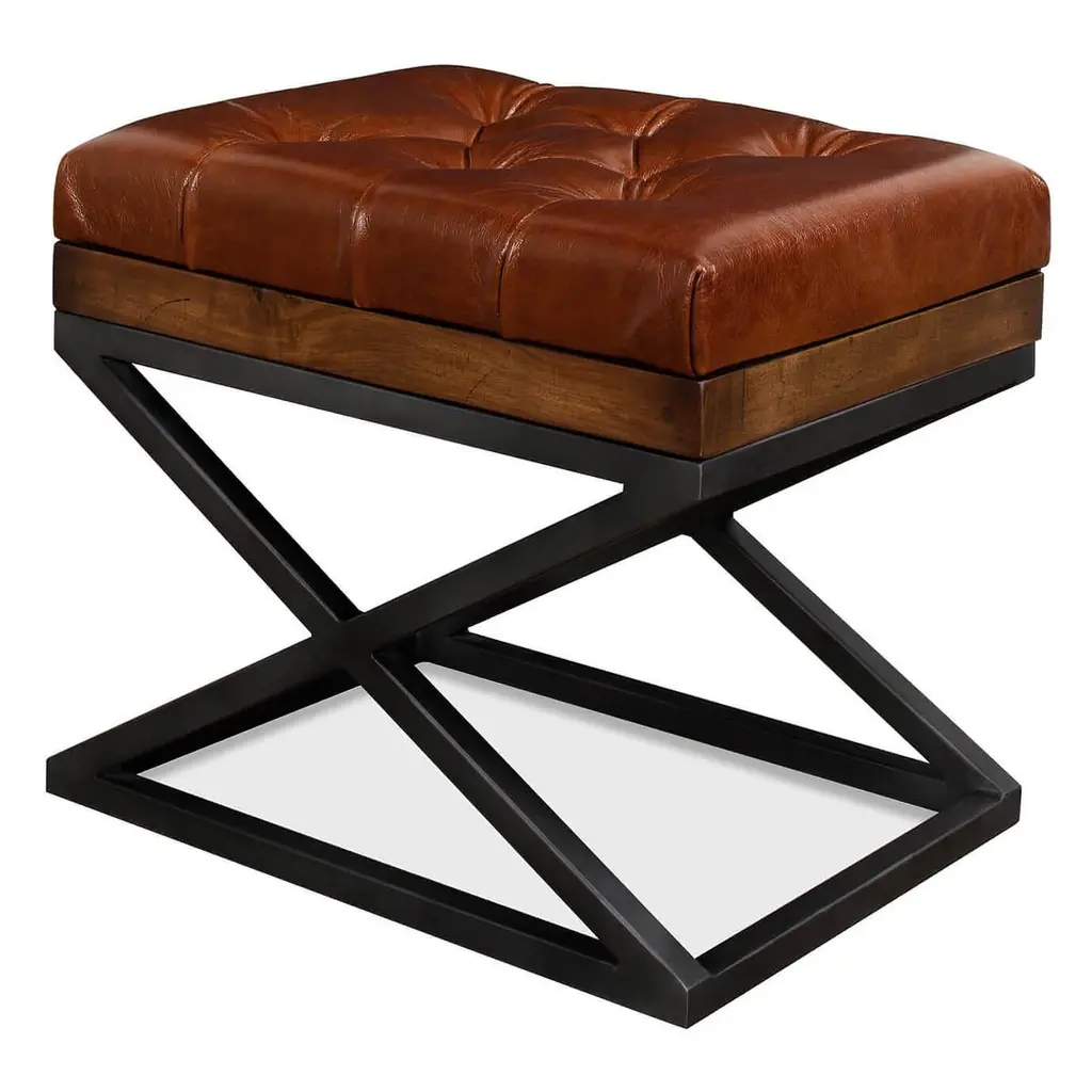 A modern tufted leather X frame stool, classic meets contemporary with this versatile piece. The top boxed cushion is crafted in rich brown leather accented with button tufting, it sits on an x shaped gunmetal frame. This piece is perfect to use as an ottoman or for extra seating. Dimensions: 22" W x 16" D x 18" HColor variation is common and acceptable on vintage-style leather.