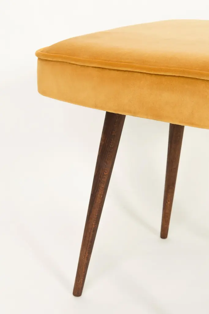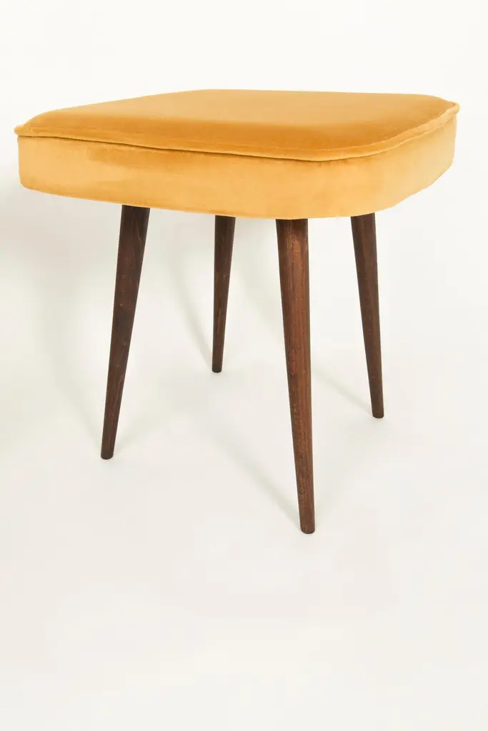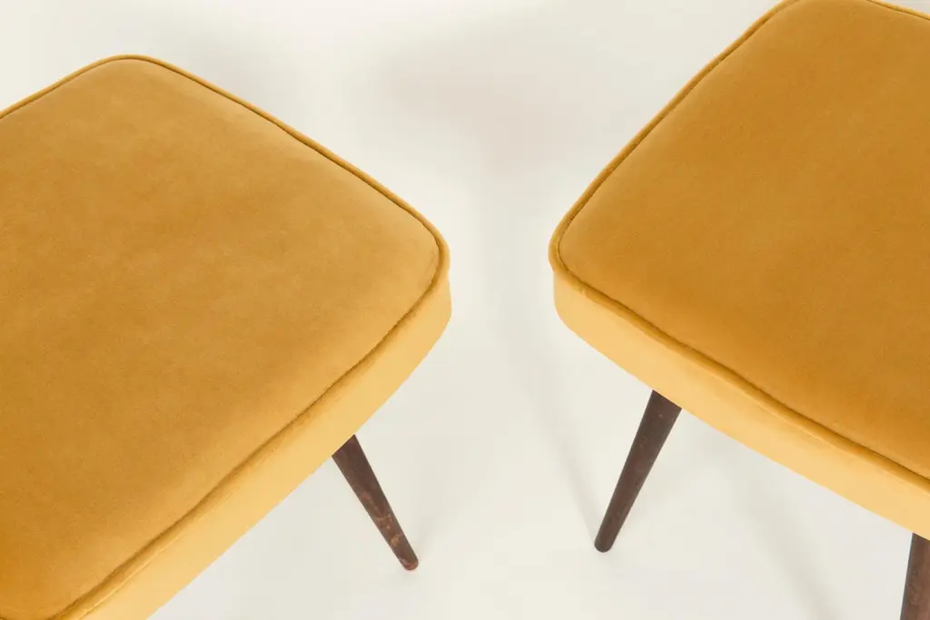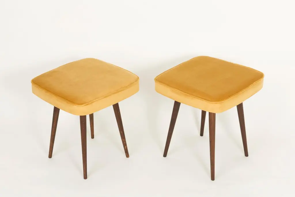 Stools from the turn of the 1960s and 1970s. Beautiful mustard velor upholstery. The stools consists of an upholstered part, a seat and wooden legs narrowing downwards, characteristic of the 1960s style. We can prepare this pair also in another color of fabric and wood.