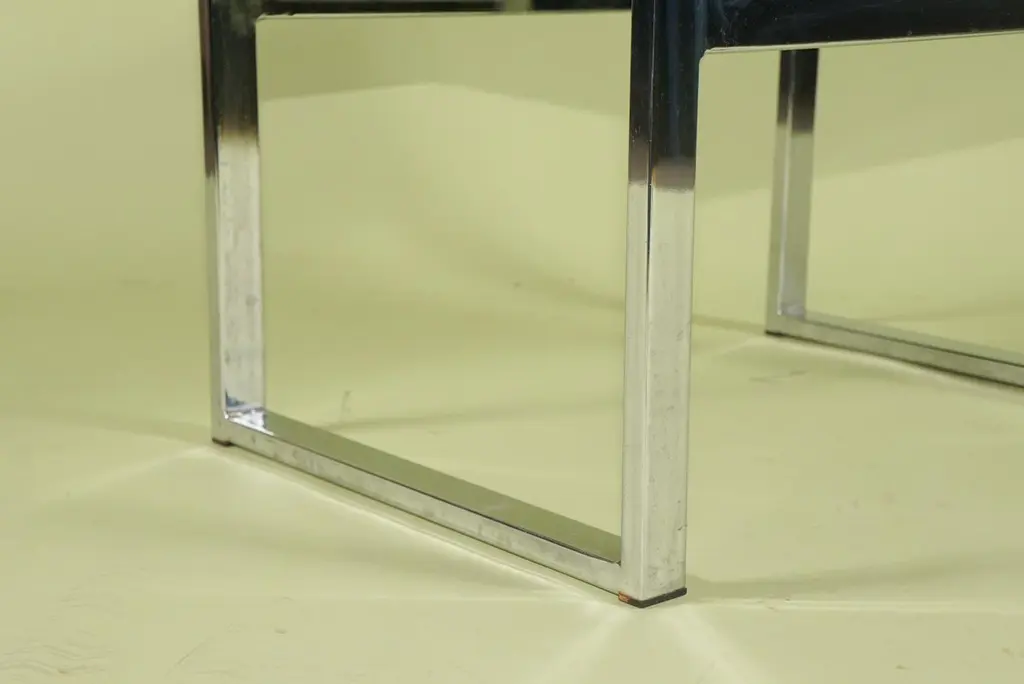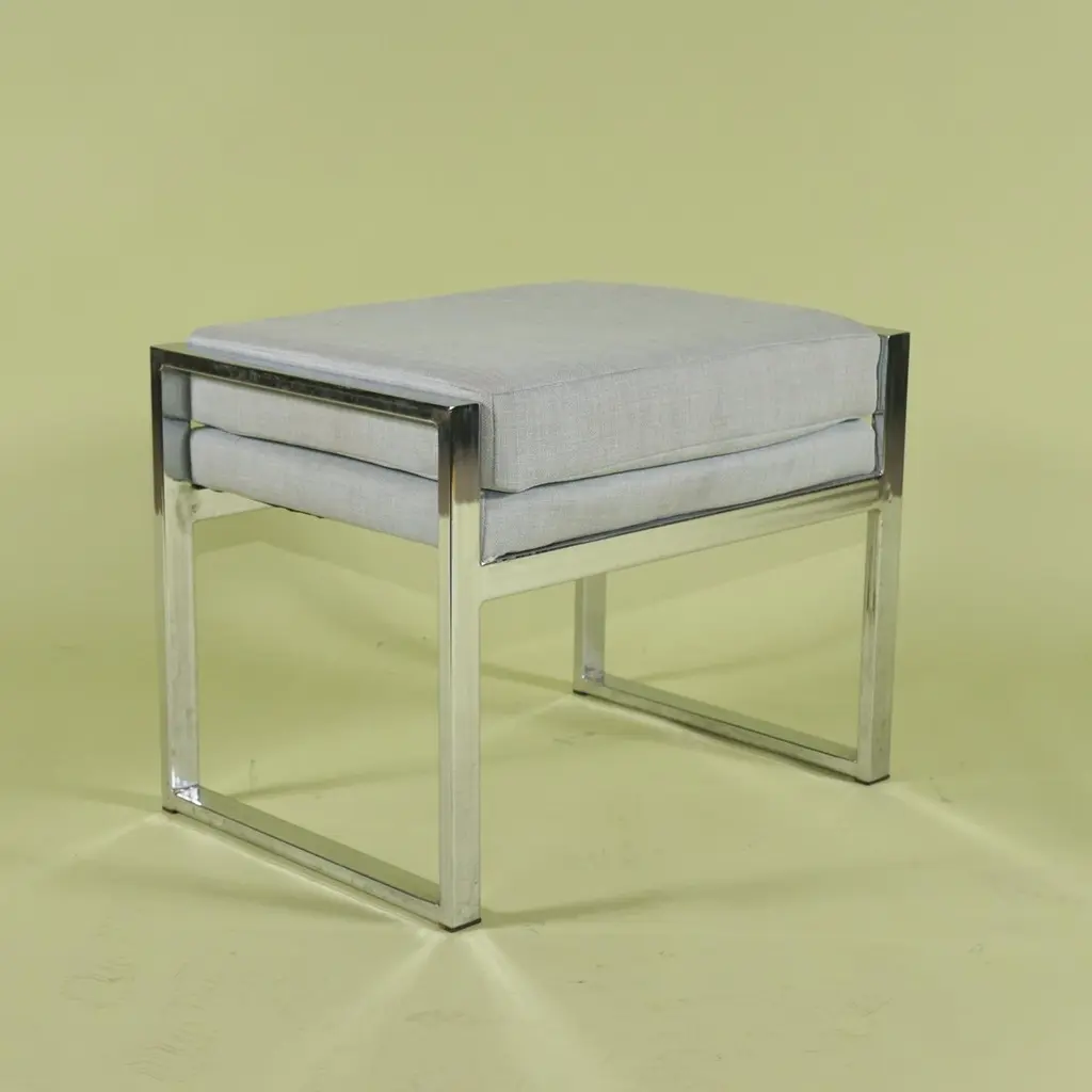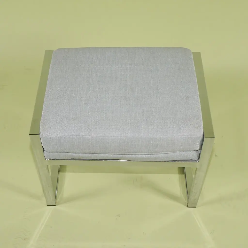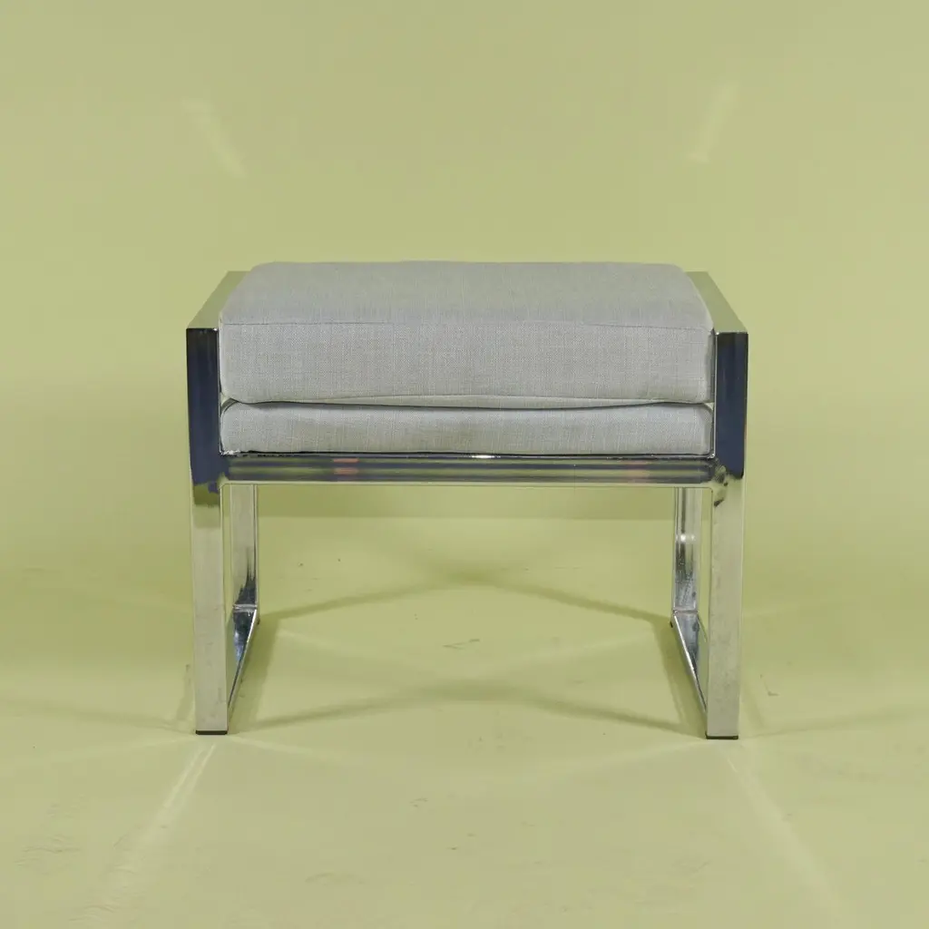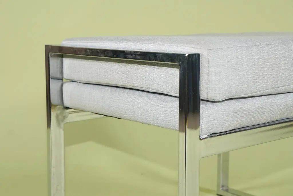 This pair of stools are made of chromed steel and the upholstered seats are easy to remove and cover if so desired. Created in the style of Milo Baughman one of the period's most prolific designers and most associated with his work for Thayer Coggin the sleek modernist design of these stools whoever made them is undisputed. The chrome is in excellent condition with little to no spotting or pitting and as stated the seats simply unscrew and can be covered in a period fabric or dressed up or down depending on a client's desires.