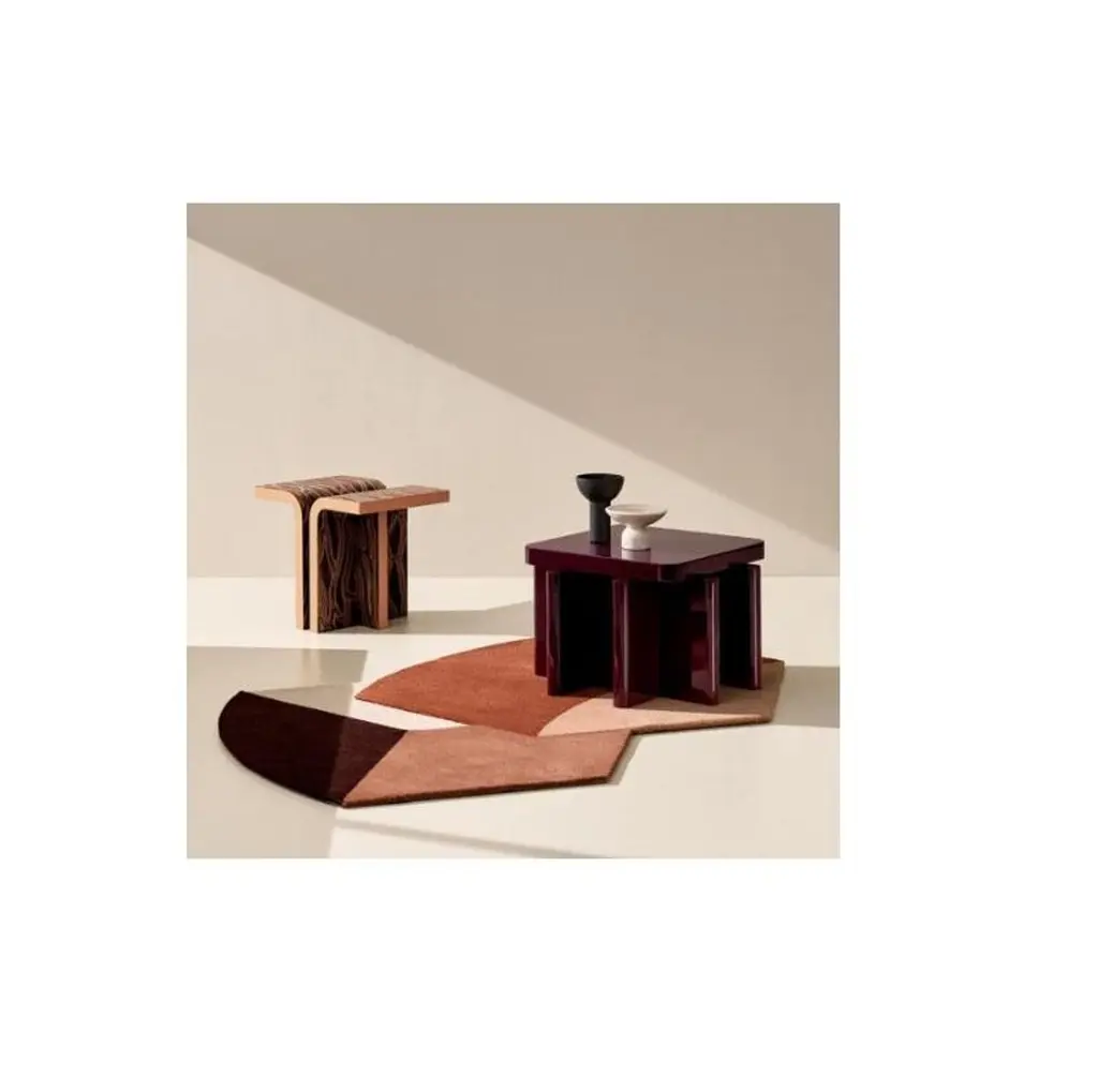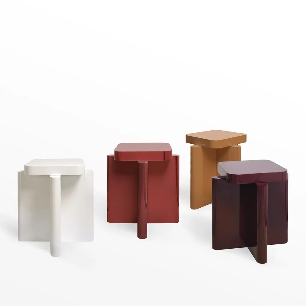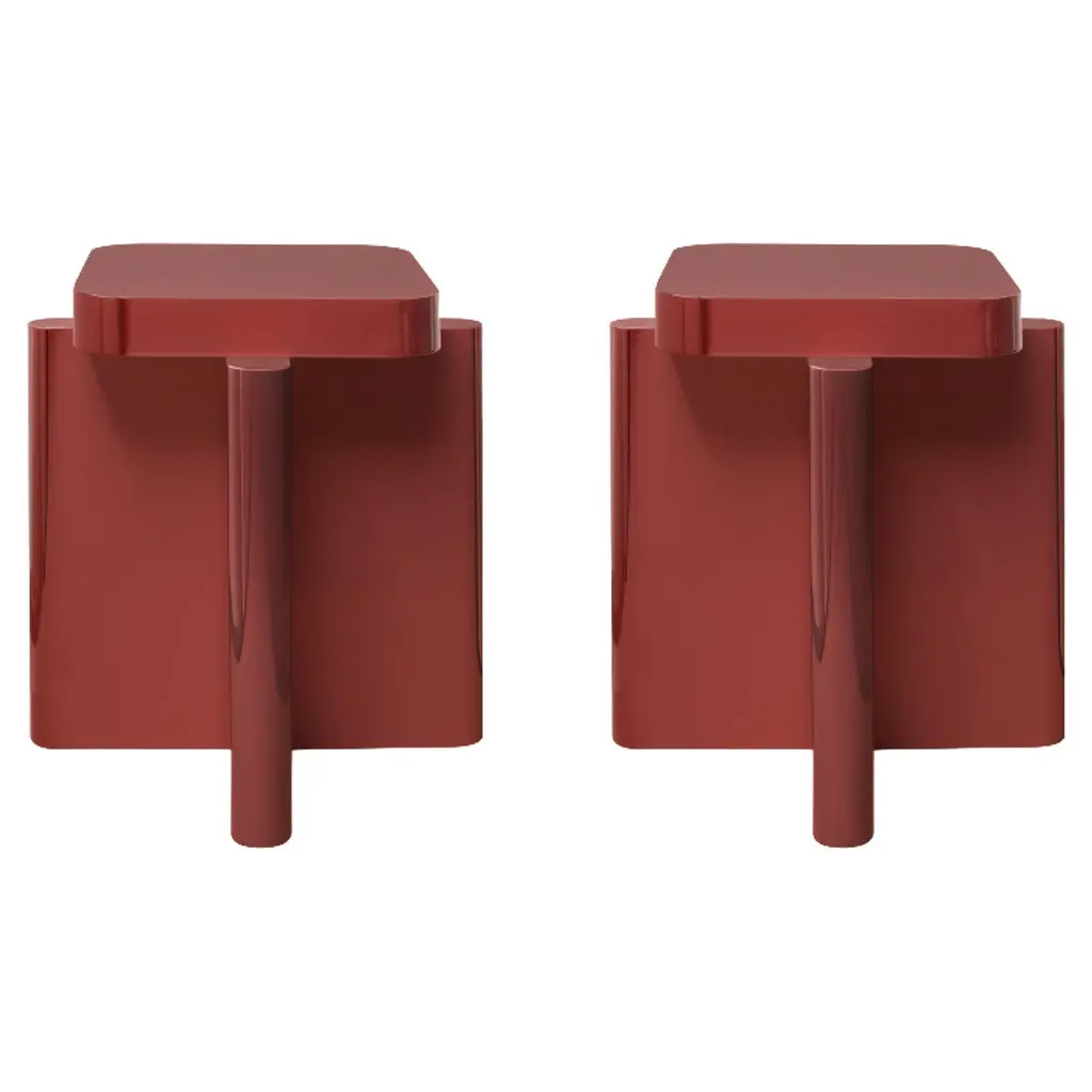 Pair of Rustic Dusty Red Solid Wood Seating Spina Wooden Stool by Cara DavideDimensions: D 40 x W 40 x H 45 cm Materials: wood, lacquered MDF. Also available in colors: bordeaux, caramel, dusty red, off-white, and natural wood.Both size and color can be customized on request.Spina is a collection of lacquered tables and seatings. The lacquered surfaces and consistent rhythm of the planes create a visual play of light, shadow, and reflection, adding depth and richness to this already visually graphic collection. The elements of the line are characterized by a dense skeletal base that supports a smaller horizontal plane along its axis.The thicknesses and proportions of the intersecting vertical planes visually saturate the space underneath its top, creating heaviness as if they were the pedestal for the horizontal plane. There is a visual hierarchy from the heavy plinth to the offset top plane and then to what gets displayed upon its surface.The notion of stacked objects and planes makes it a sort of altar with a totemic and primitive depiction.The collection is now composed of 4 elements in 4 lacquered gloss finishing colors. Both size and color can be customized on request. Completely locally made by expert masters, in Veneto, Italy. Design studio based in Milan, is a collaboration between Cara Judd (South Africa) and Davide Gramatica (Italy). Graduating in product design from IED Milan, Cara and Davide started their professional careers in diverse areas ranging from apprenticing with artisans to working with industrial companies before merging their experience in 2016. They work in the fields of product design, event curation and offer creative consultancy to studios and private clients. Cara and Davide both lecture in the Product Design Department at IED Milan. Passionate about craftsmanship, they also produce their own series of products working together with artisans in Italy and South Africa.MedulumAn ancient river flowing in the green countryside of the Veneto hinterland, between emerged lands and swamps that have now disappeared. Medulum, one of the favourite waterways of the Venetian aristocracy of old, indispensable for reaching their country homes.This is where our work draws its inspiration. We combine the experience of 40 years with innovative solutions, collaborating with architect and designer studios in the search and experimentation of new languages, through the craftsmanship of artisanal productions.Medulum has been designing and making furniture and accessories by searching for and experimenting with new languages, collaborating with architects and designers, with the craftsmanship typical of artisanal productions.