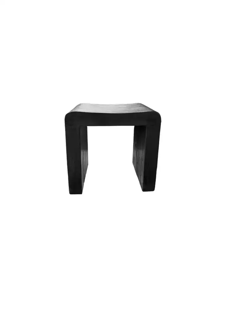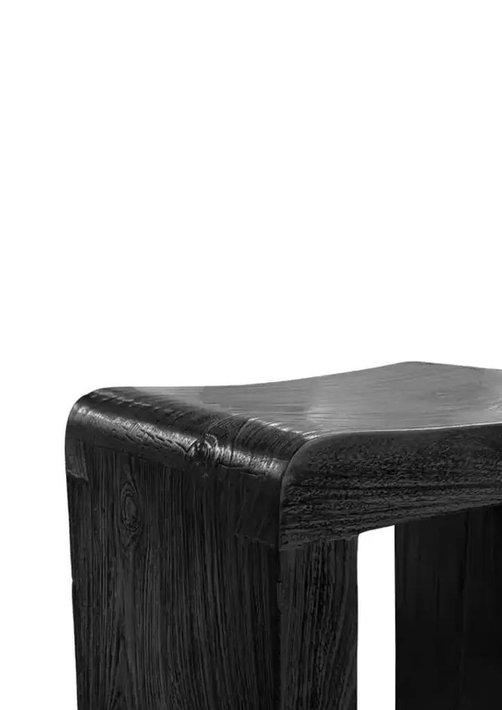 A pair of wonderfully sculptural teak wood stools featuring curved seats. The mix of wood textures and shades adds to their charm. Their neutral color and minimalist shape make them suitable for any space. To achieve their dark black pigment the wood was burned several times and finished with a clear coat.