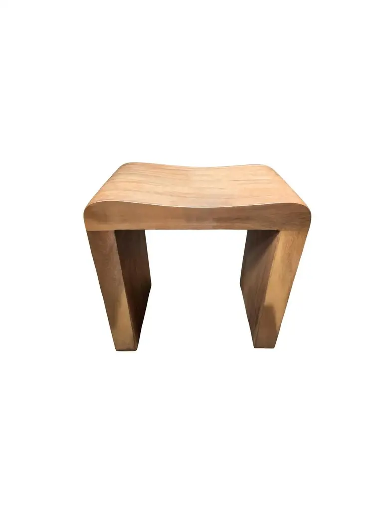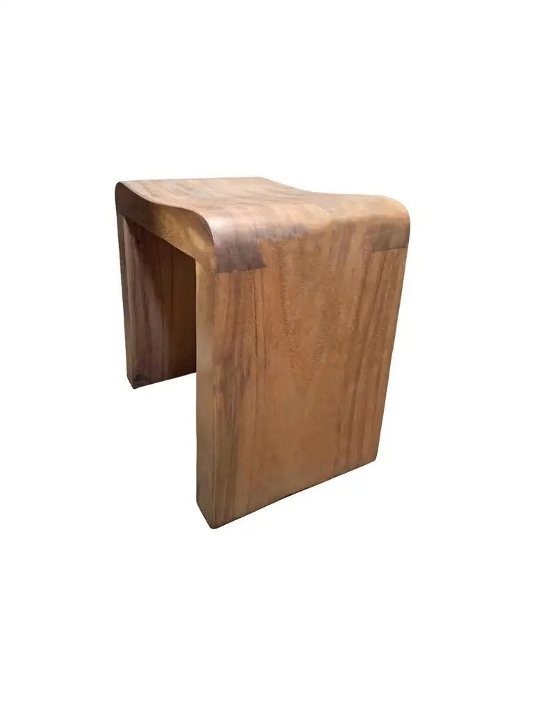 A pair of wonderfully sculptural teak wood stools featuring curved seats. The mix of wood textures and shades adds to their charm. Their neutral color and minimalist shape make them suitable for any space. They are sanded and smoothed many times over to reveal flowing wood textures and smooth surface.