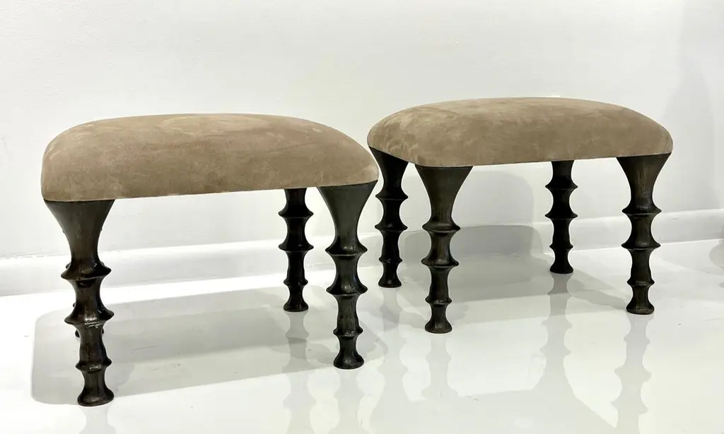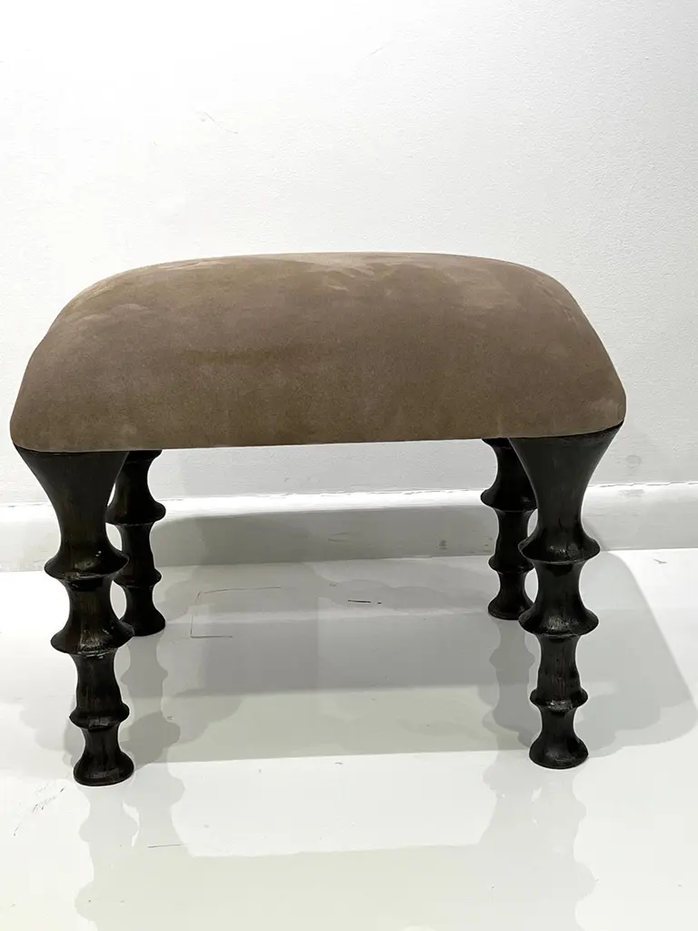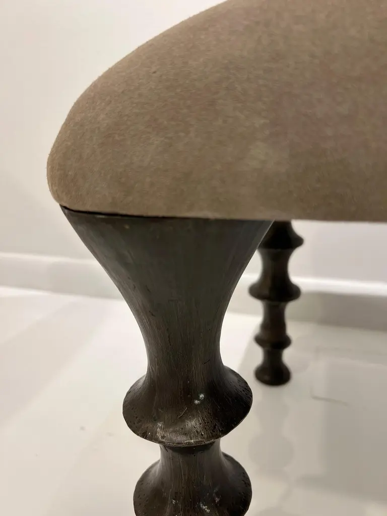 Two stools with cast bronze legs and a brown suede cushions. The design of the legs have an organic texture. These stools will make a powerful statement in your interior. Stools can also be made custom in different size and upholstery. (COM).