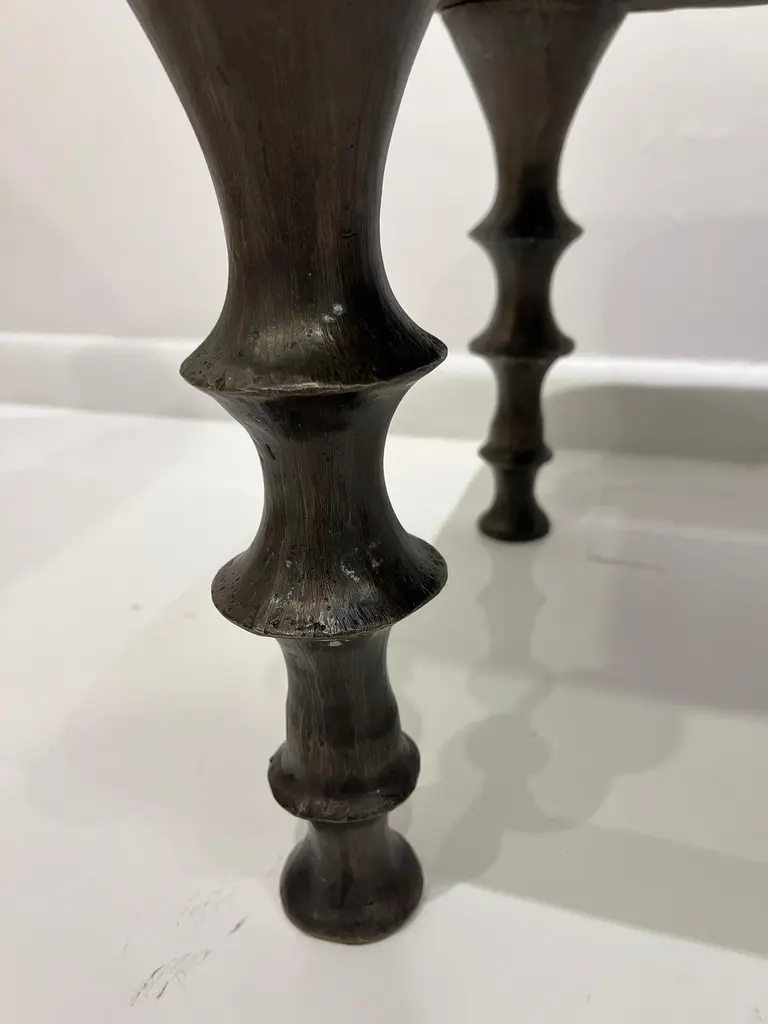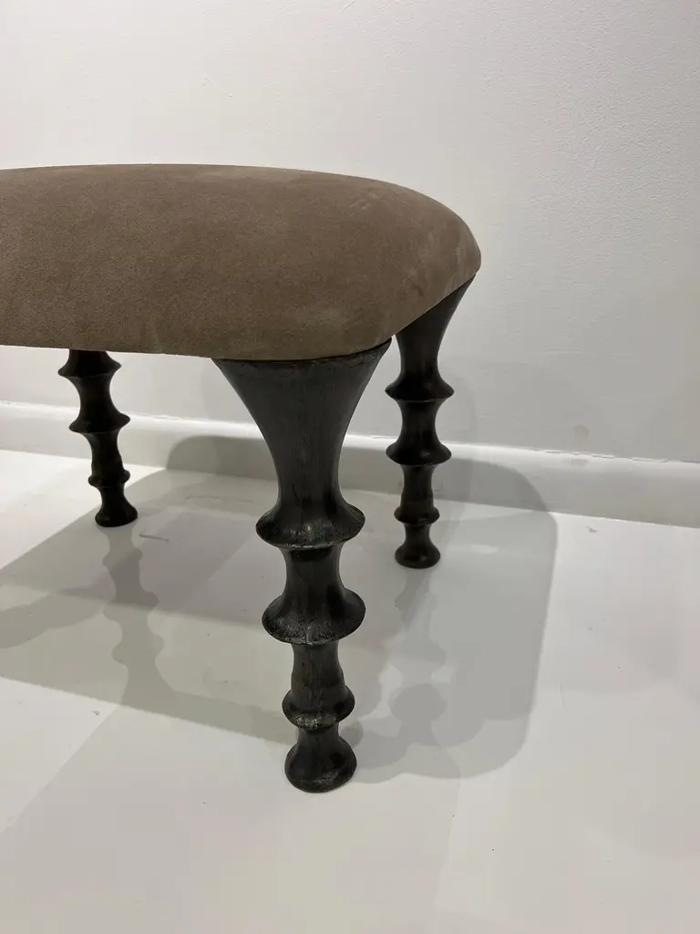 Two stools with cast bronze legs and a brown suede cushions. The design of the legs have an organic texture. These stools will make a powerful statement in your interior. Stools can also be made custom in different size and upholstery. (COM).