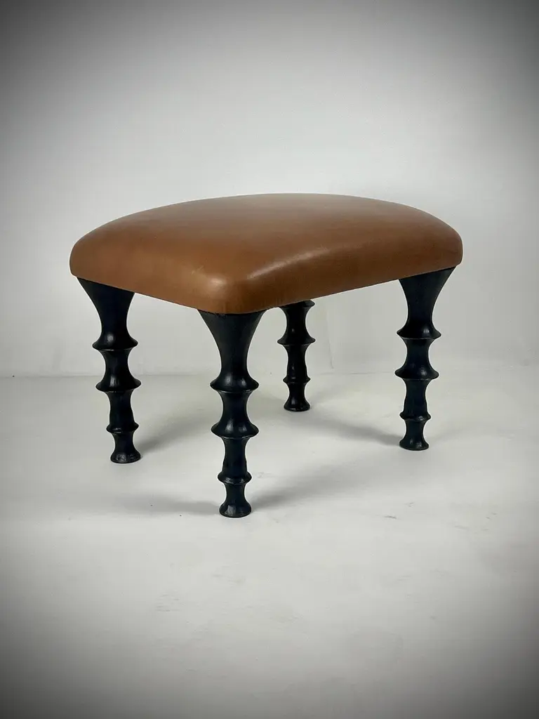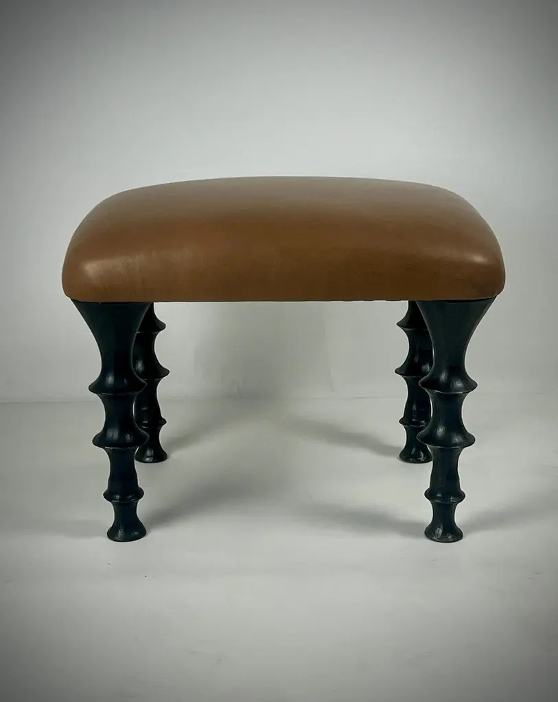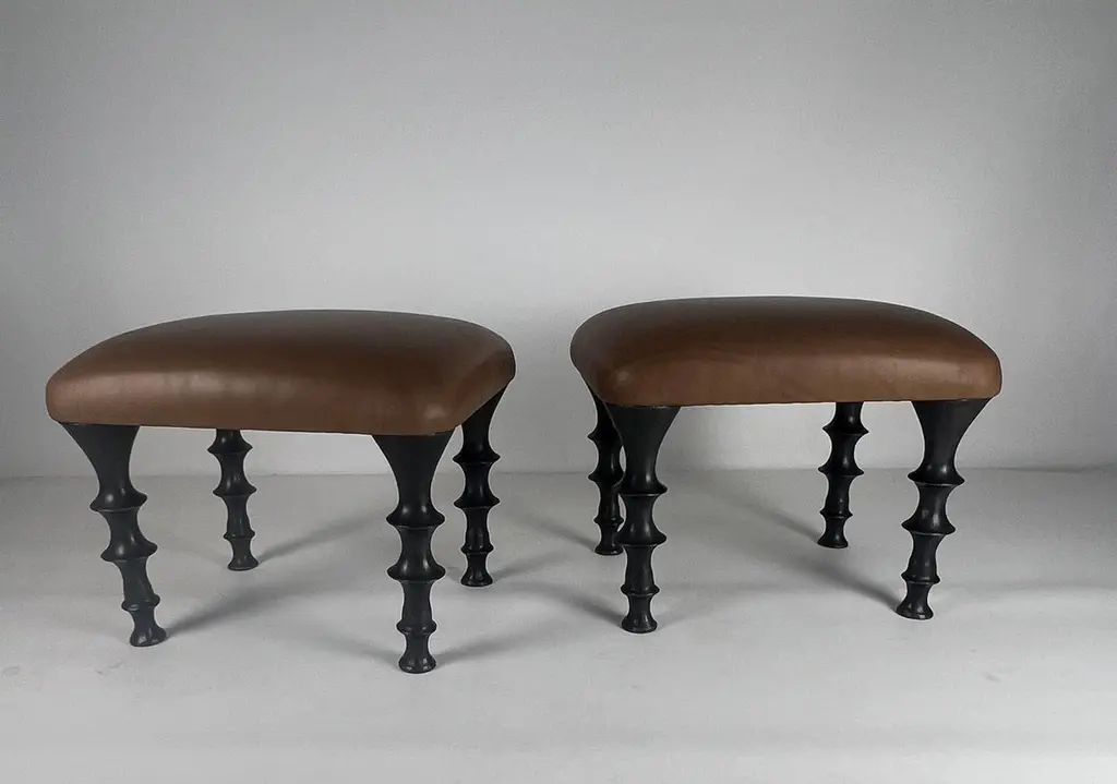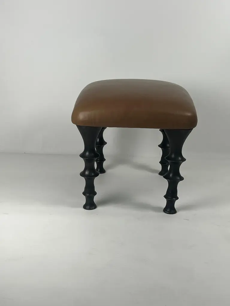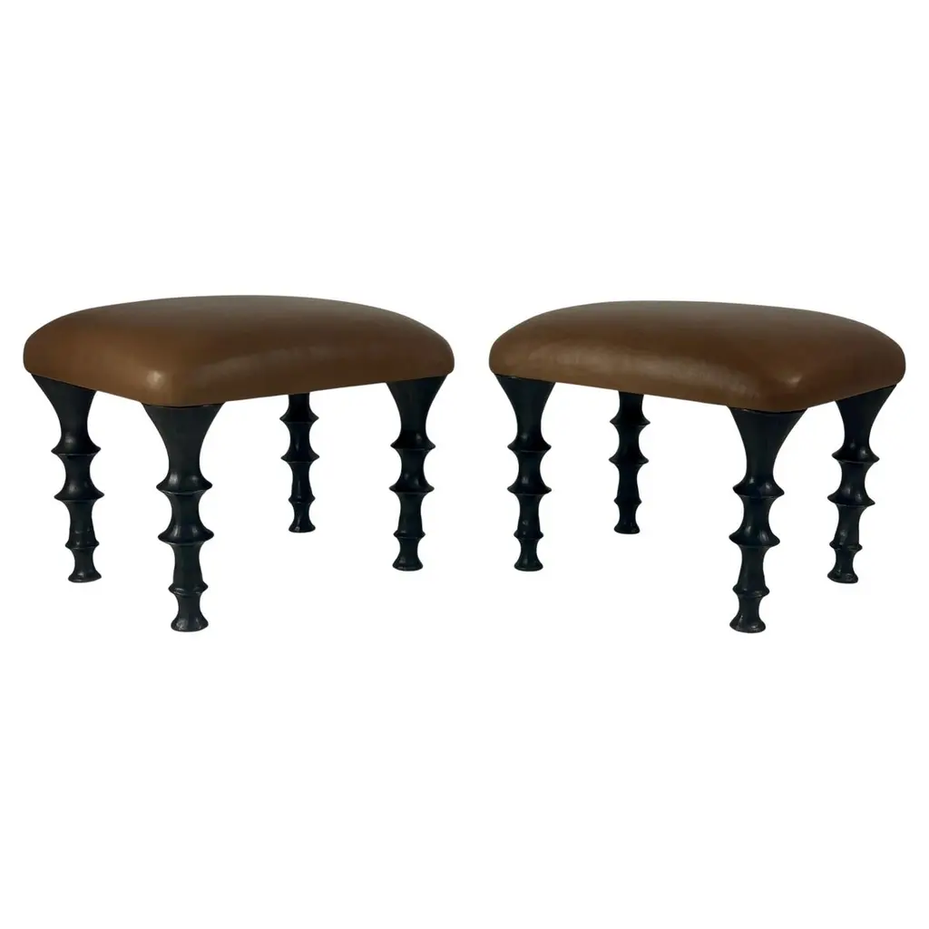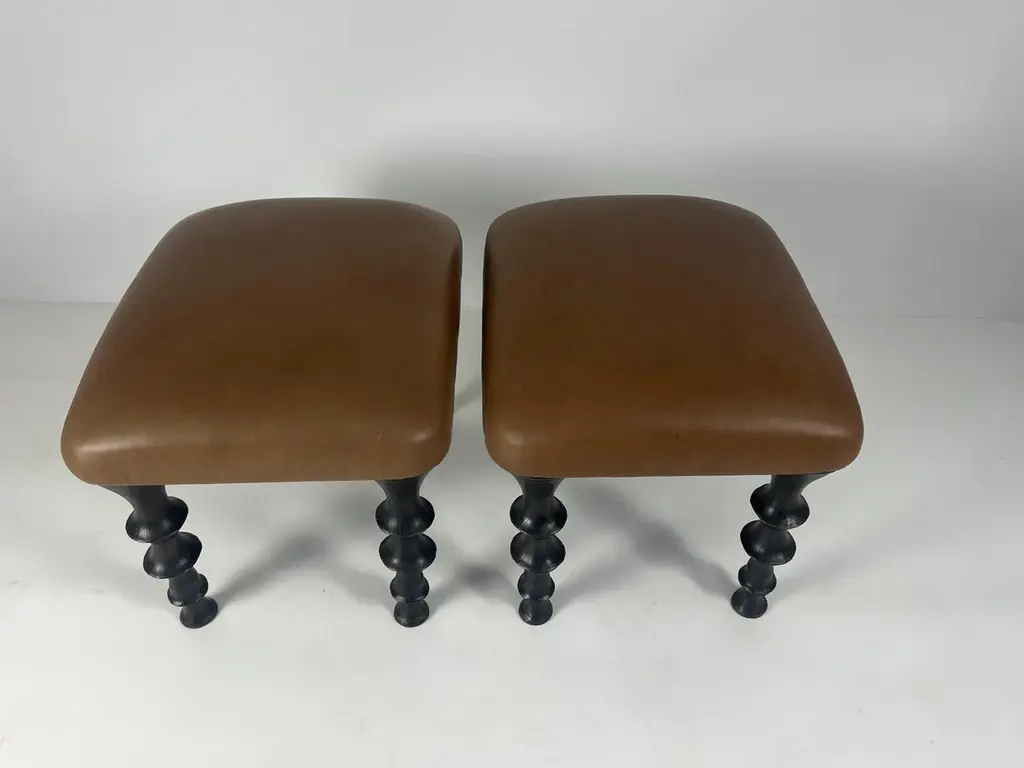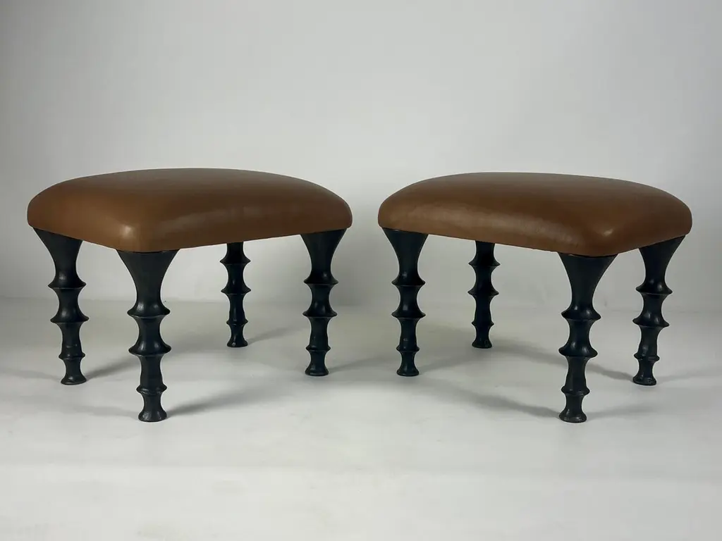 Two stools with cast bronze legs and a brown leather cushions. The design of the legs have an organic texture. These stools will make a powerful statement in your interior. Stools can also be made custom in different size and upholstery. (COM).