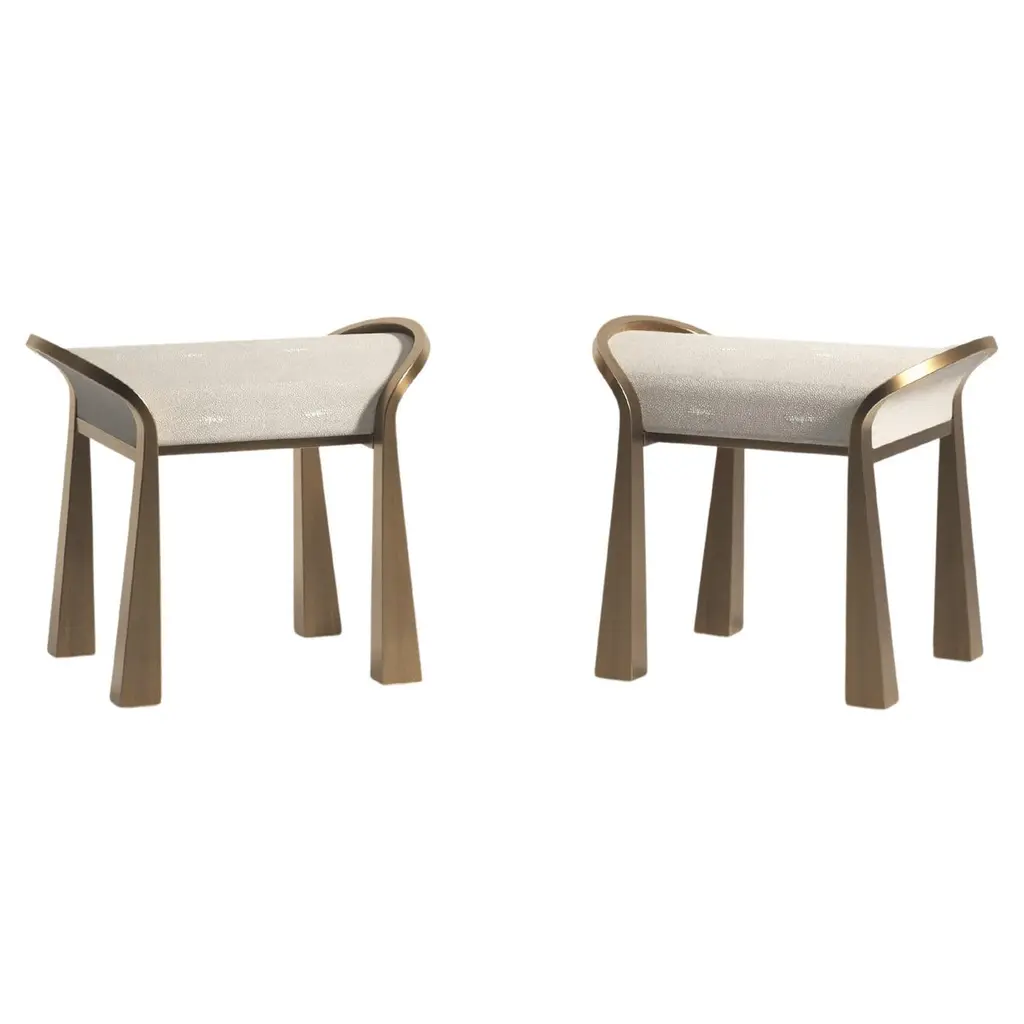 The Paris based label has distinguished themselves since their launch, with their iconic use of shagreen mixed with brass and other exotic materials. All furniture is handcrafted by skilled artisans, ultimately making each piece unique, designed in Paris and produced in the Philippines.The Arche Stool by R&Y Augousti is a stunning piece, a statement in any space. The black velvet upholstered seat is nestled in between a pair of bronze-patina brass sculptural cutout "arched" legs. This design also exists inlaid in shagreen or client COM and as a bench, see images at end of slide. Sold as a pairThe dimensions of this piece are 61 x 43.8 x 52.6 cm (seat height 37cm)All R&Y Augousti pieces are handmade by artisans, ultimately making each piece unique.Custom color/sizing available on request.Wipe clean with soft dry cloth. Acclaimed design duo Ria & Yiouri Augousti have established themselves since the 1990’s as pioneers of modern-vintage style through their luxurious art-deco inspired collections.The Paris based label has distinguished themselves since their launch, with their iconic use of shagreen mixed with brass and other exotic materials. All furniture is handcrafted by skilled artisans, ultimately making each piece unique. All shagreen-covered items should be kept out of direct sunlight, color variants may occur on the stingray and other exotic finishes, but this showcases the Parisian label's commitment to creating authentic luxurious products using natural components.