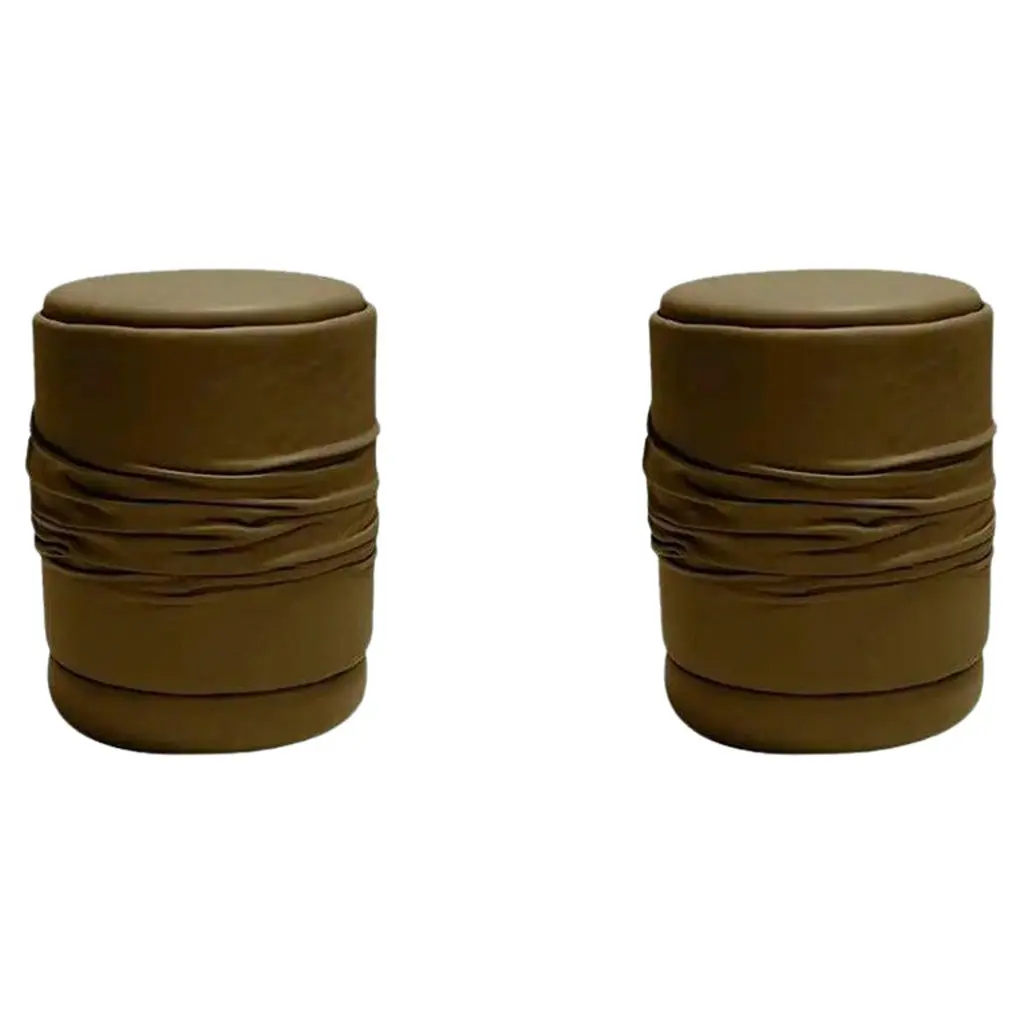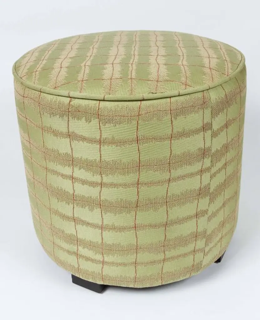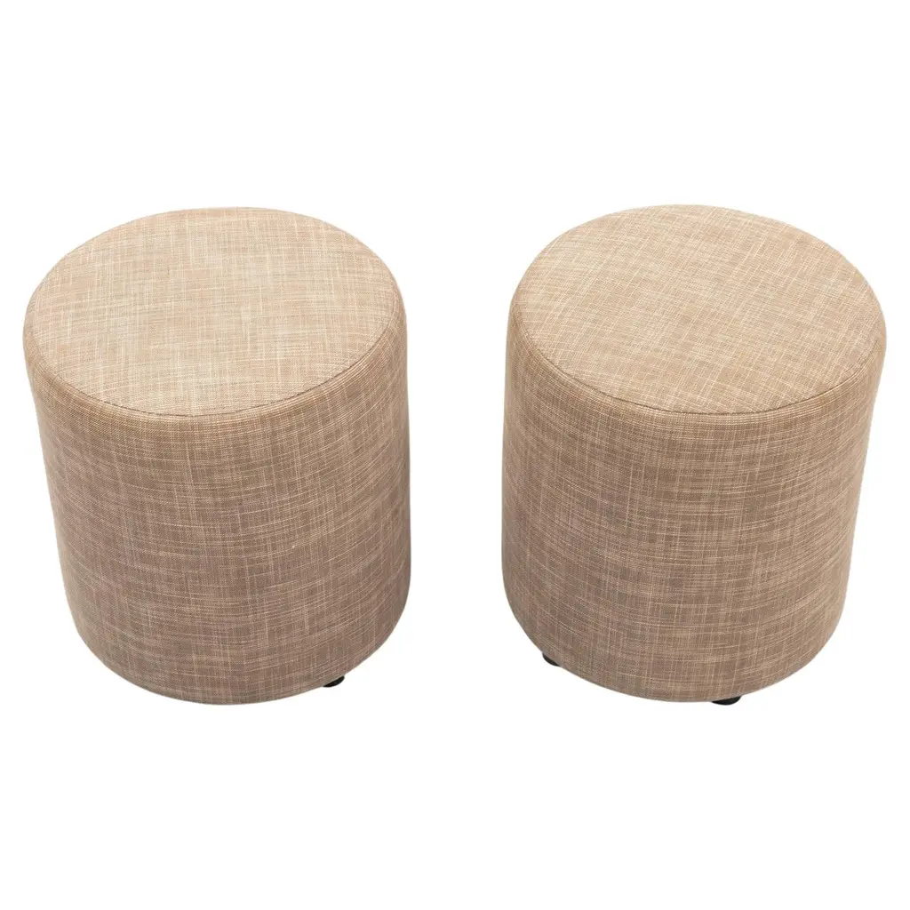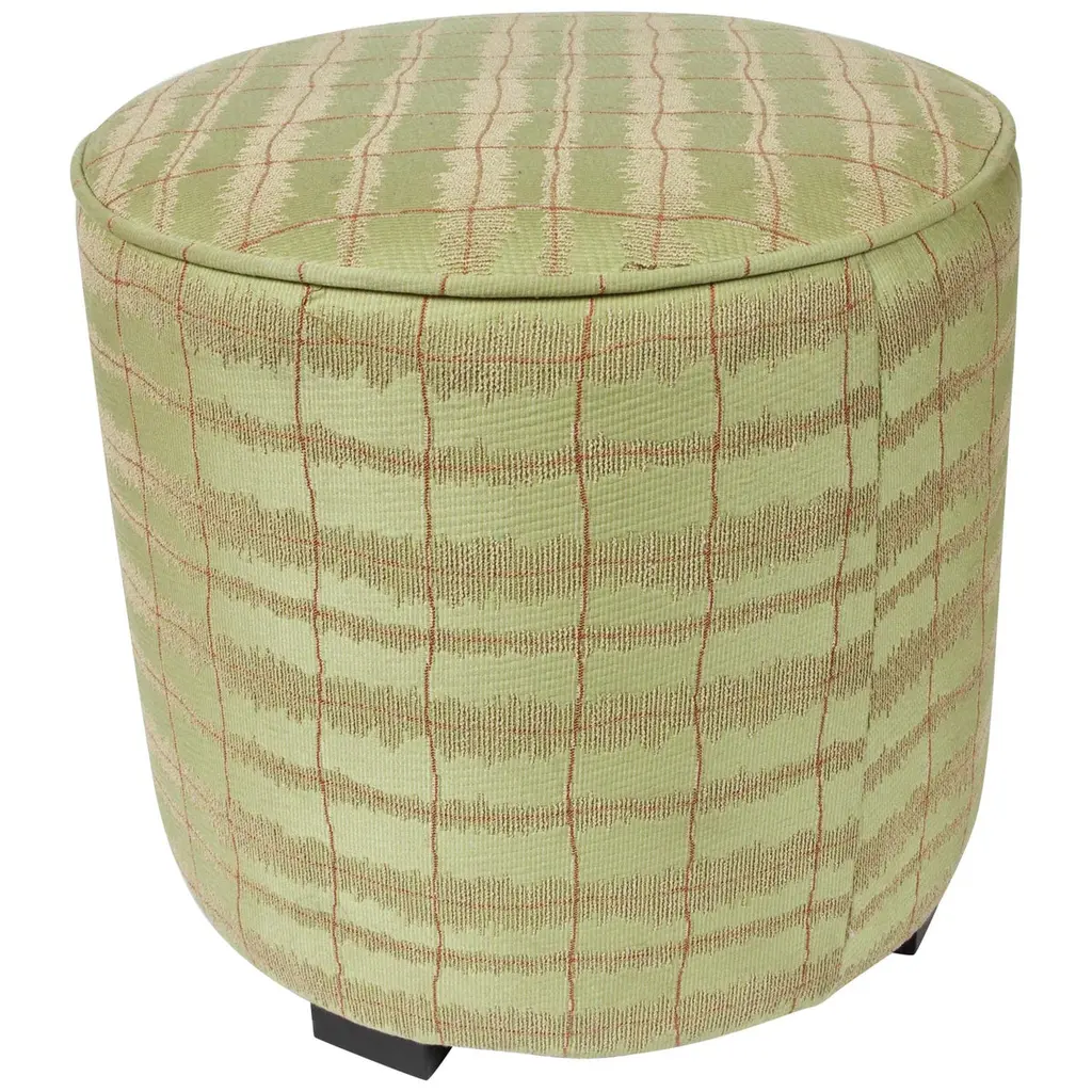 Pair of Art Deco Style jade green and gold Moroccan style stools. Pair of modern Contemporary round Moroccan Moorish style stool in lime green fabric upholstery in 1970s style. Art Deco Style little pouf hassock, upholstered footstool or modern circular ottoman. This versatile Arabian accent piece, pouf is designed primarily for seating but can be used as both seating and as a pull up table.Multiple upholstered stools available, great to use in a Middle Eastern restaurant, for a Moroccan party as extra seats, or for kids room as they are very light to carry around. Please call us if you need more than two. We have more available.Art Deco Style, Hollywood Regency or Moroccan style pouf in Maison Jansen or Jean Royere style. Measures: Size is 18 inches diameter x 17 inches height. The weight 10 lbs each.
